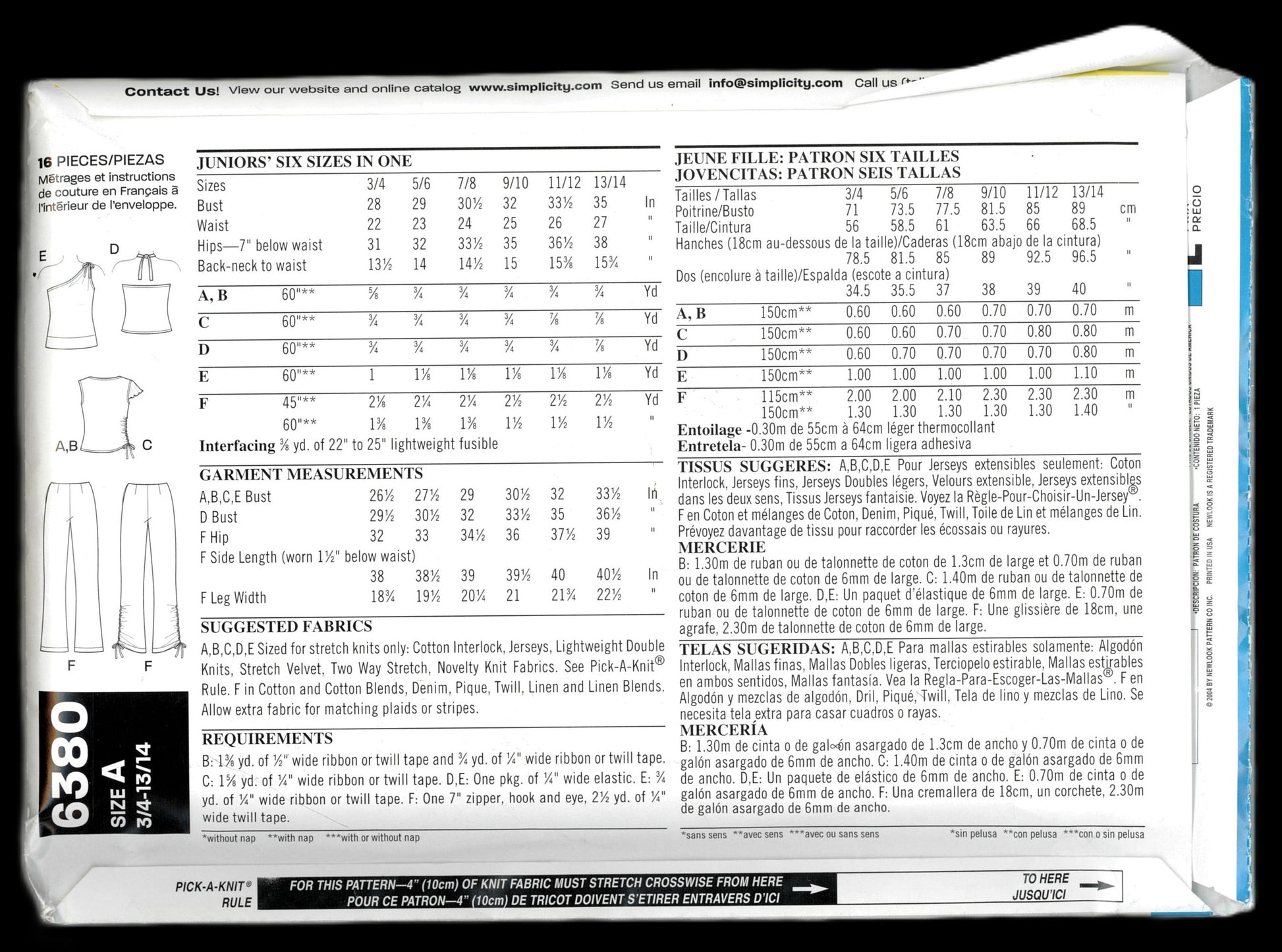 New Look 6380 Junior Teens Knit Top and Pants Sewing Pattern UNCUT Size 3/4 - 13/14