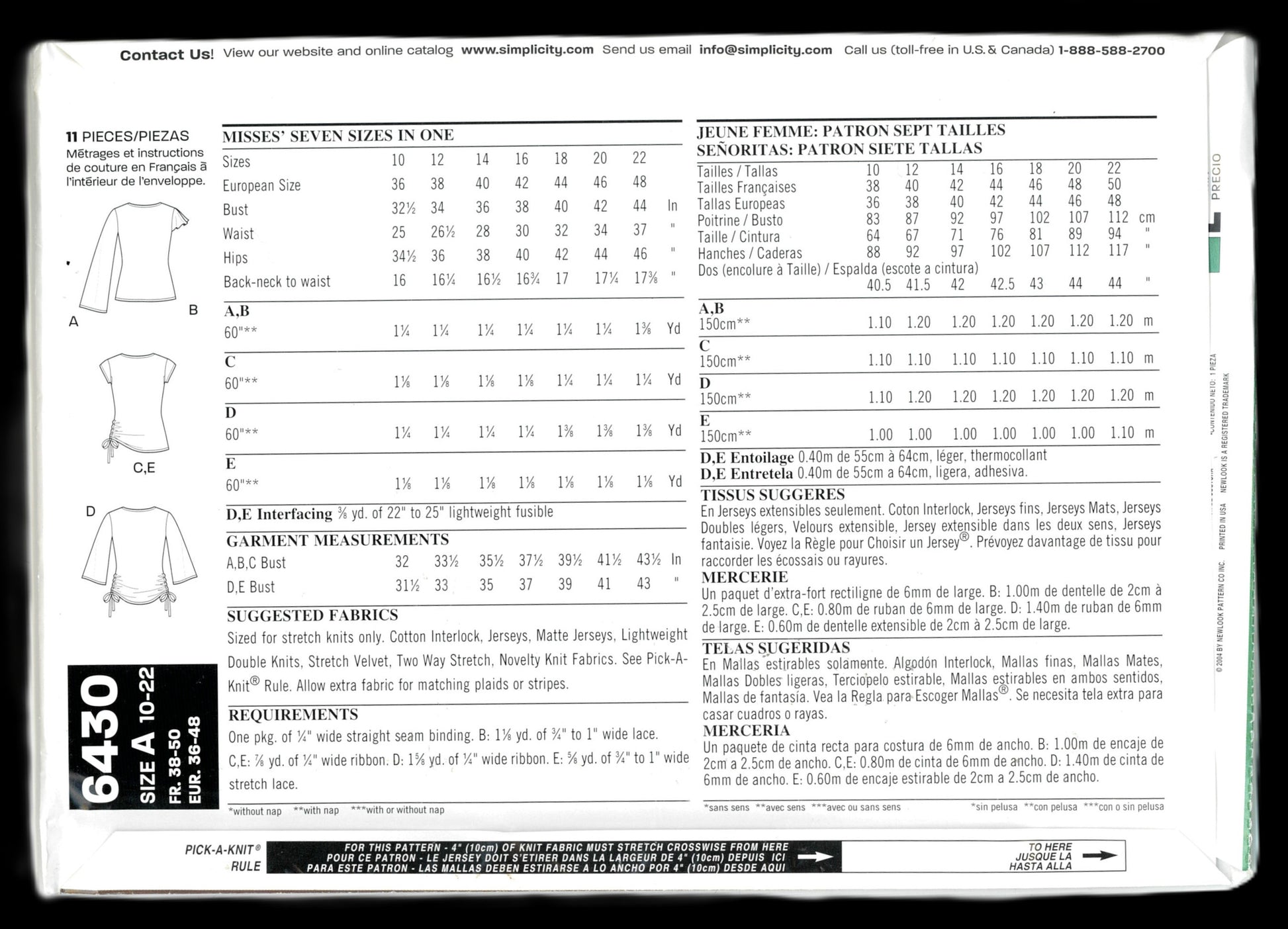 New Look 6430 Misses Knit Tops Sewing Pattern UNCUT - Size 10 - 22