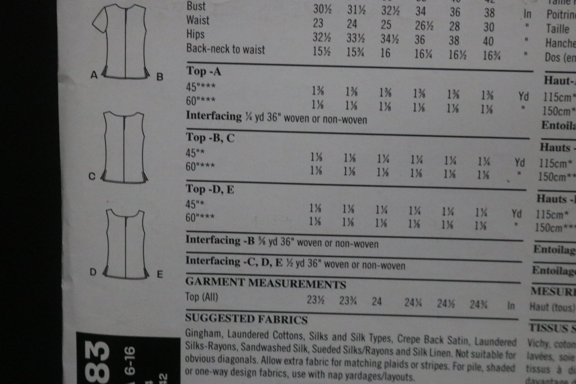 Misses' tops with tank, short sleeve and sleeveless variations. Easy 1-hour sewing time.
