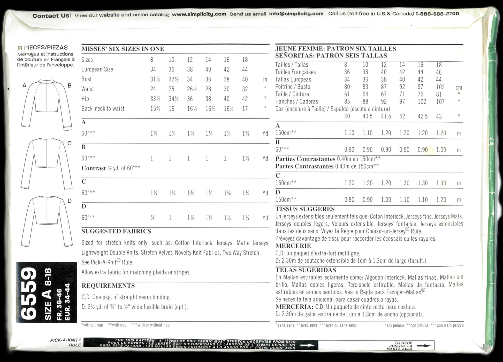 New Look 6559 Misses Knit Bolero Jacket Sewing Pattern UNCUT Size 8 - 18