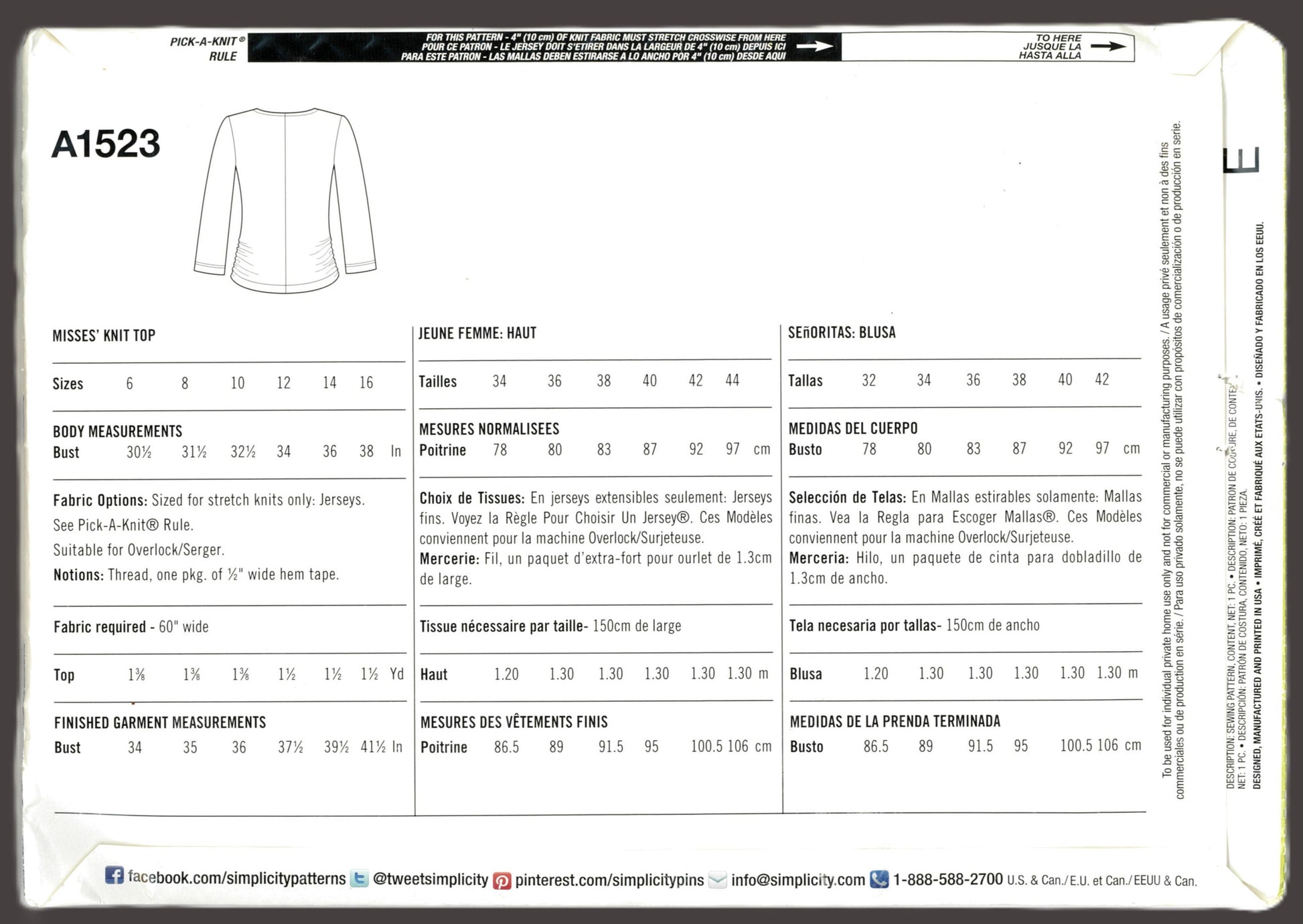 Simplicity 1523 Misses Knit Top Sewing Pattern
