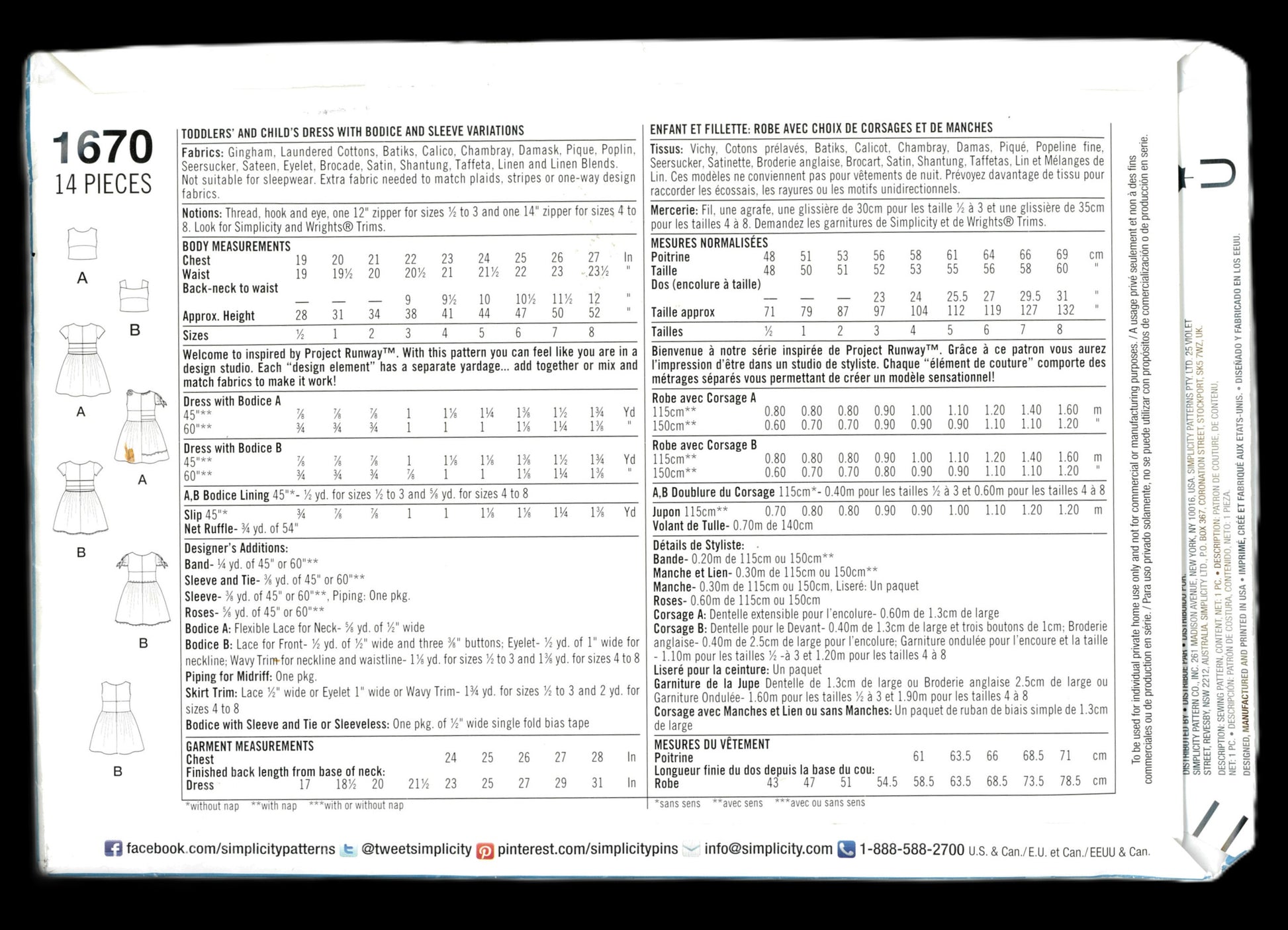 Simplicity 1670 Girls Dress with Bodice and Sleeve Variations Sewing Pattern