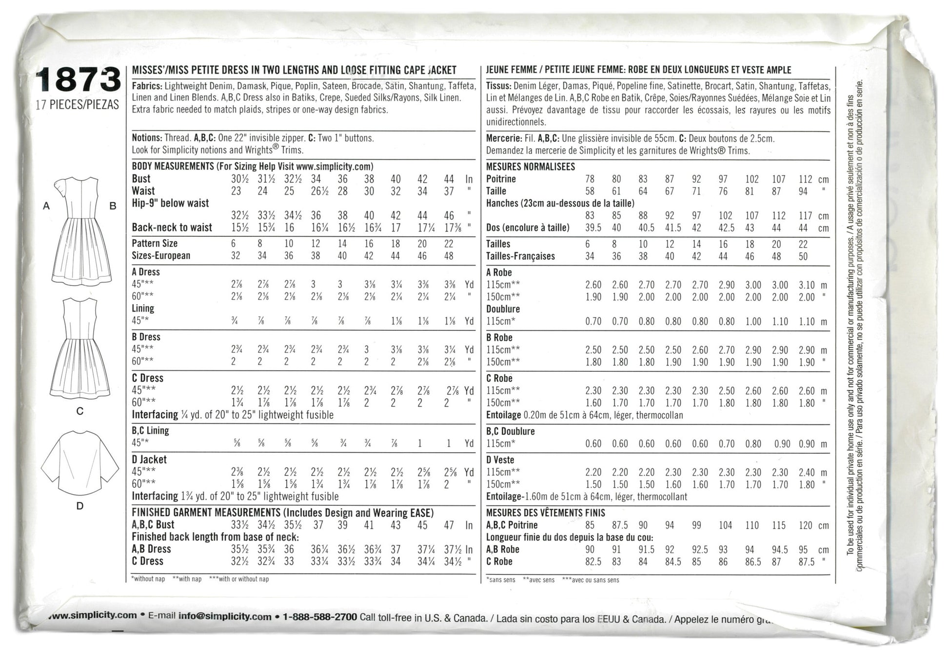 Simplicity 1873 Cynthia Rowley Misses / Miss Petite Dress in Two Lengths and Loose Fitting Cape Jacket Sewing Pattern UNCUT Size 14 16 18 20 22