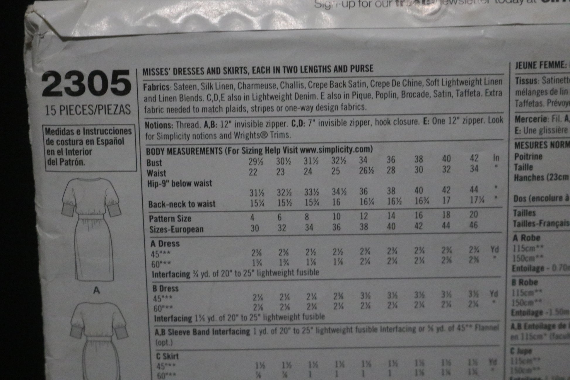 Simplicity 2305 Cynthia Rowley Misses Dresses and Skirts, Each in Two Lengths and Purse Sewing Pattern UNCUT Size 4 6 8 10 12