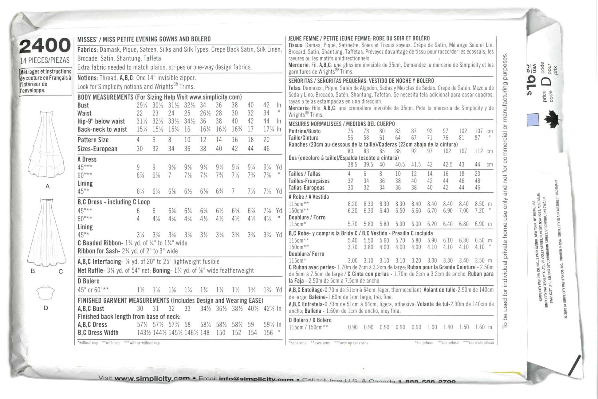 Simplicity 2400 Jessica McClintock Misses / Miss Petite Evening Gowns and Bolero Sewing Pattern - UNCUT - Size 4 6 8 10 12