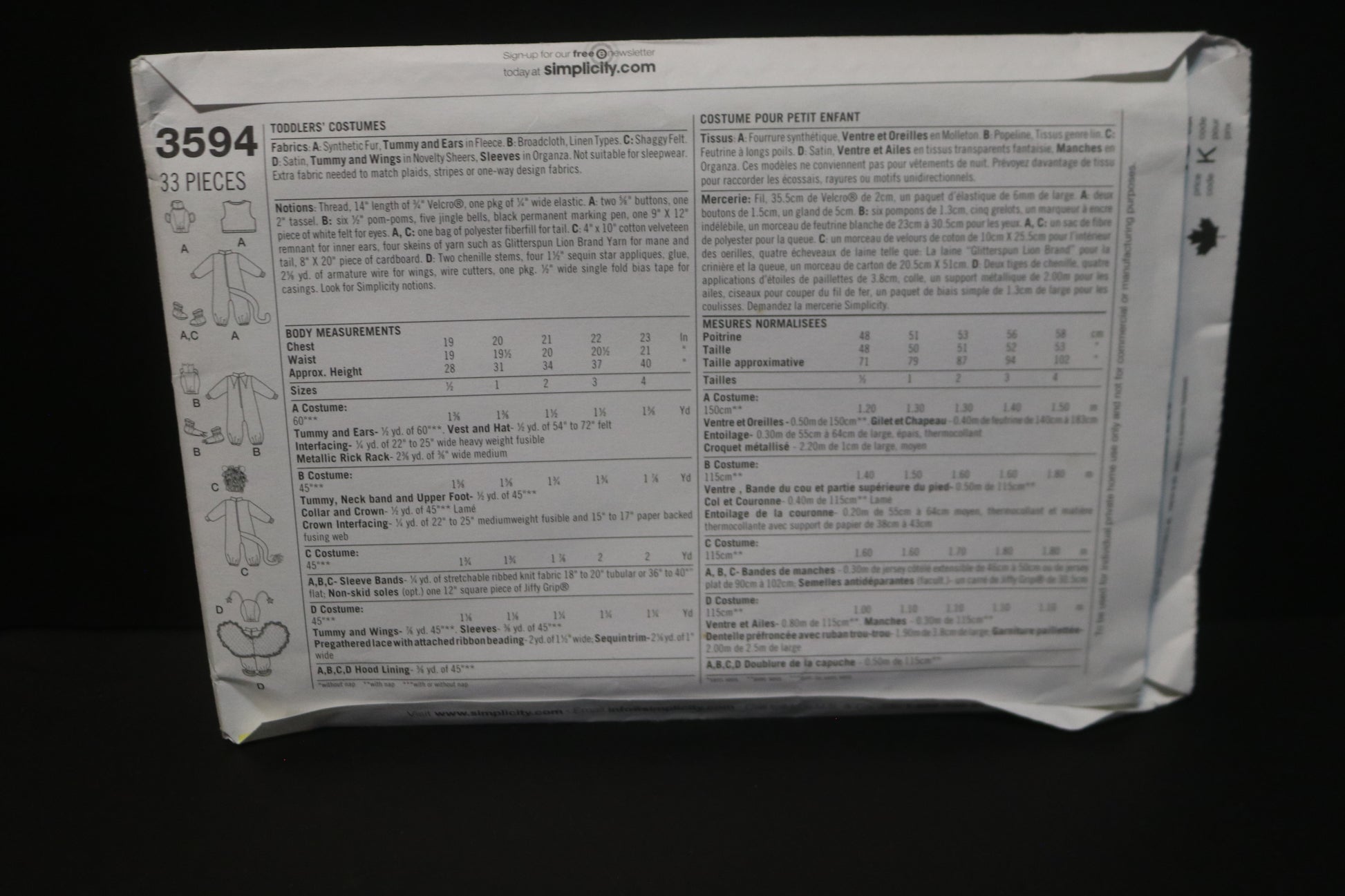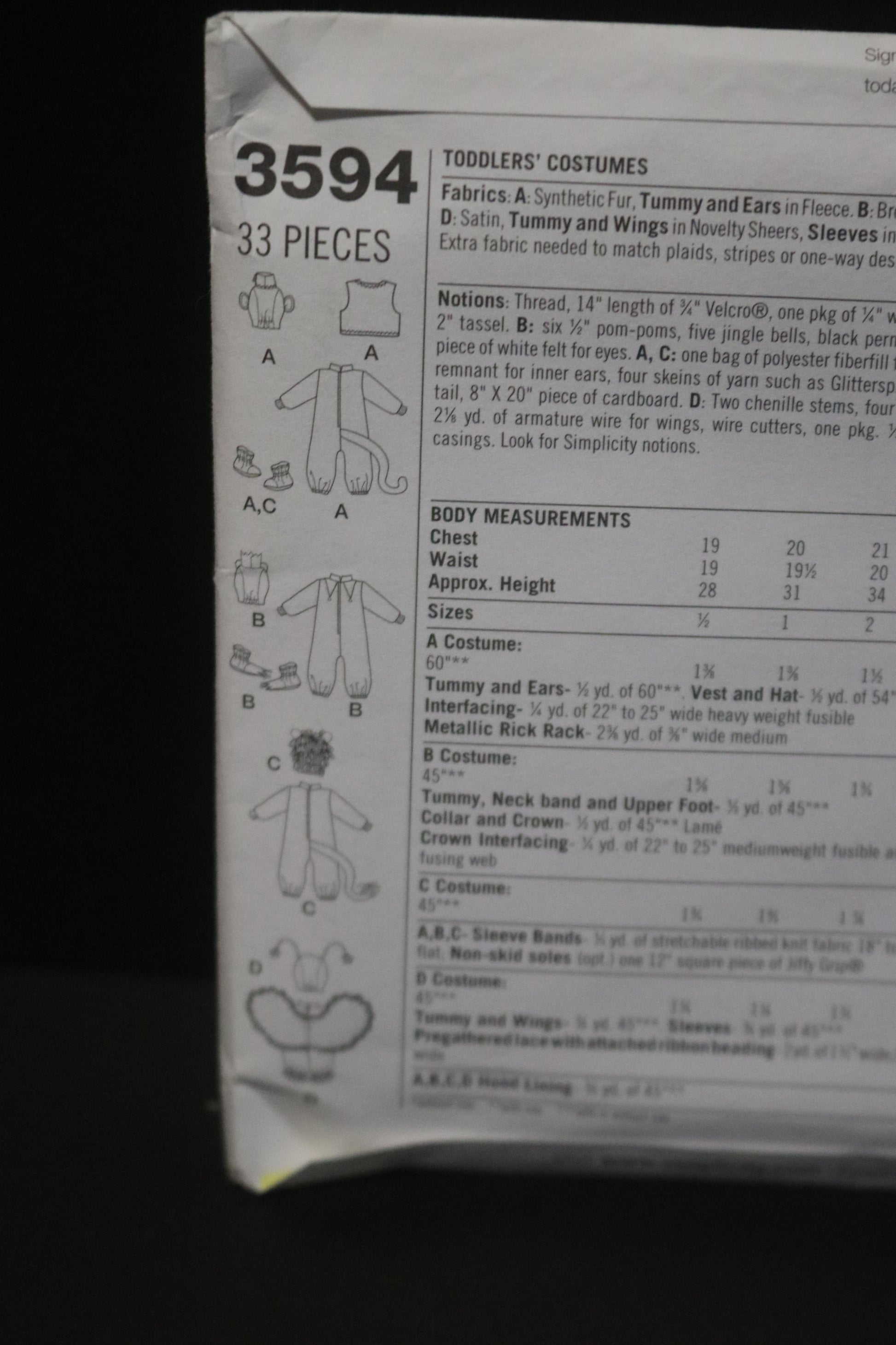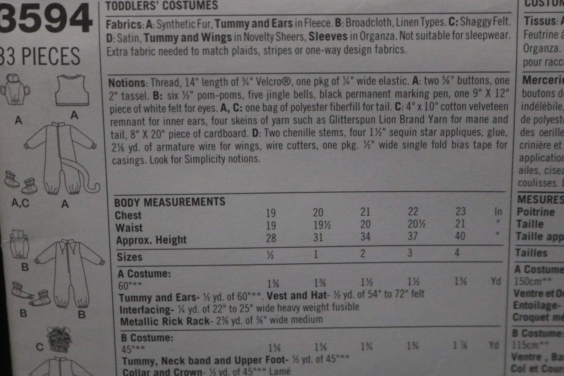 Simplicity 3594 Toddlers Monkey, Fairy, Frog, and Lion Costumes Sewing Pattern - UNCUT - Size 1/2 1 2 3 4