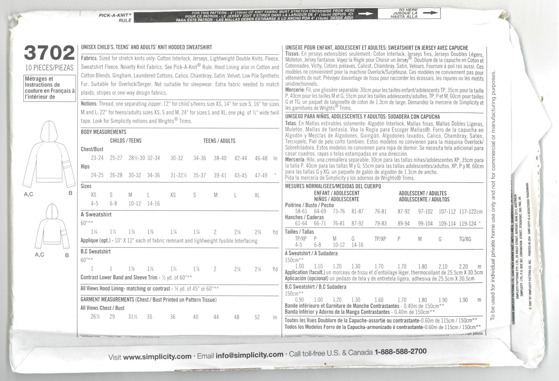 Simplicity 3702 Unisex Child's Teens and Adults Knit Hooded Sweatshirt Sewing Pattern UNCUT Childs Size XS S M L Adults XS S M L XL