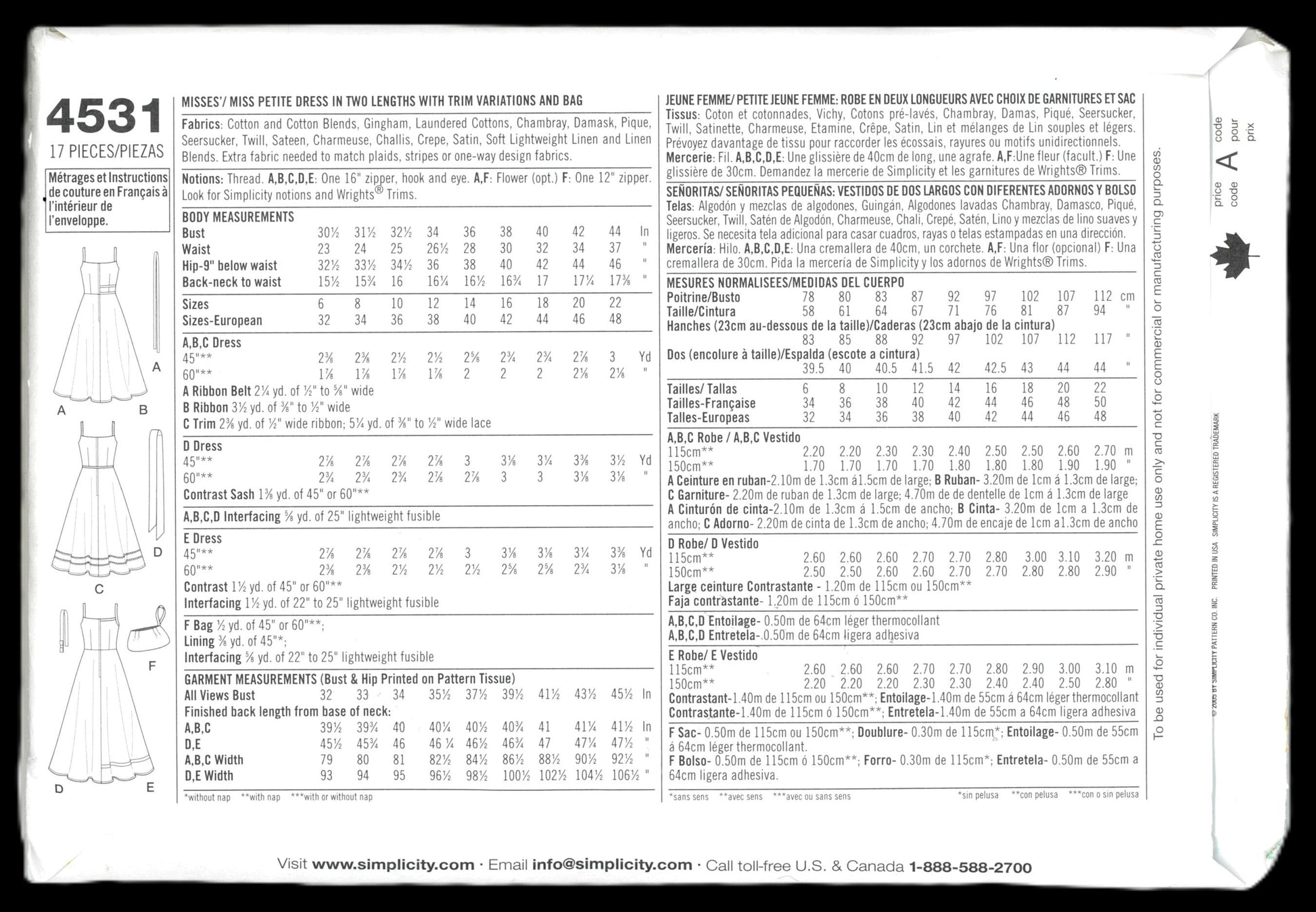 Simplicity 4531 Misses / Miss Petite Dress in Two Lengths with Trim Variations and Bag Sewing Pattern