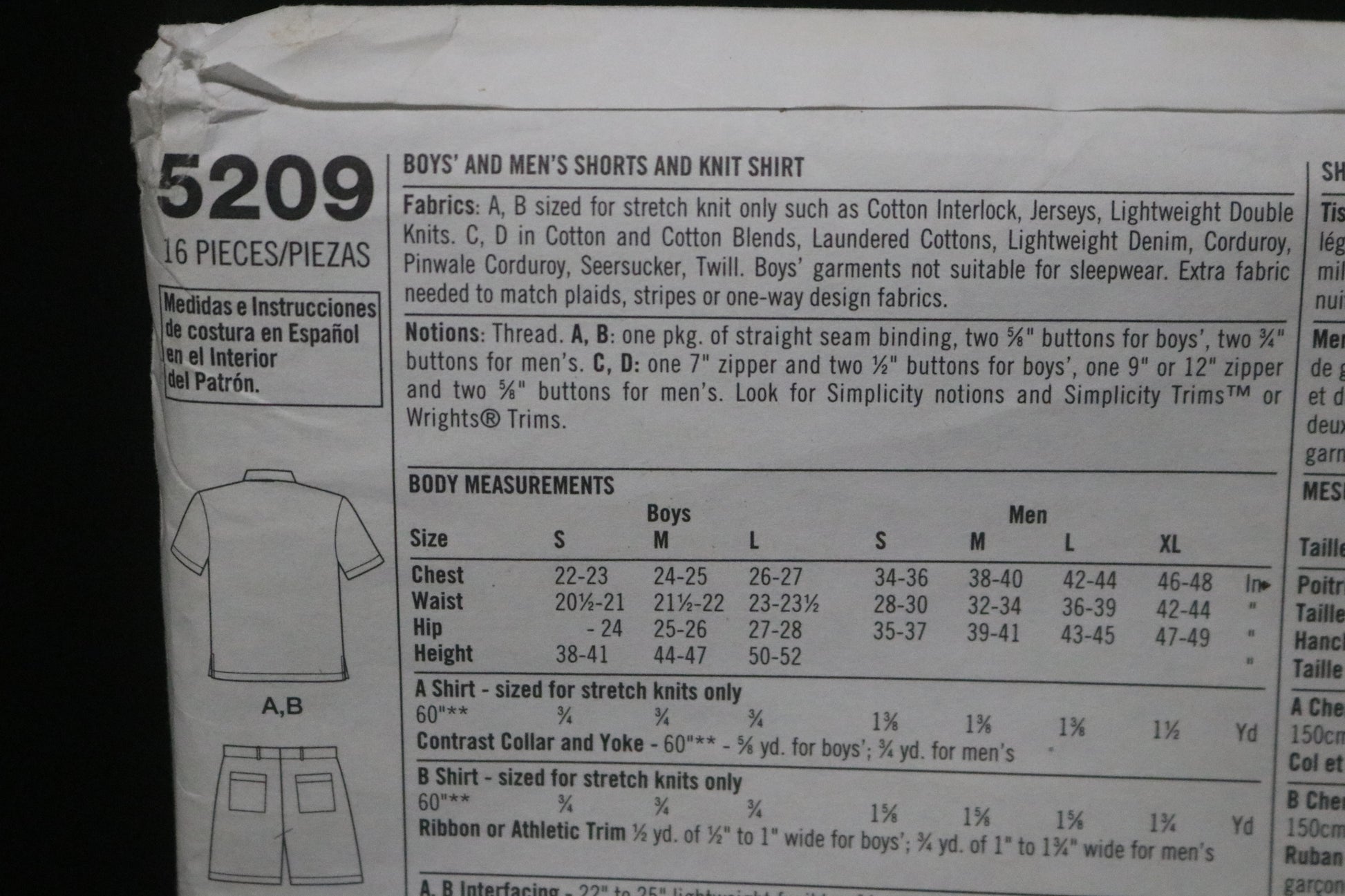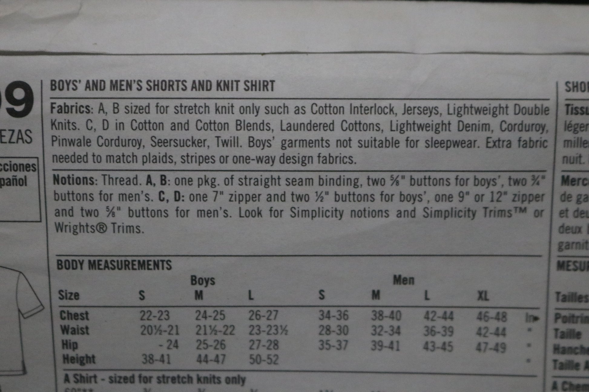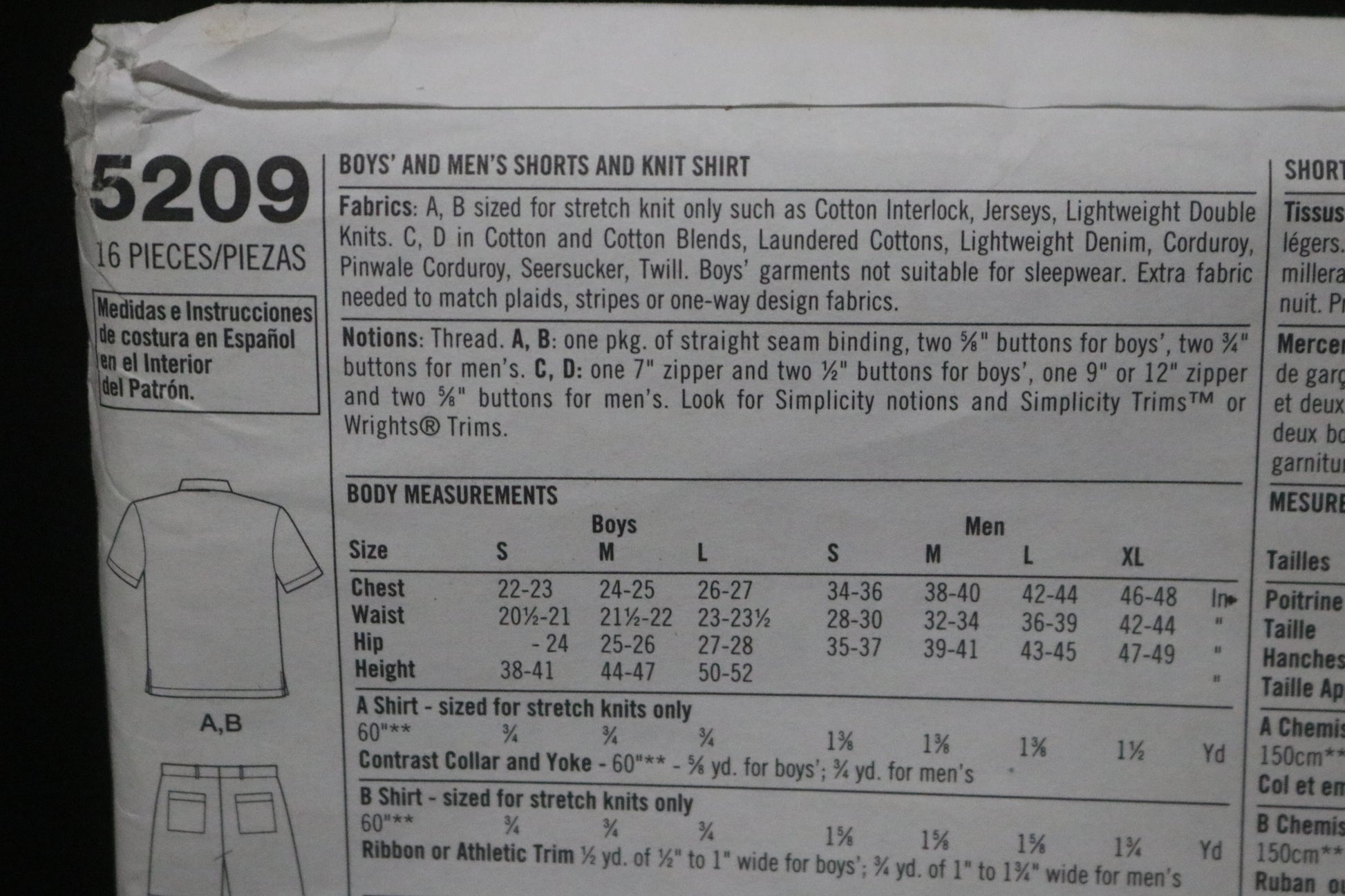 Simplicity 5209 Boys and Men's Shorts and Knit Shirt Sewing Pattern UNCUT Boys Size S M L Mens Size S M L XL