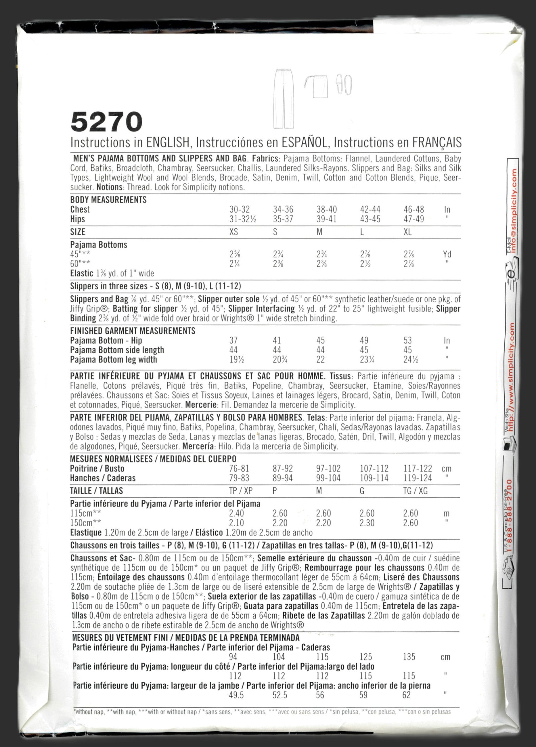 Simplicity 5270 Mens Pajamas Botoms and Slippers and Bag Sewing Pattern