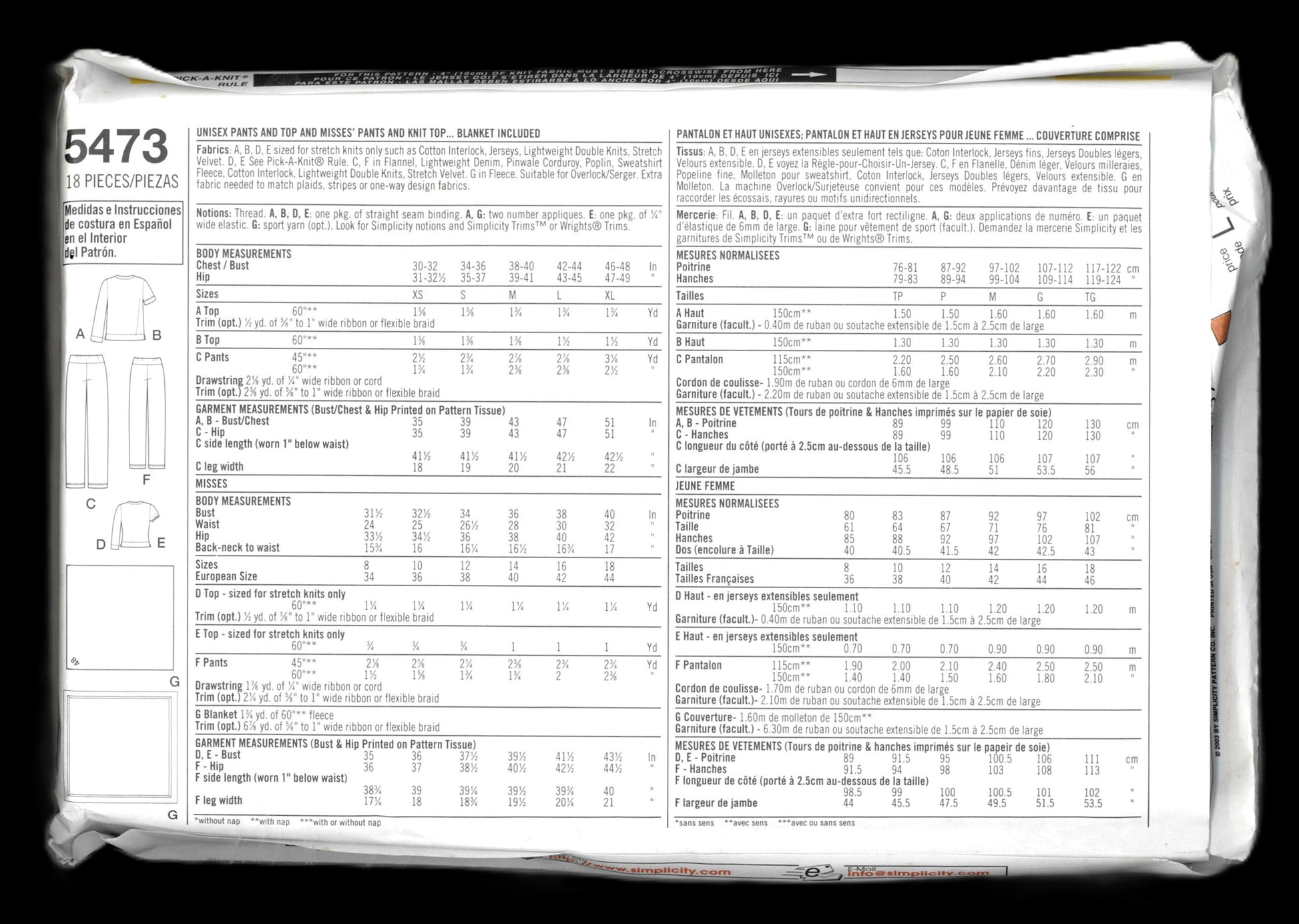 Simplicity 5473 Unisex Pants and Top and Misses Pants and Knit Top...Blanket Included. Sewing Pattern