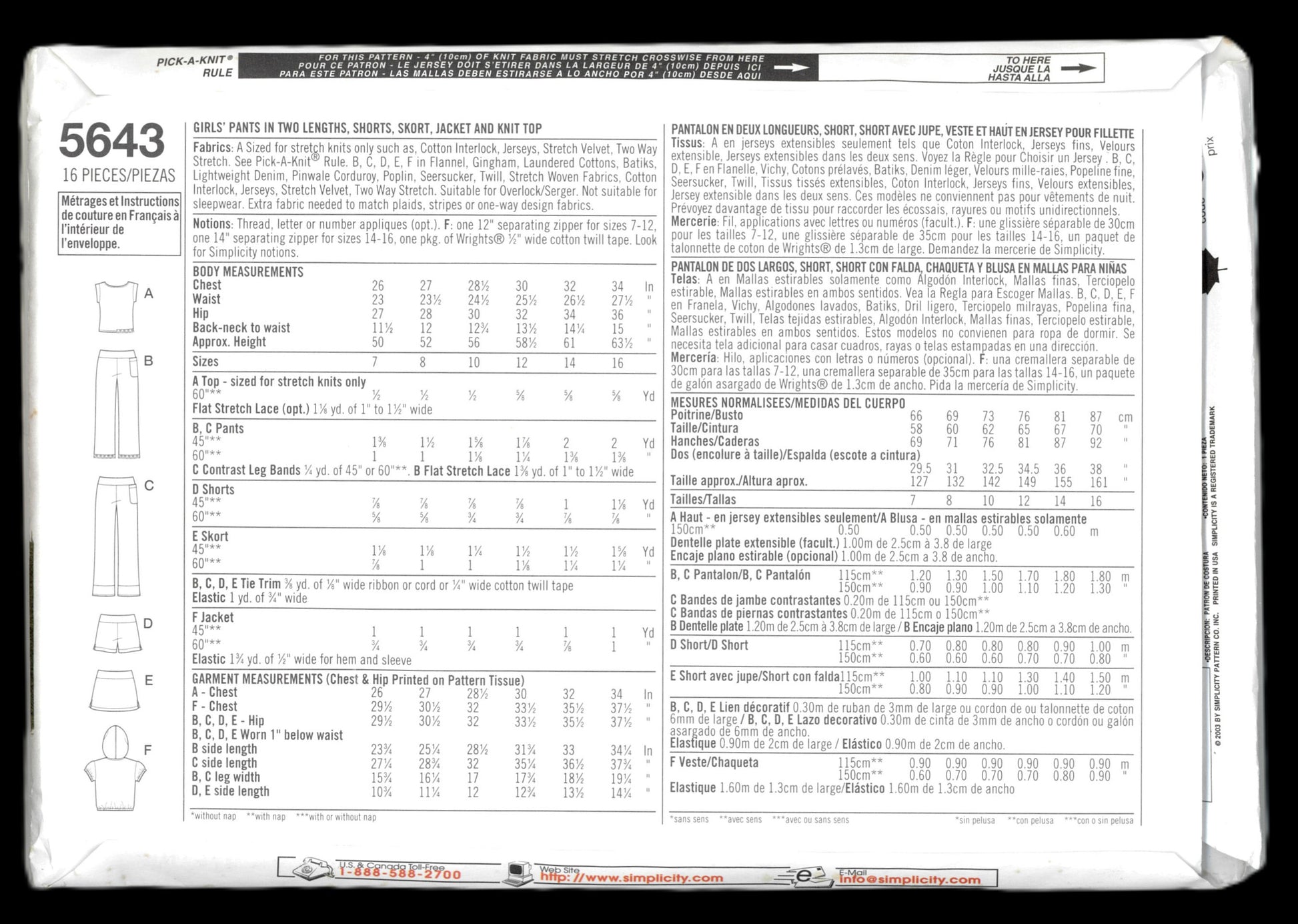 Simplicity 5643 Girls Pants in Two Lengths, Shorts, Skirt, Jacket and Knit Top Sewing Pattern