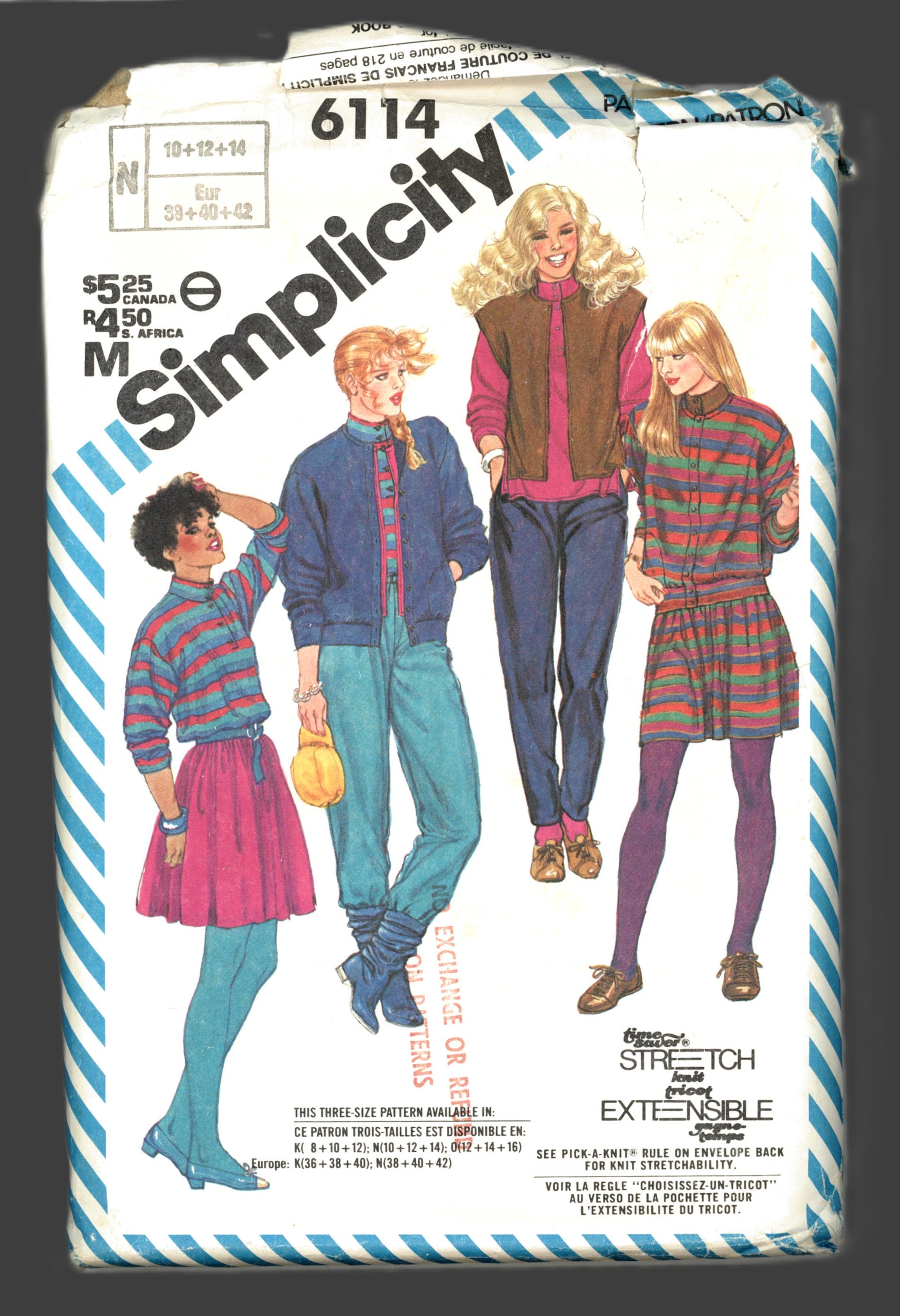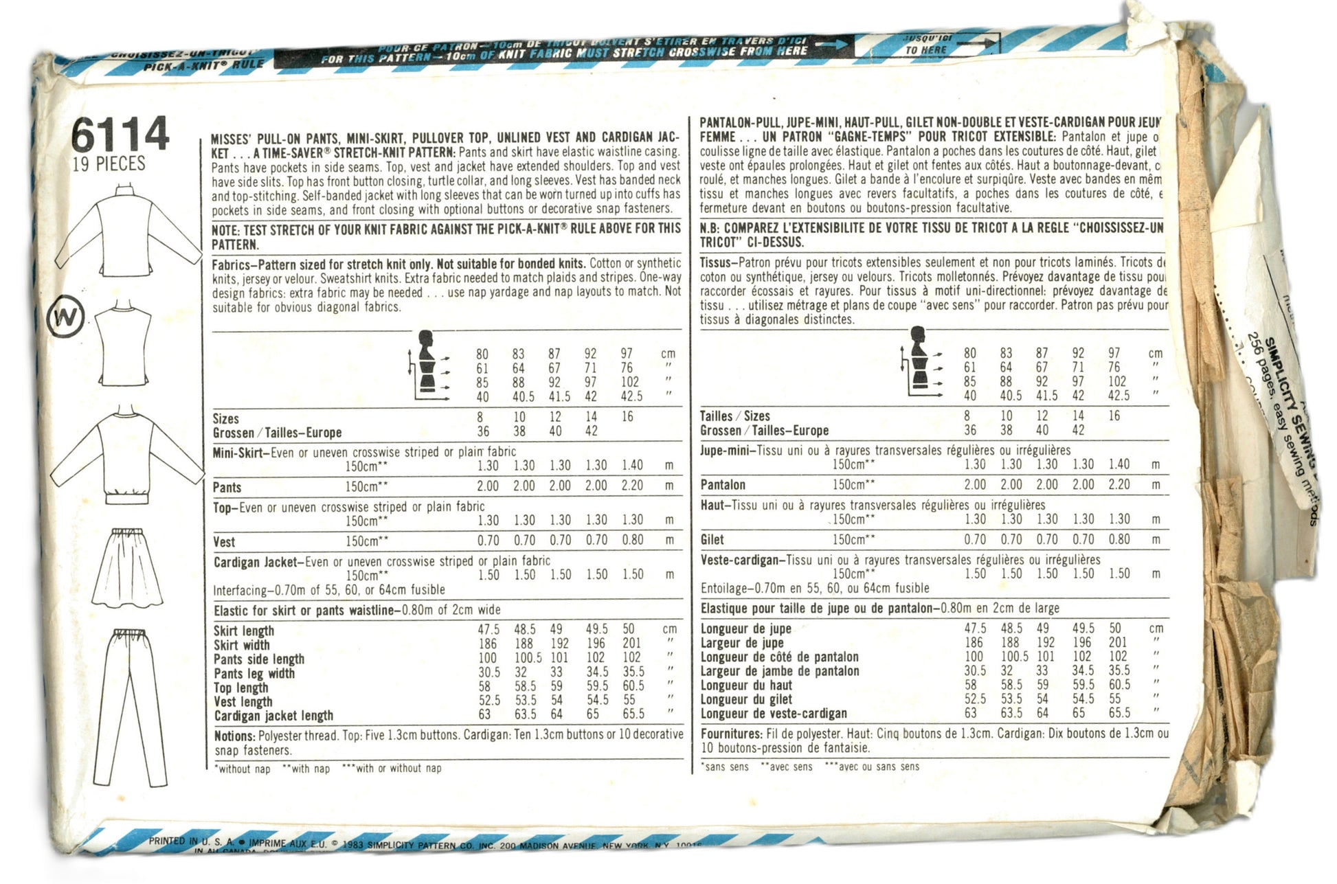 a Time-Saver Stretch-Knit Pattern: Pants and skirt have elastic waistline casing. Pants have pockets in side seams. Top, vest and jacket have extended shoulders. Top and vest have side slits. Top has front button closing, turtle collar, and long sleeves. Vest has banded neck and top-stitching. Self-banded jacket with long sleeves that can be worn turned up into the cuffs has pockets in side seam, and front closing with optional buttons or decorative snap fasteners.