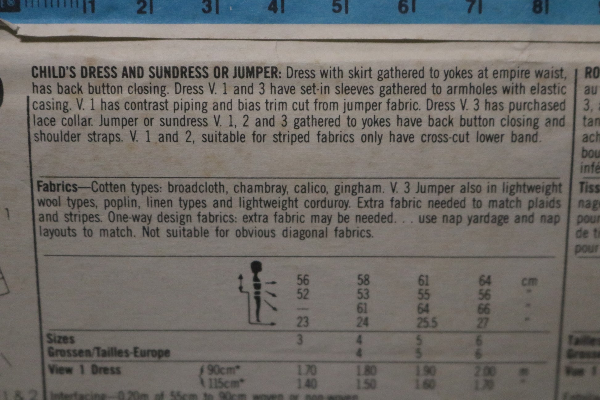Dress with skirt gathered to yokes at empire waist, has back button closing. Dress V. 1 and 3 have set-in sleeves gathered to armholes with elastic casing. V. 1 has contrast piping and bias trim cut from jumper fabric. Dress V. 3 has purchased lace collar. Jumper or sundress V. 1, 2 and 3 gathered to yokes have back button closing and shoulder straps. V. 1 and 2, suitable for striped fabrics only have cross-cut lower band.