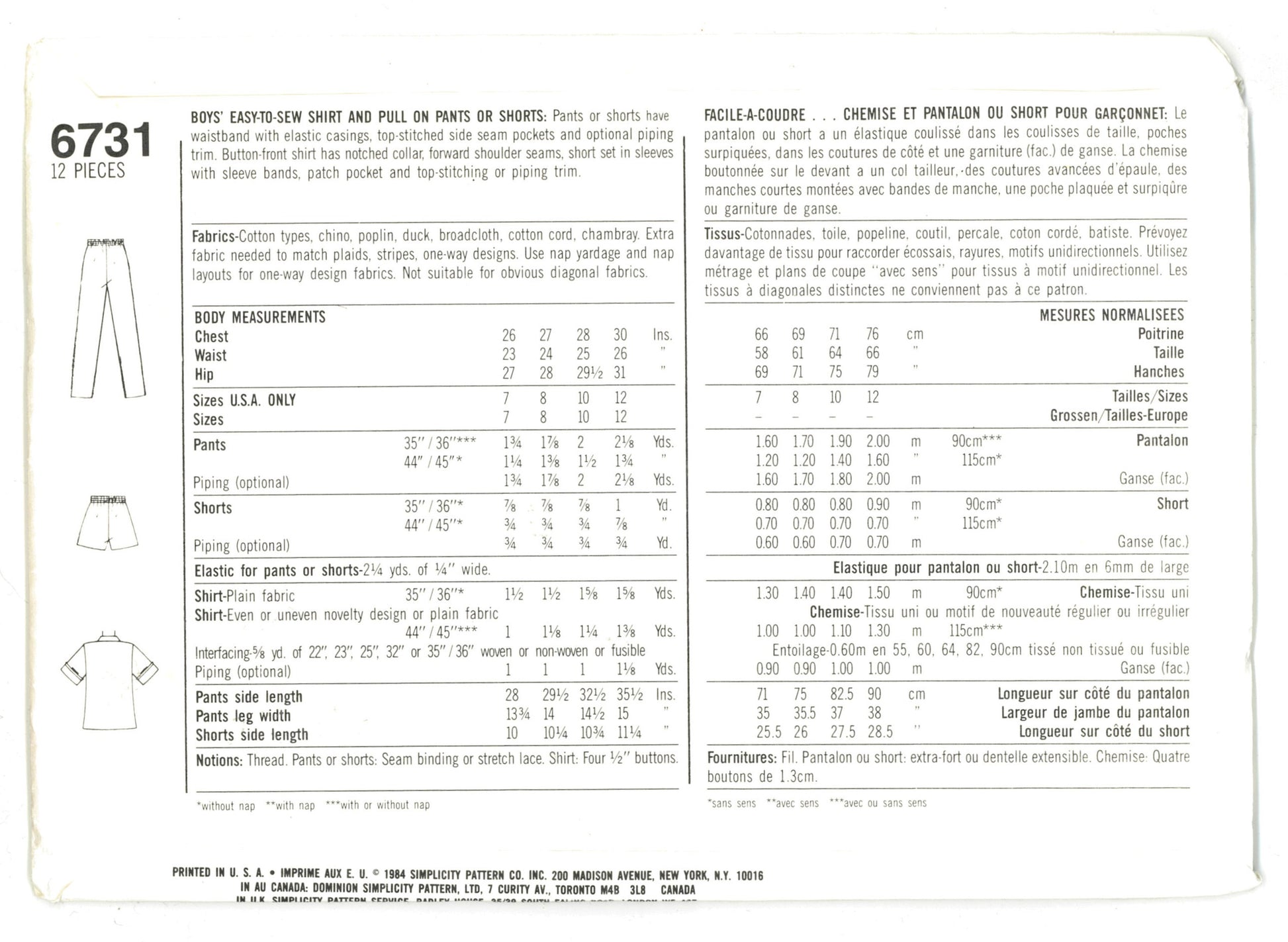 SImplicity 6731 Boys Easy to Sew Shirt and Pull on Pants or Shorts Sewing Pattern - UNCUT - Size 10