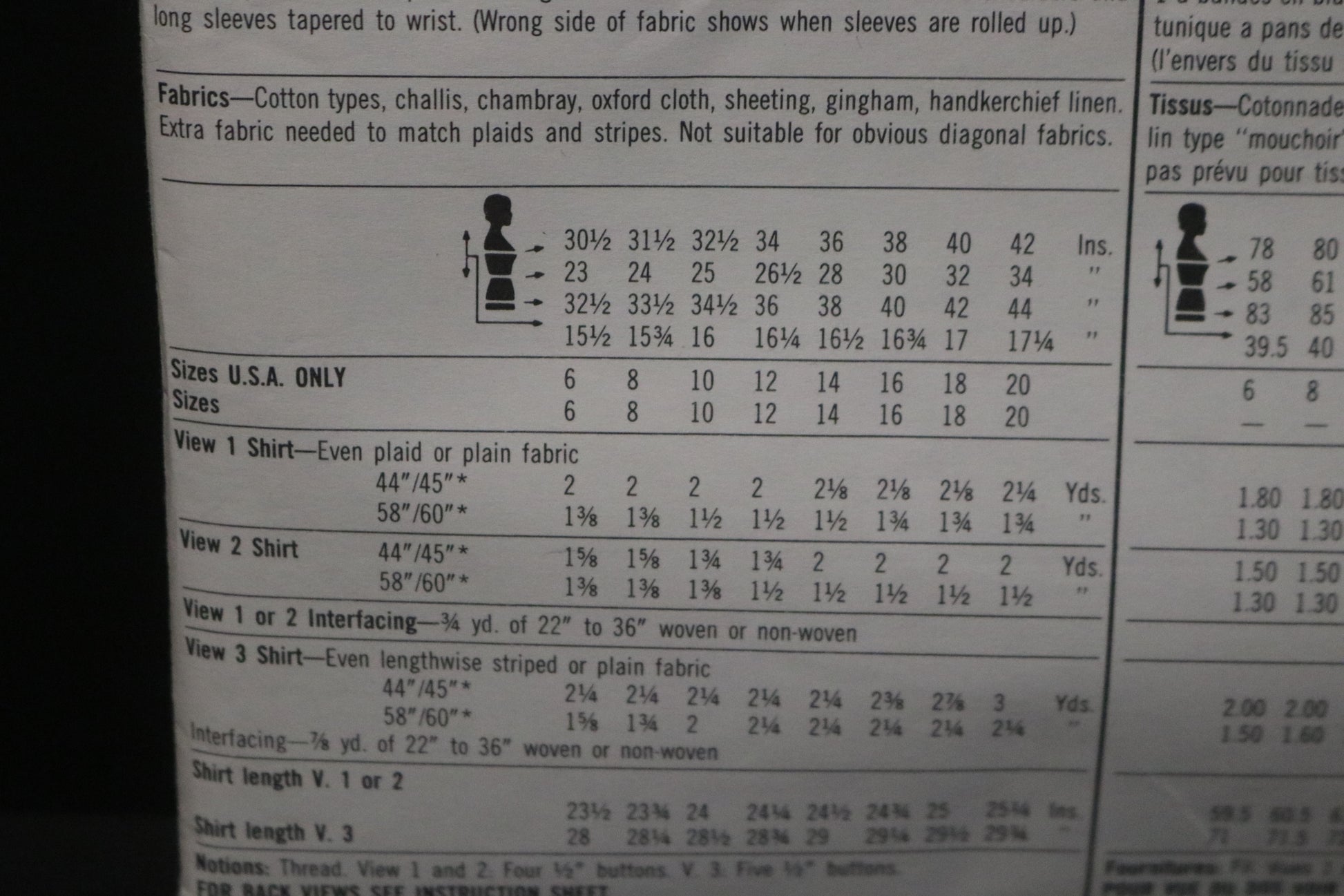 Top stitched shirt gathered to yoke has front button closing and notched collar. V1 has bias bands on pocket and sleeves. V2 has pockets and flaps. Tunic length V3 with shirt tail hem has extended shoulders and long sleeves tapered to wrist.