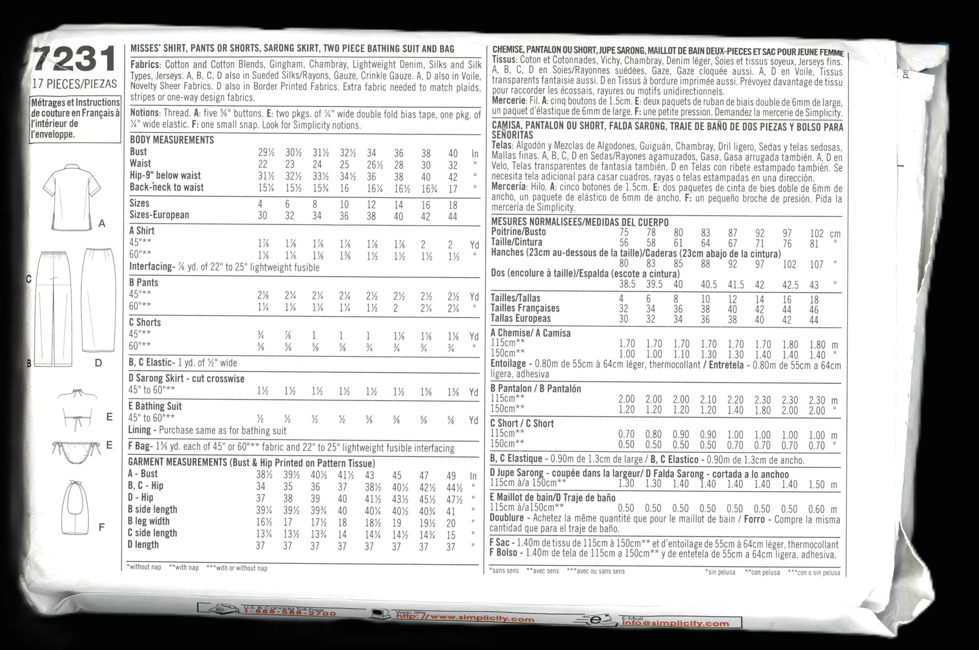 Simplicity 7231 Misses Shirt, Pants or Shorts, Sarong Skirt, Two Piece Bathing Suit and Bag Sewing Pattern