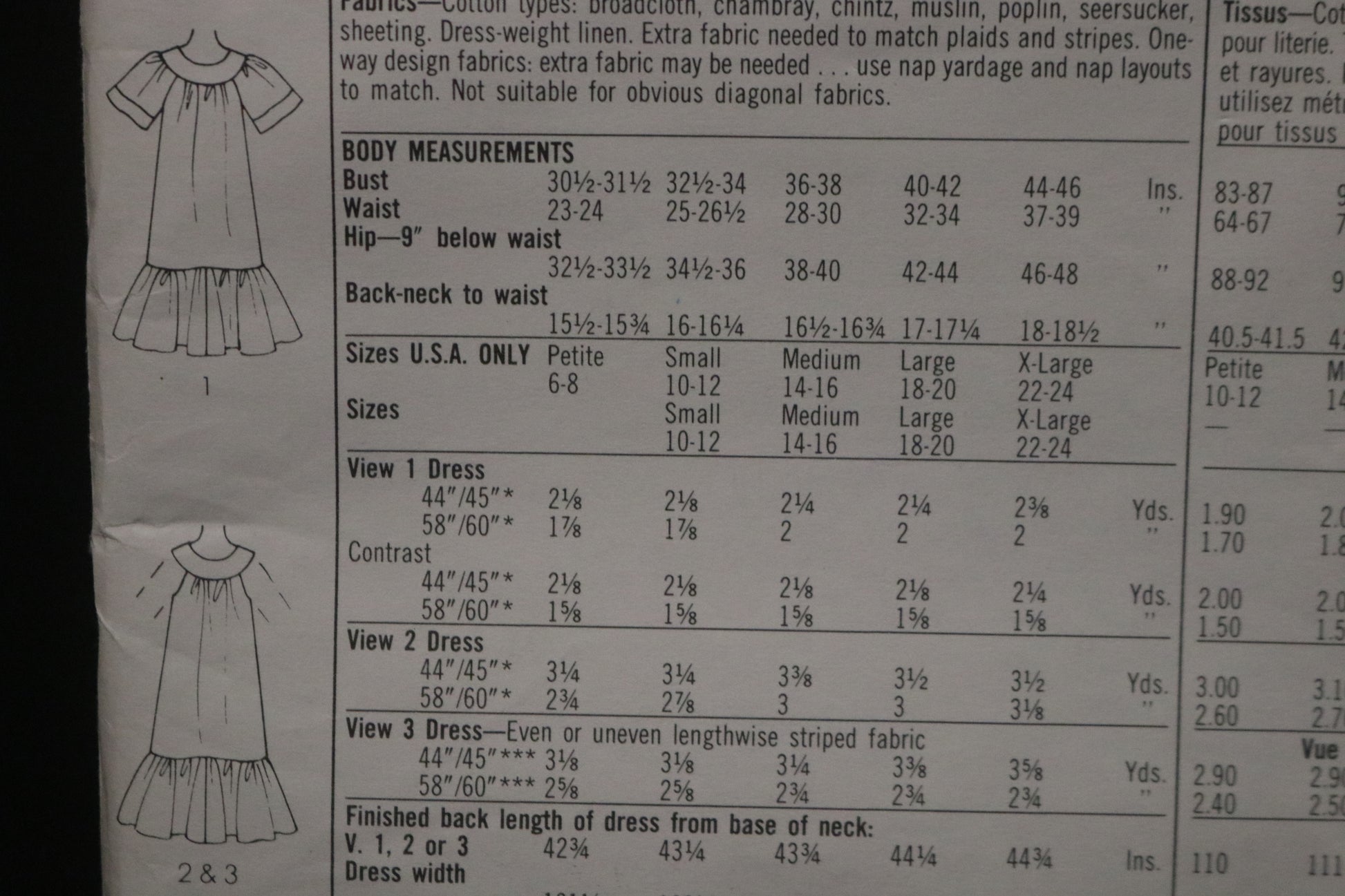 Loose fitting dress gathered to front and back shaped yokes has lower ruffle, side seam pockets and tie belt. V.1 with short sleeves has contrasting yoke, sleeve bands and ruffle. V 1 and 2 has bias tape.