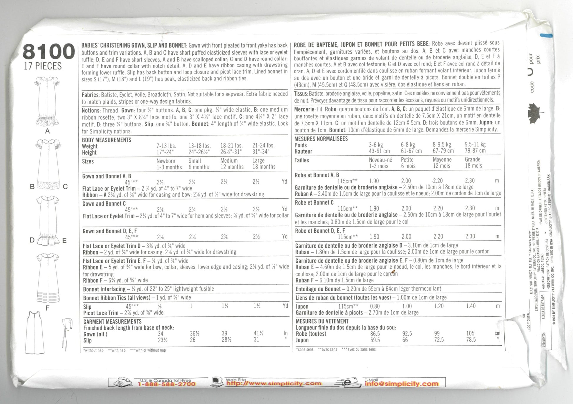 Simplicity 8100 Babies Christening Gown, Slip and Bonnet Sewing Pattern