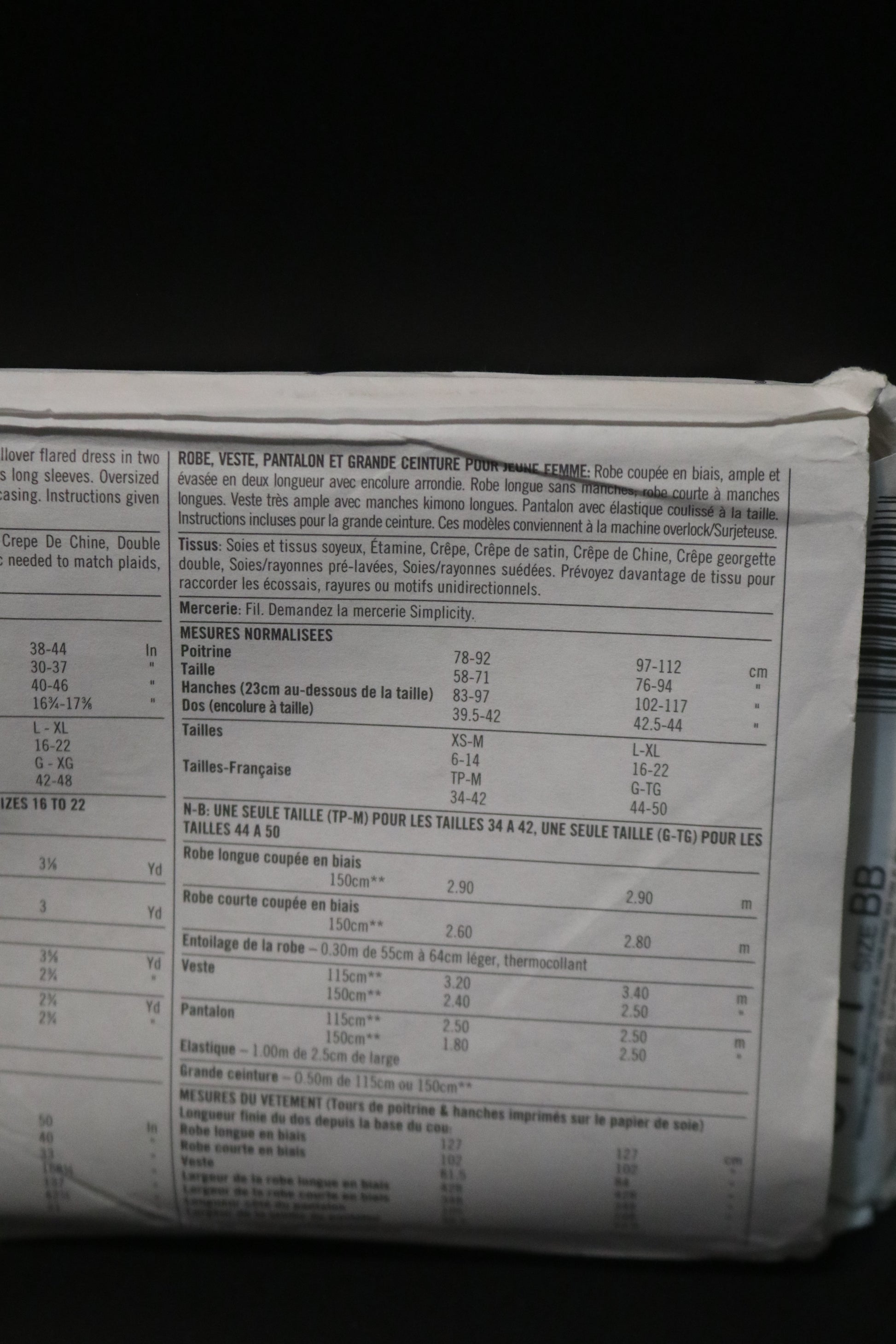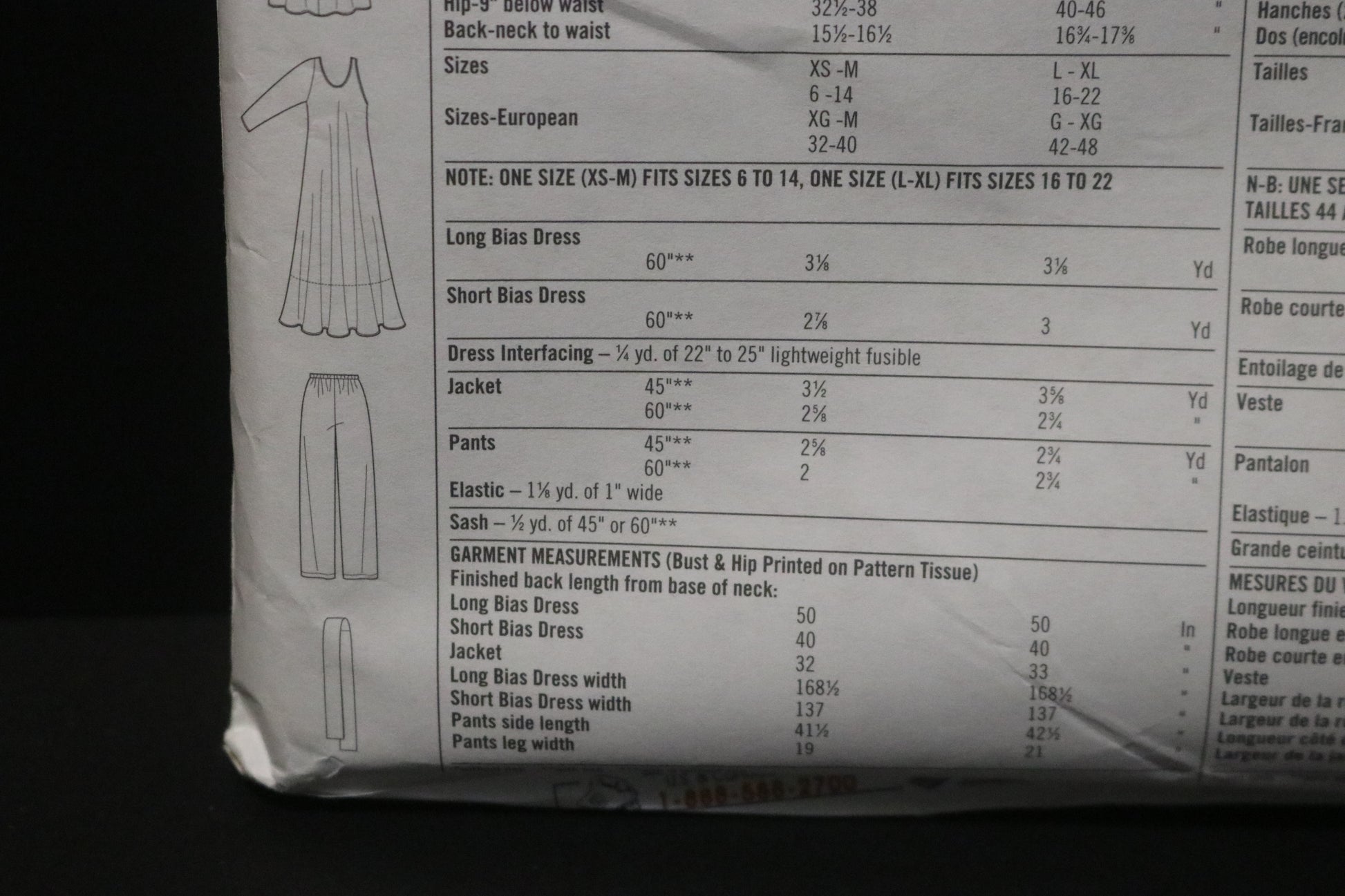 Bias cut loose fitting pullover flared dress in two lengths has scoop neckline. Long dress is sleeveless, short dress has long sleeves. Oversized jacket has long kimono sleeves. Pull on pants have eladtic waistline casing. Instructions given for sash, suitable for Overlock / Serger,