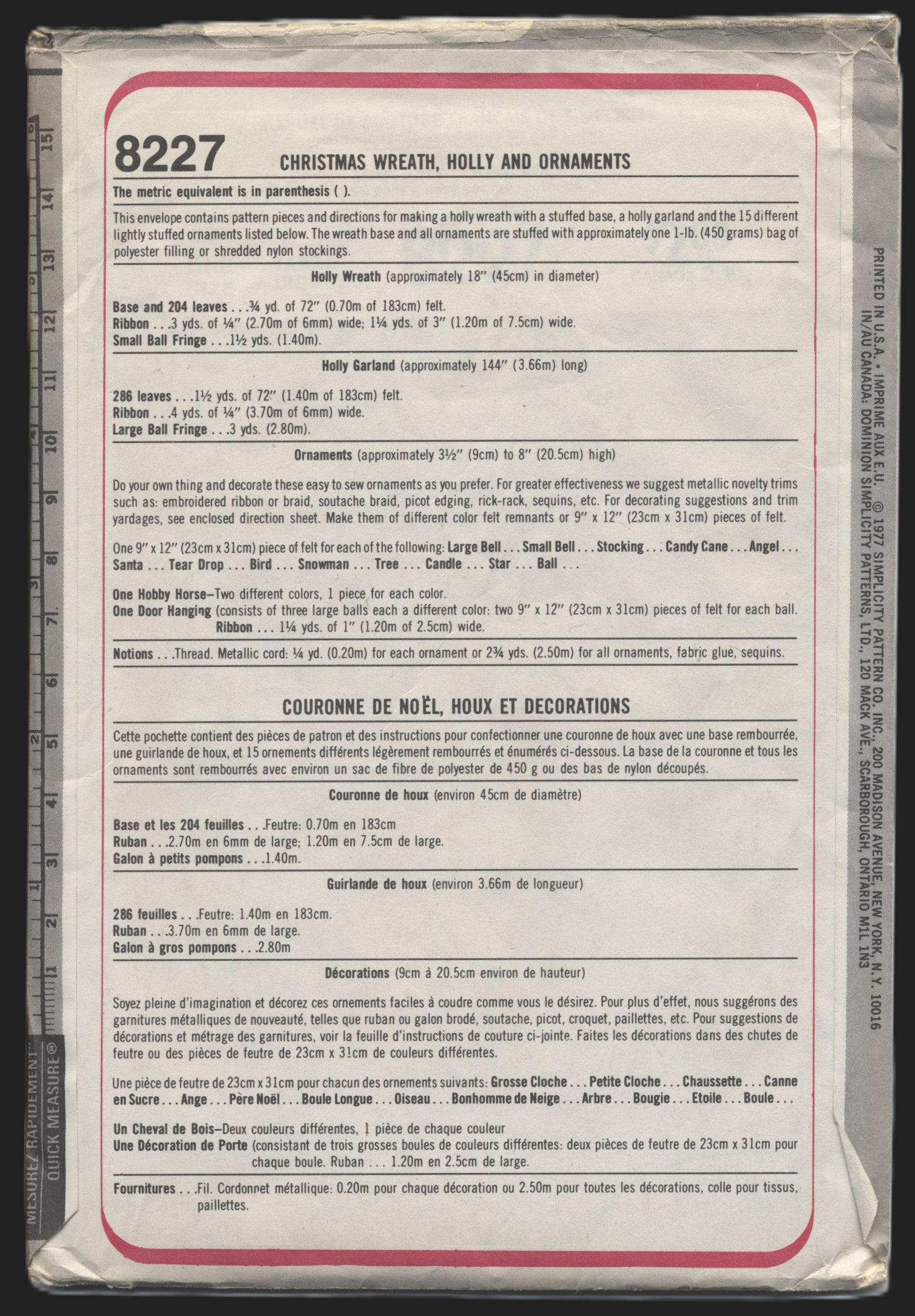 This envelope contains pattern pieces and directions for making a holly wreath with a stuffed base, a holly garland and the 15 different lightly stuffed ornaments listed below. The wreath base and all ornaments are stuffed with approximately one 1-lb (450g) bag of polyester filling or shredded nylon stockings.