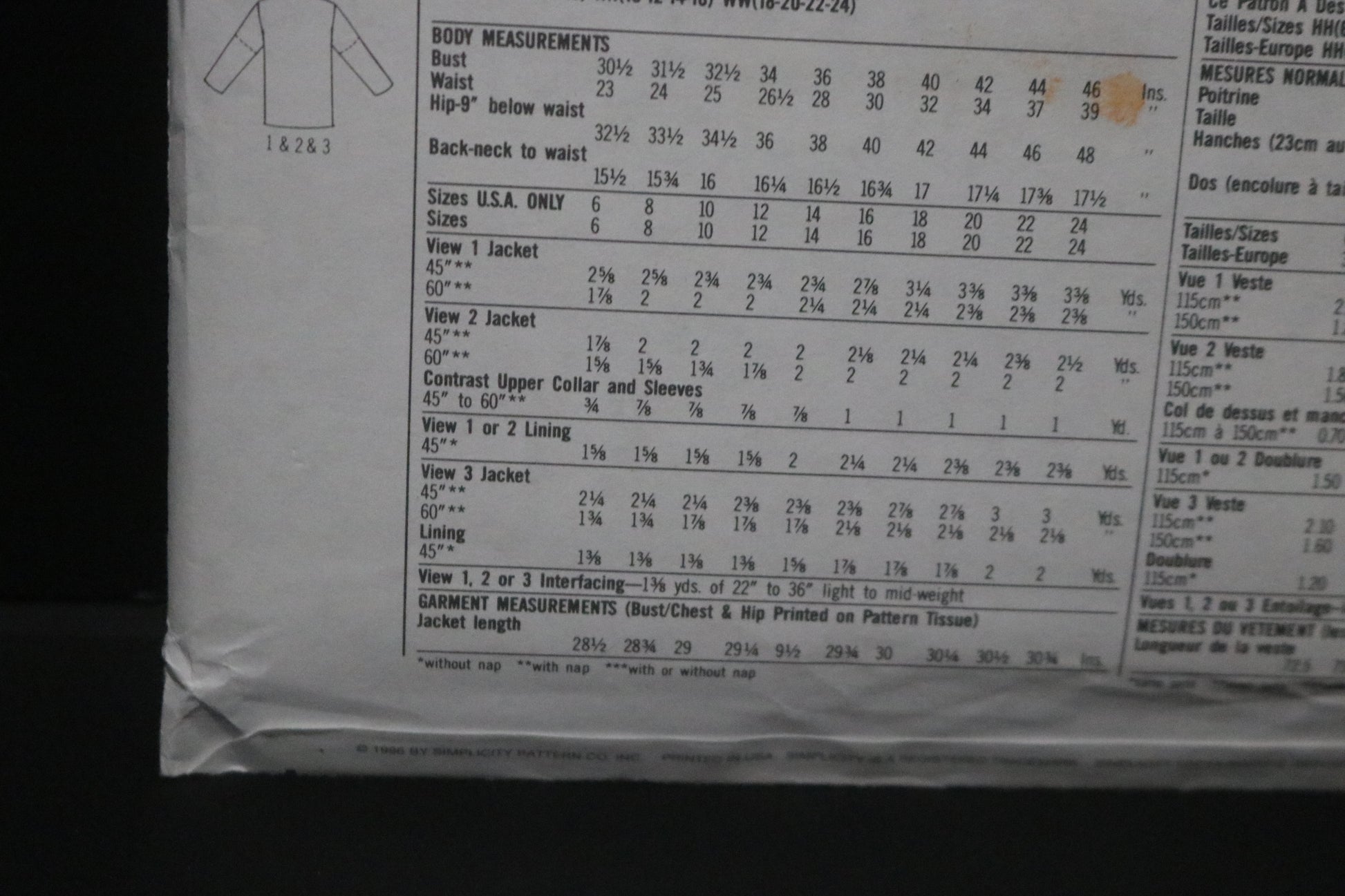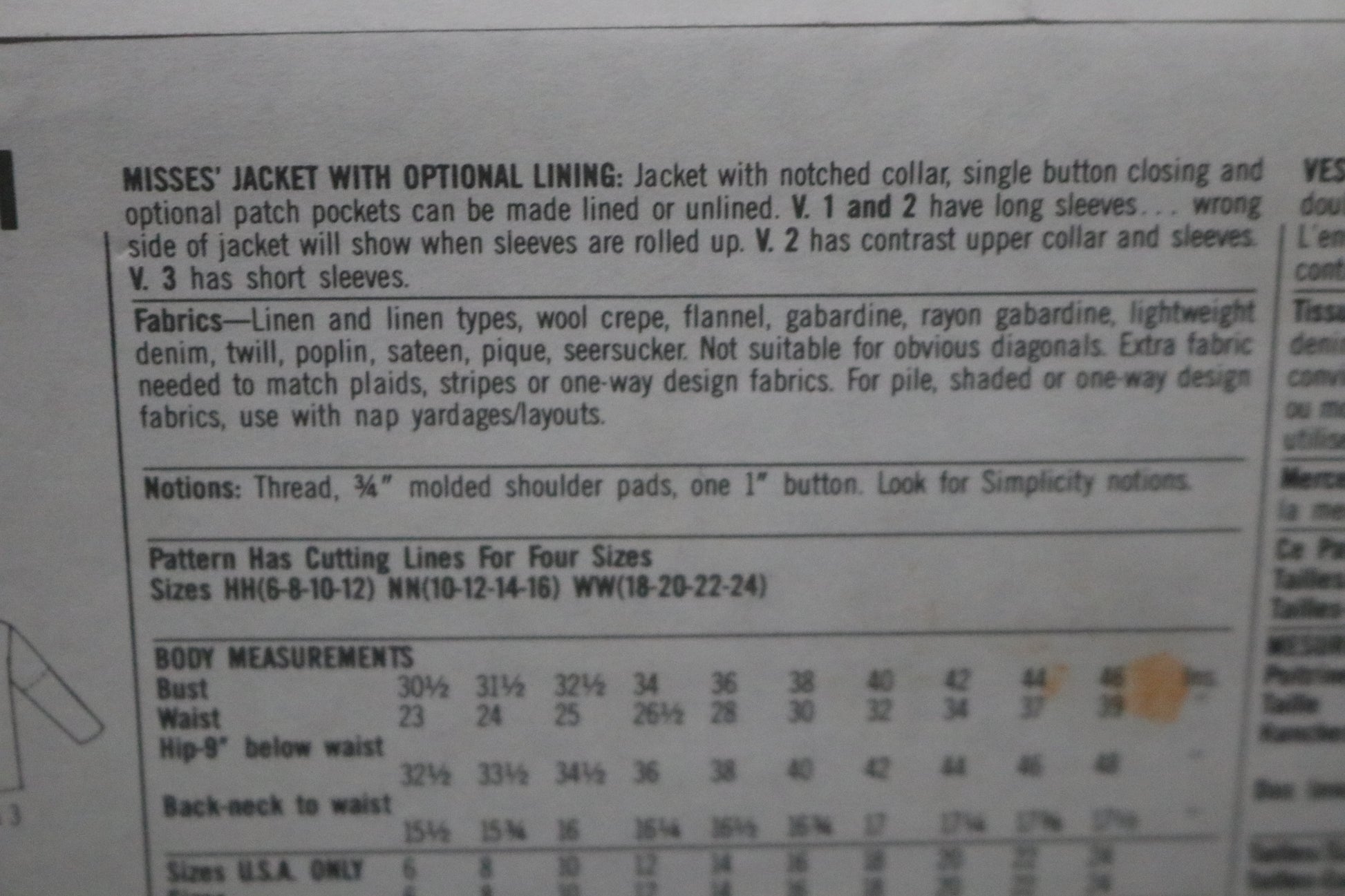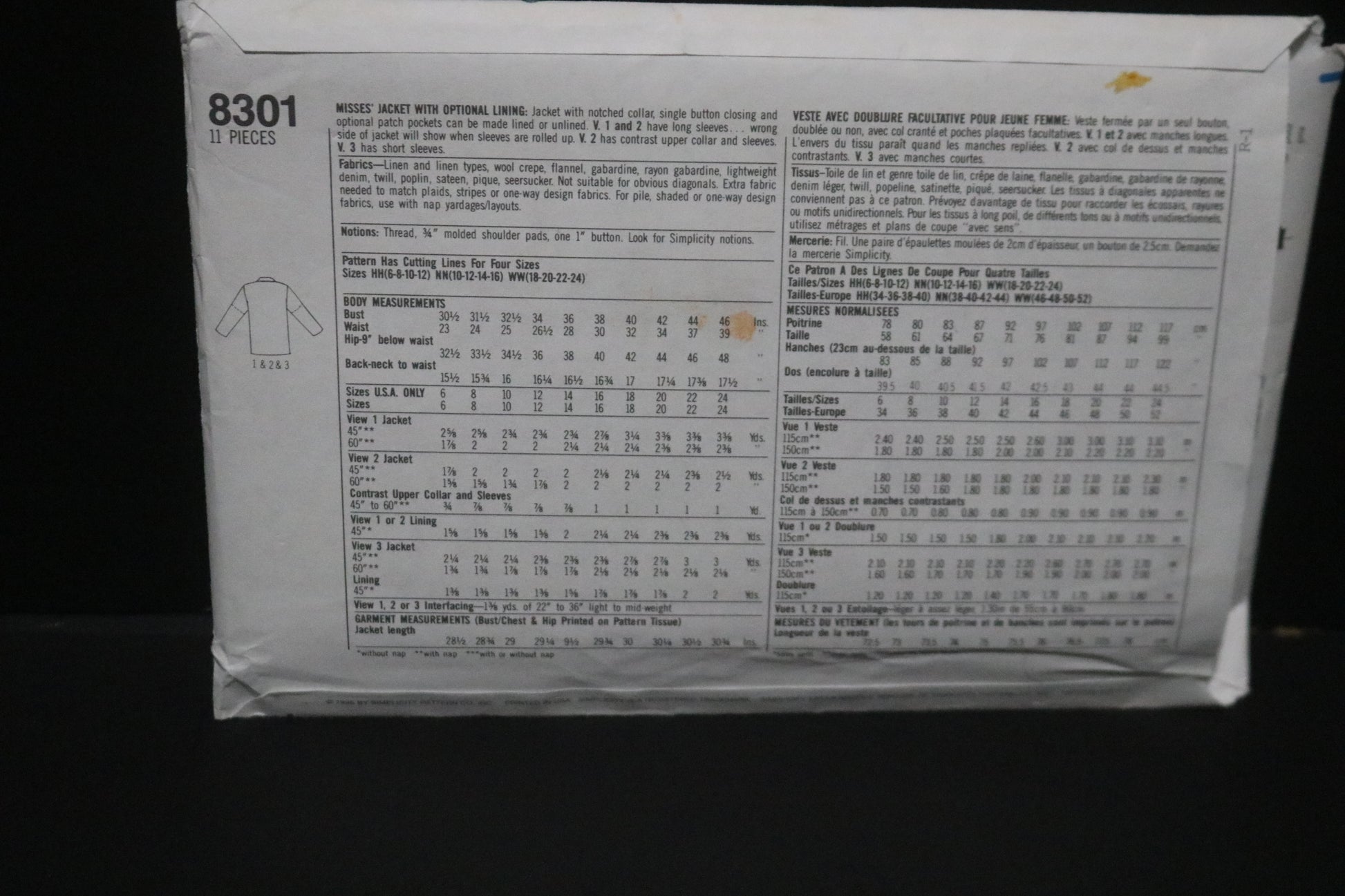 Simplicity 8301 Misses Jacket with optional lining Sewing Pattern - UNCUT - Size 10 - 16 Please reference the photos for pattern details.