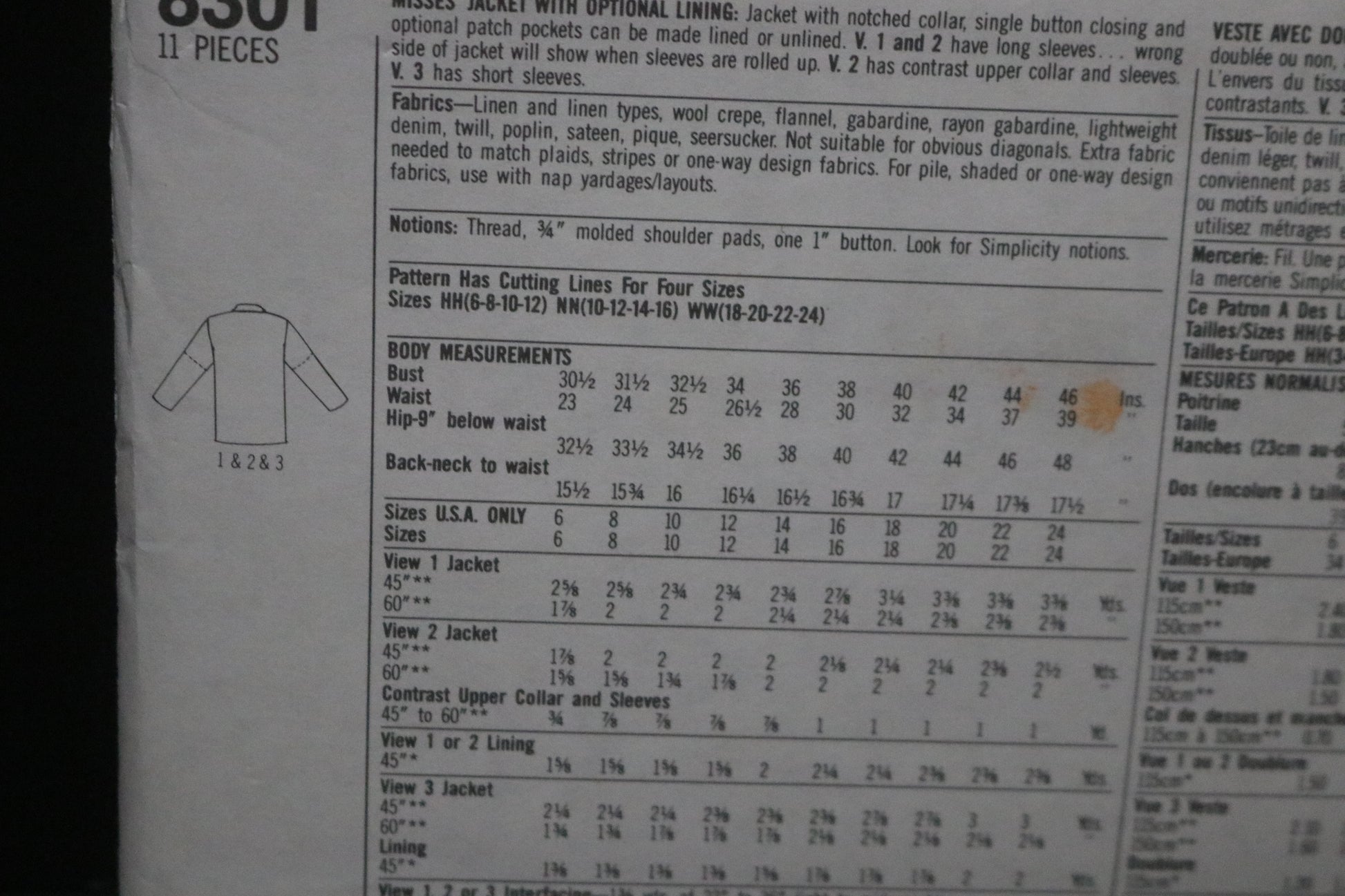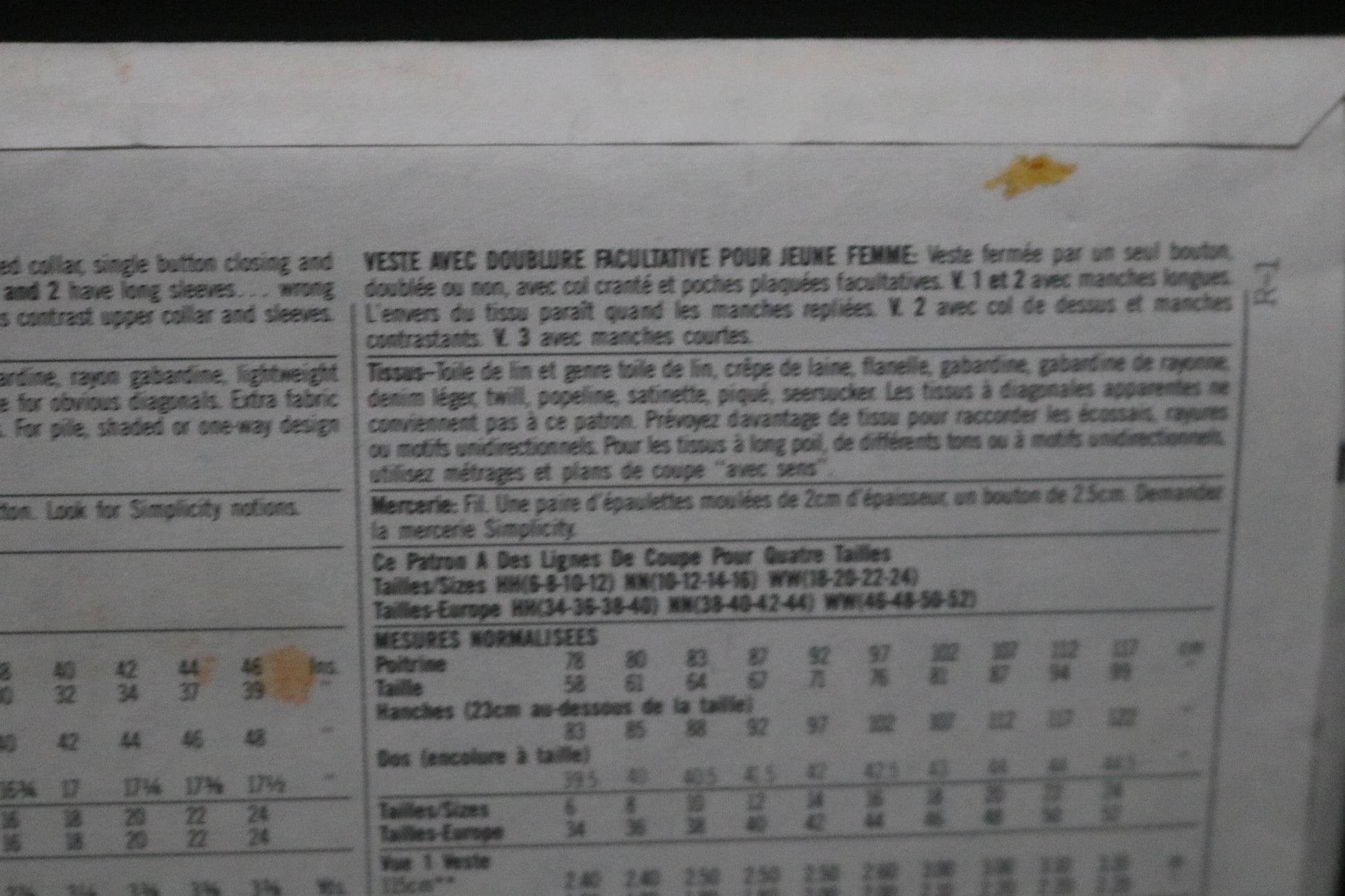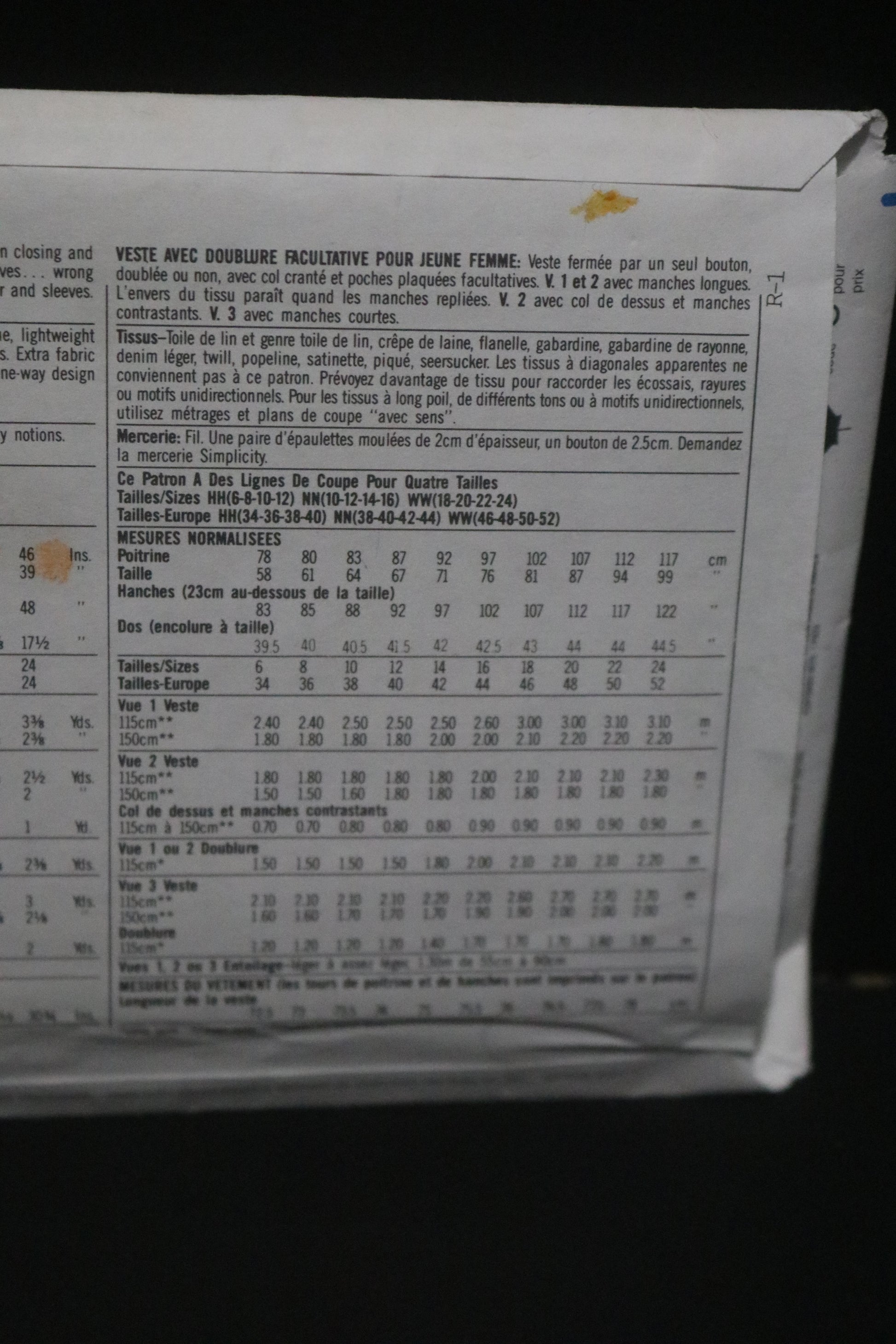 Simplicity 8301 Misses Jacket with optional lining Sewing Pattern - UNCUT - Size 10 - 16 Please reference the photos for pattern details.