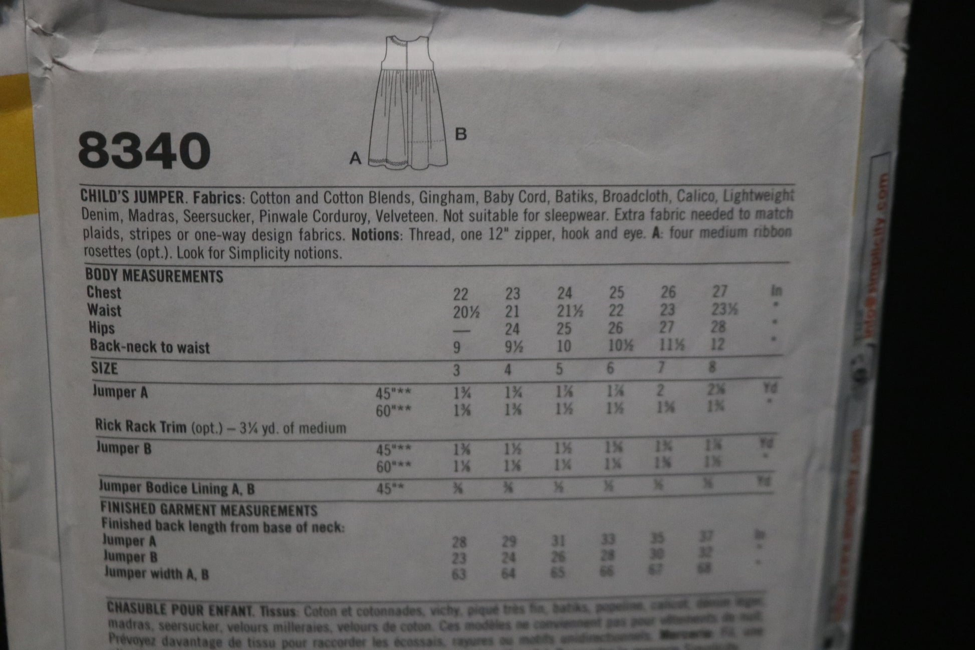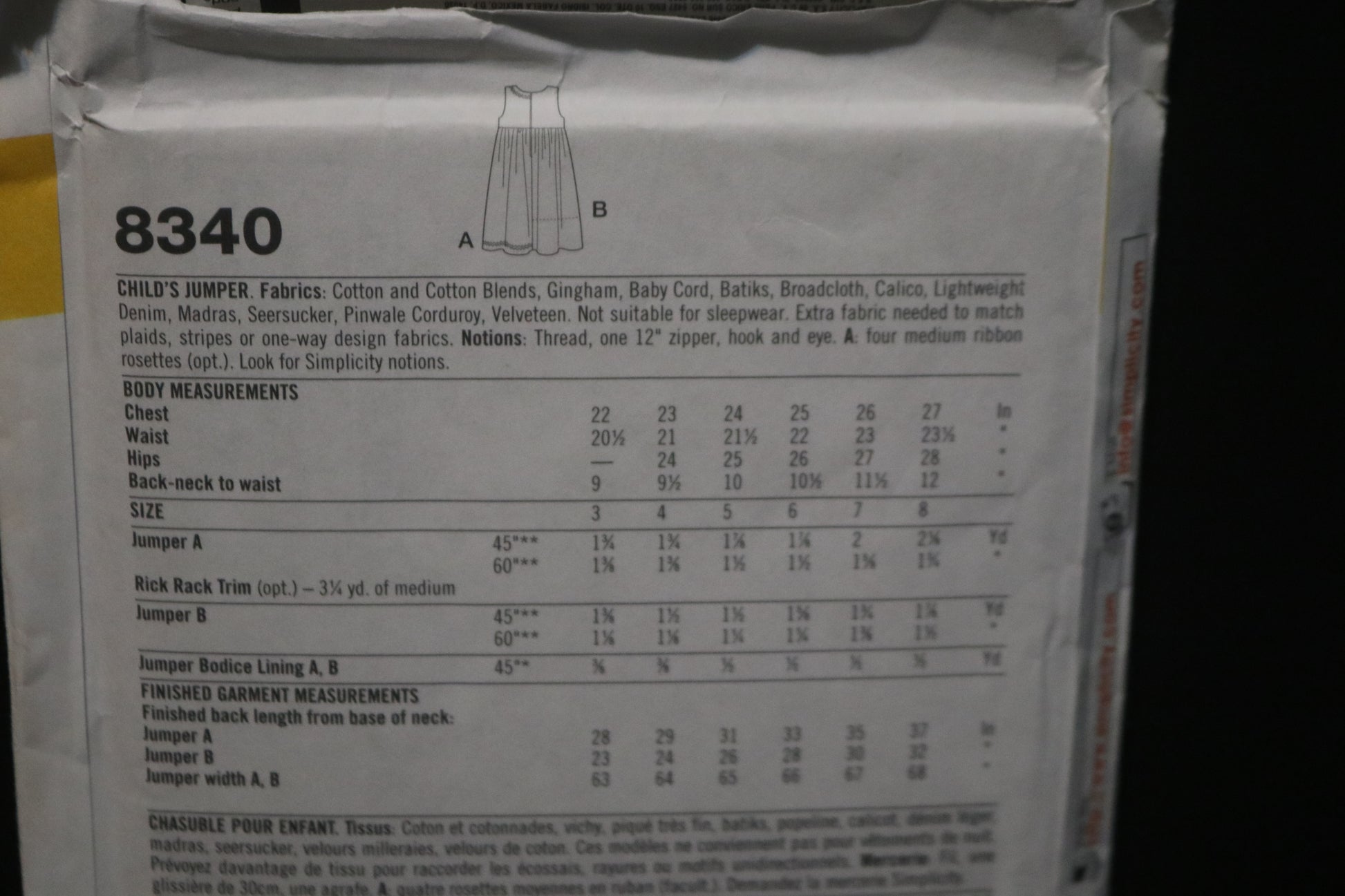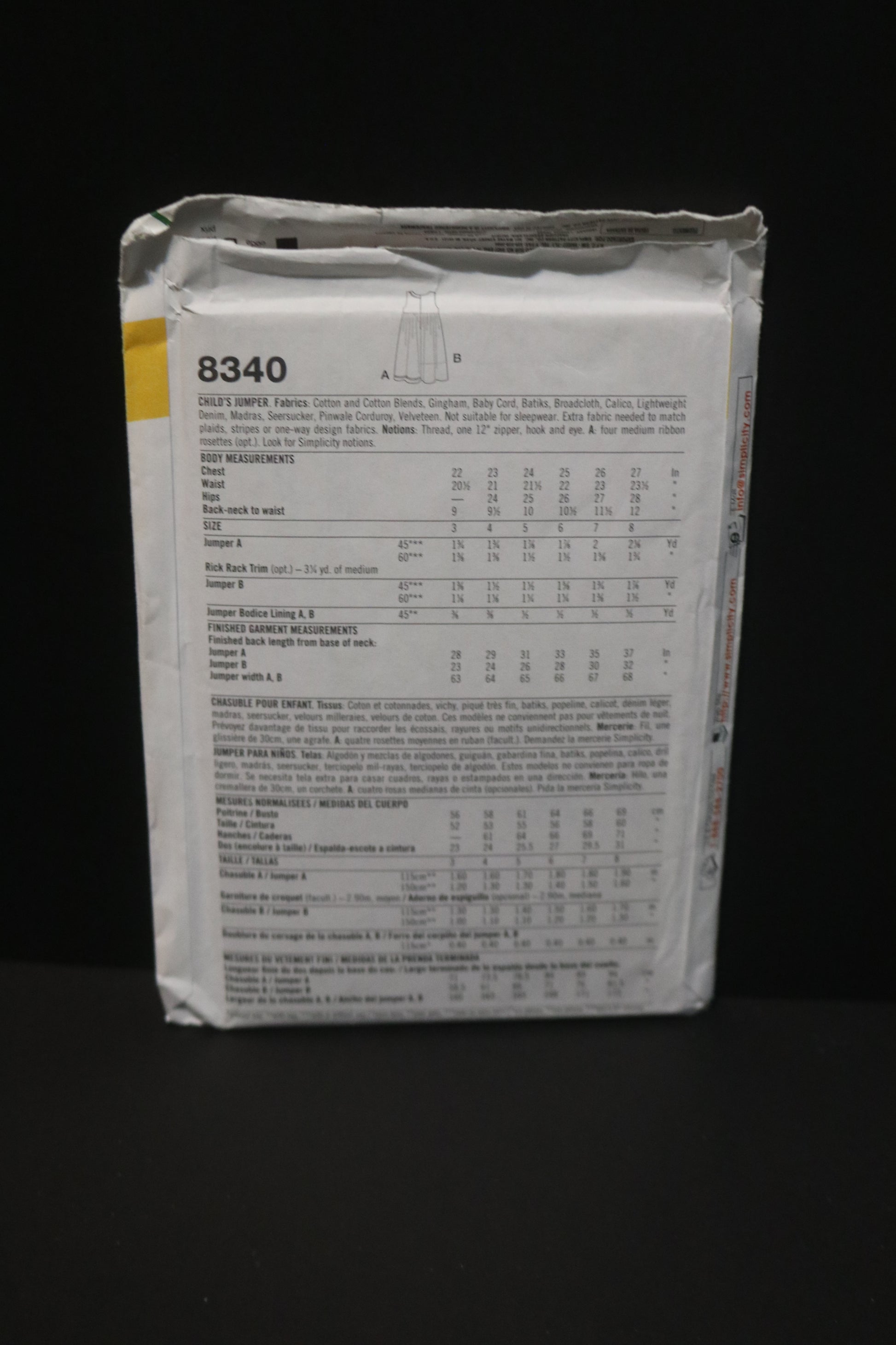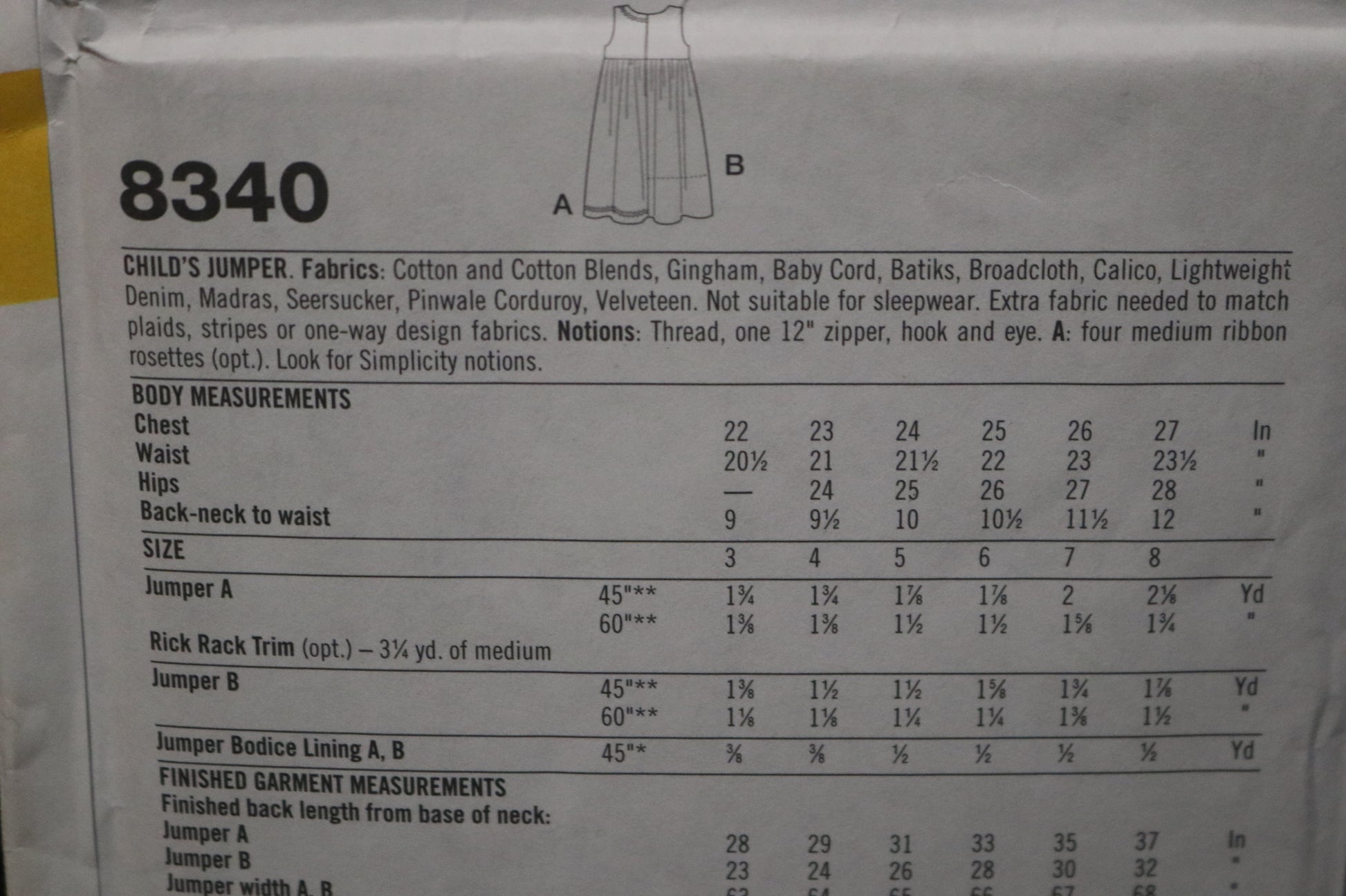 Simplicity 8340 Chilrens/Girls Jumper Sewing Pattern - UNCUT Size 3 4 5 6 7 8