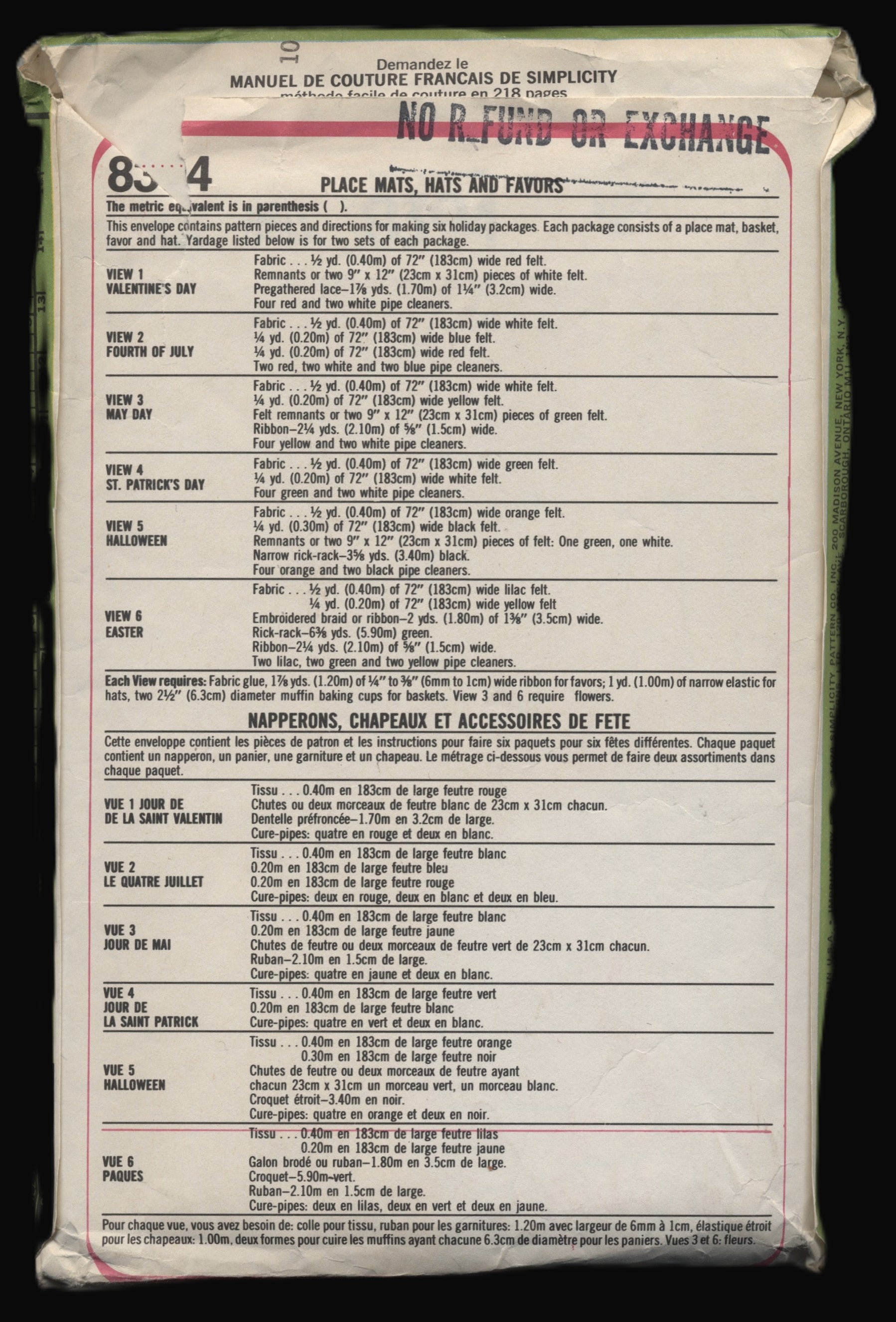 This envelops contains pattern and directions for making six holiday packages. Each package consists of a place mat, basket, favor and hat.