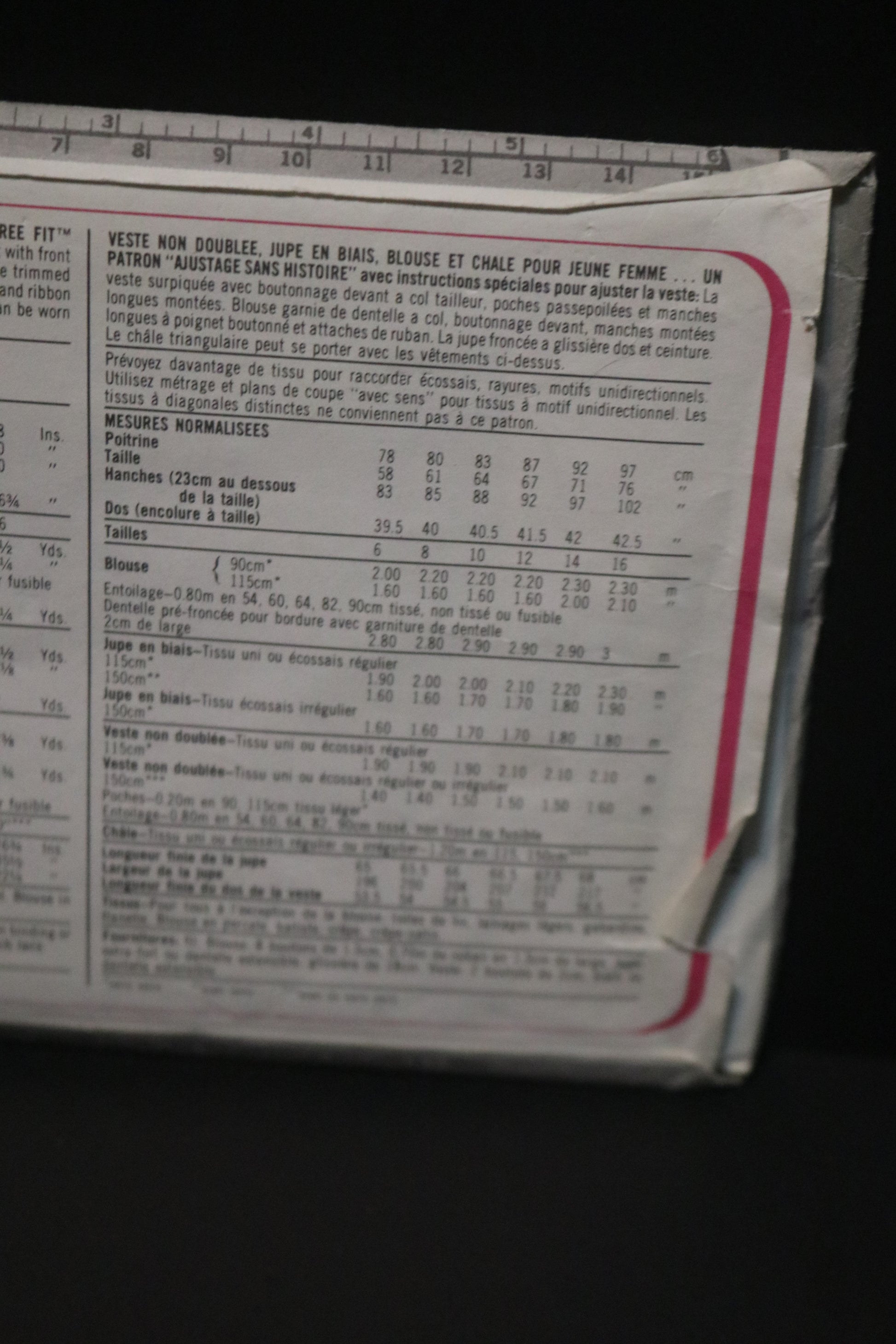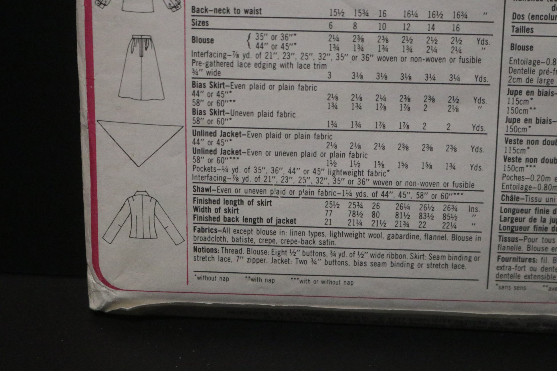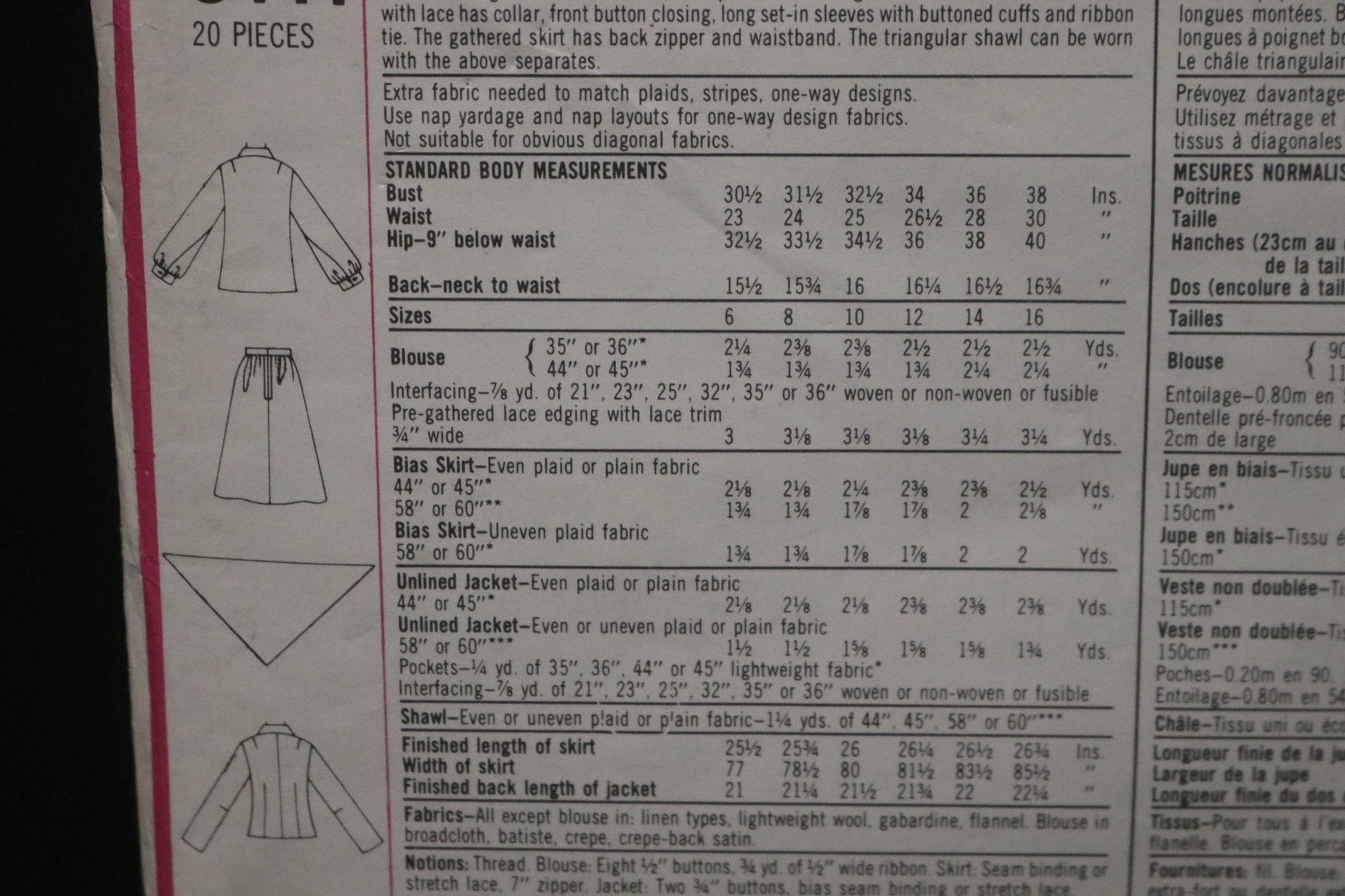 A Fuss-Free Fit Pattern with special instructions for fitting the jacket: The top-stitched jacket with front button closing has notched collar, welt pockets and long set-in sleeves. Blouse trimmed with lace has collar, front button closing, long set-in sleeves with buttoned cuffs and ribbon tie. The gathered skirt has back zipper and waistband. The triangular shawl can be worn with the above separates.