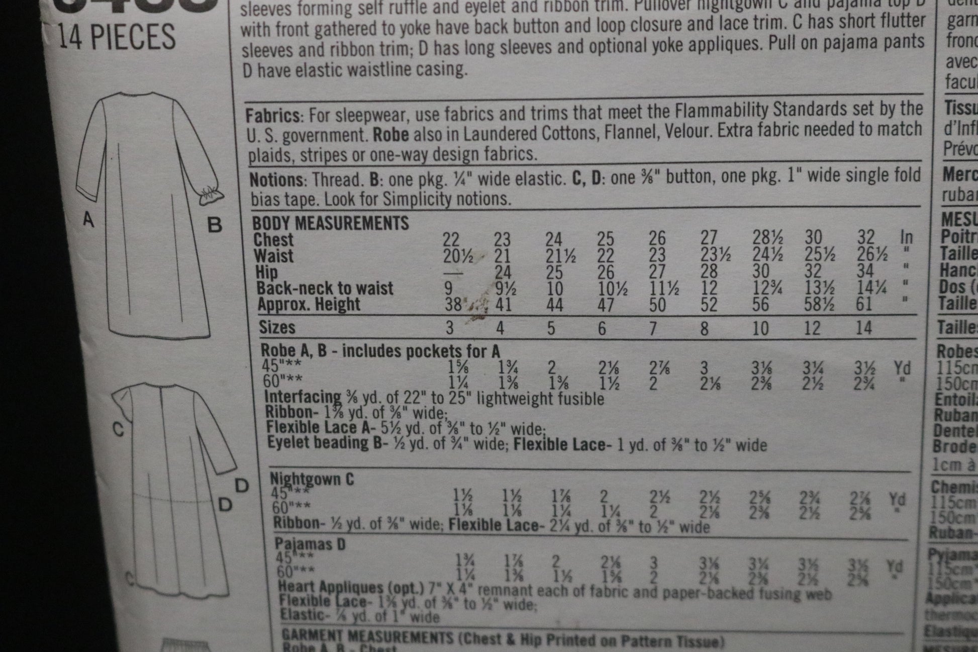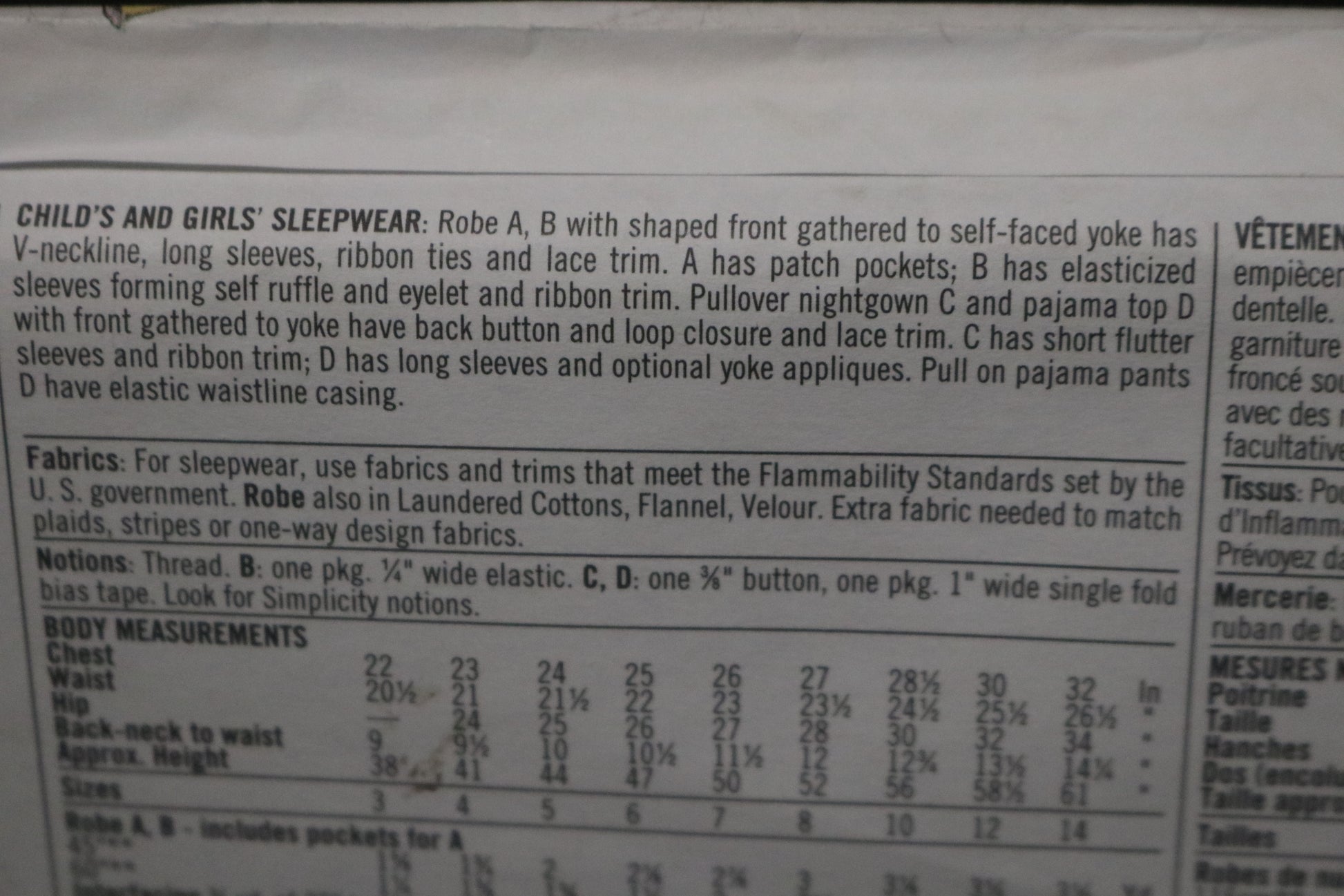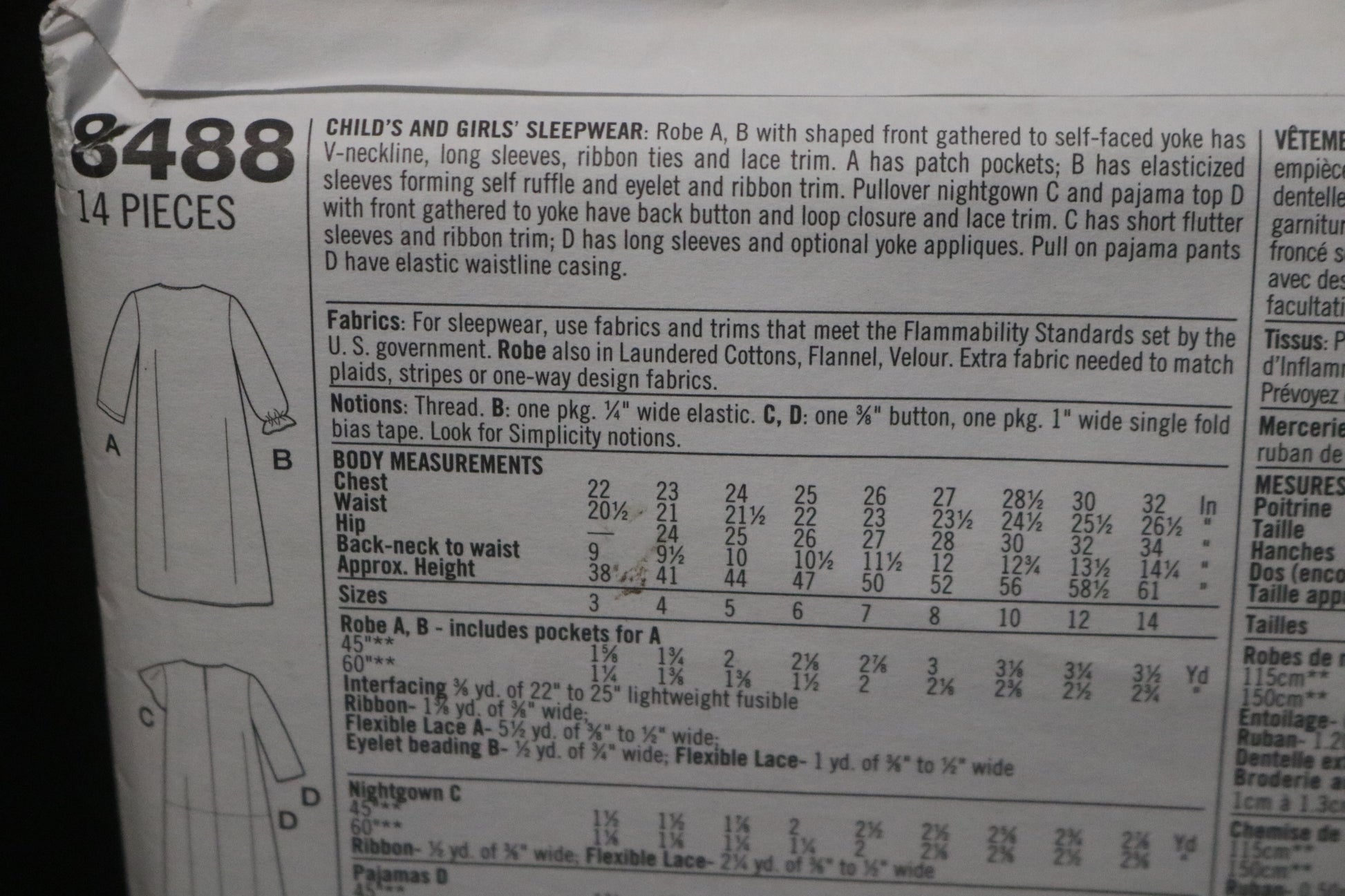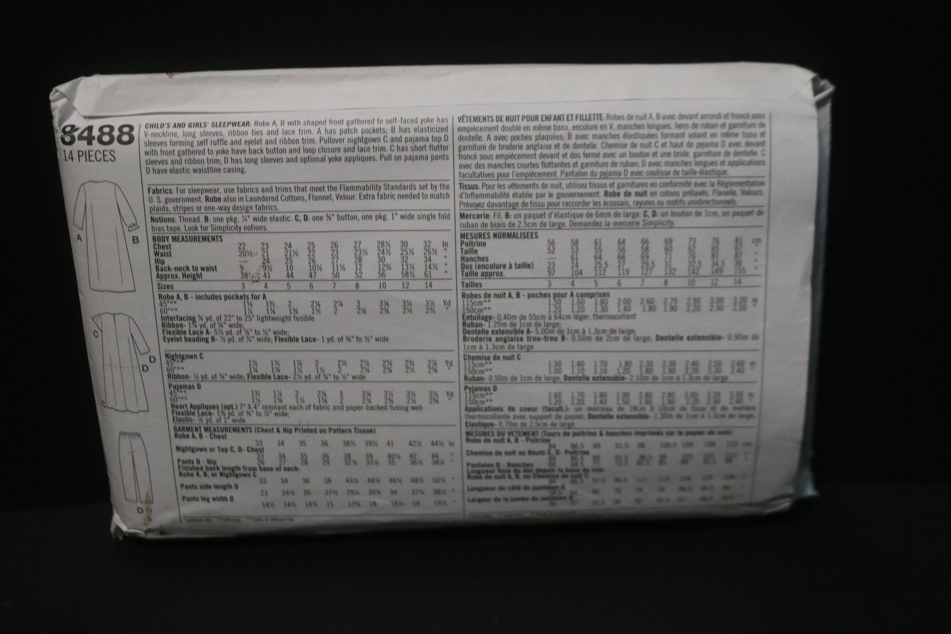 Simplicity 8488 Girls Sleepwear Sewing Pattern UNCUT Size 7 8 10 12