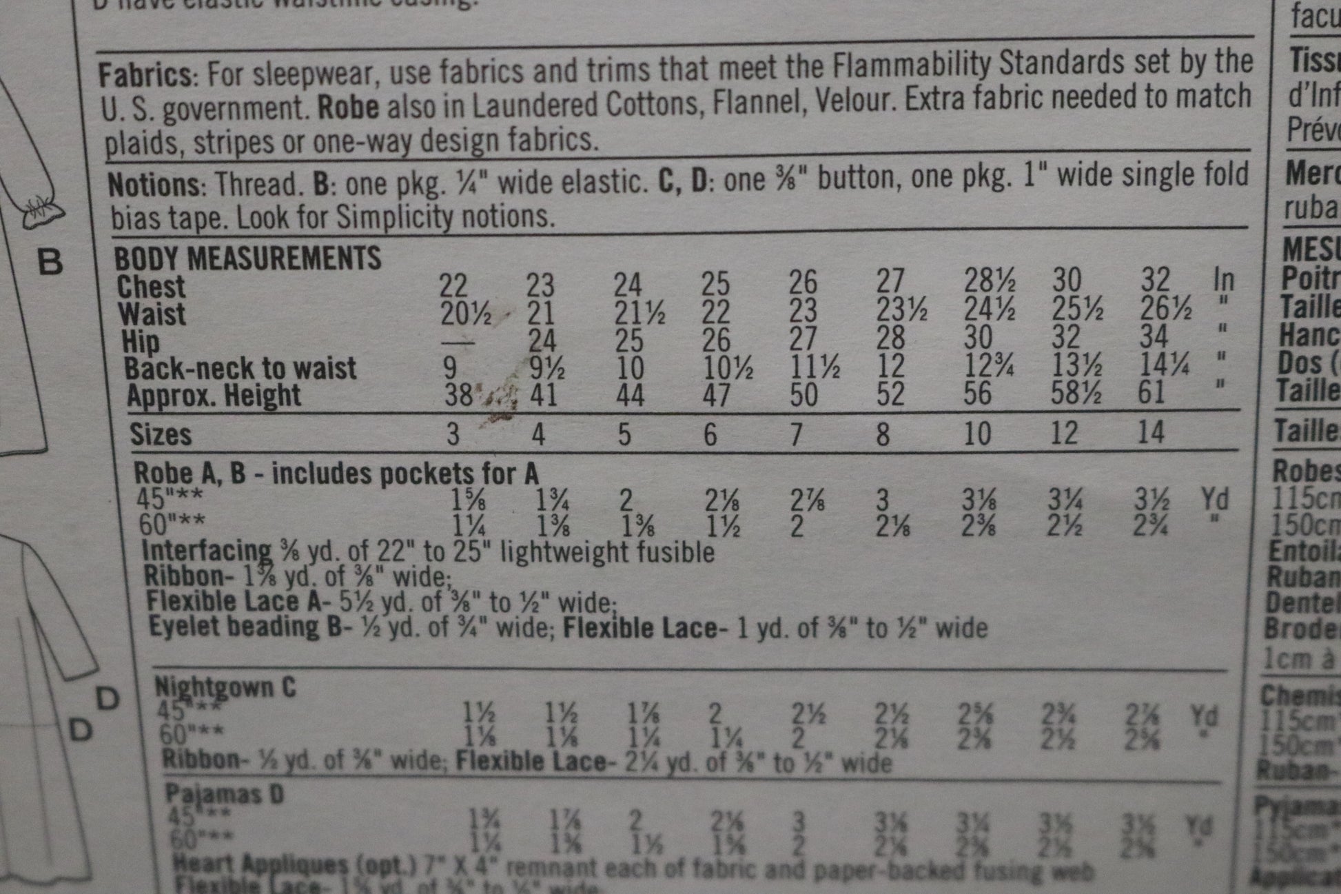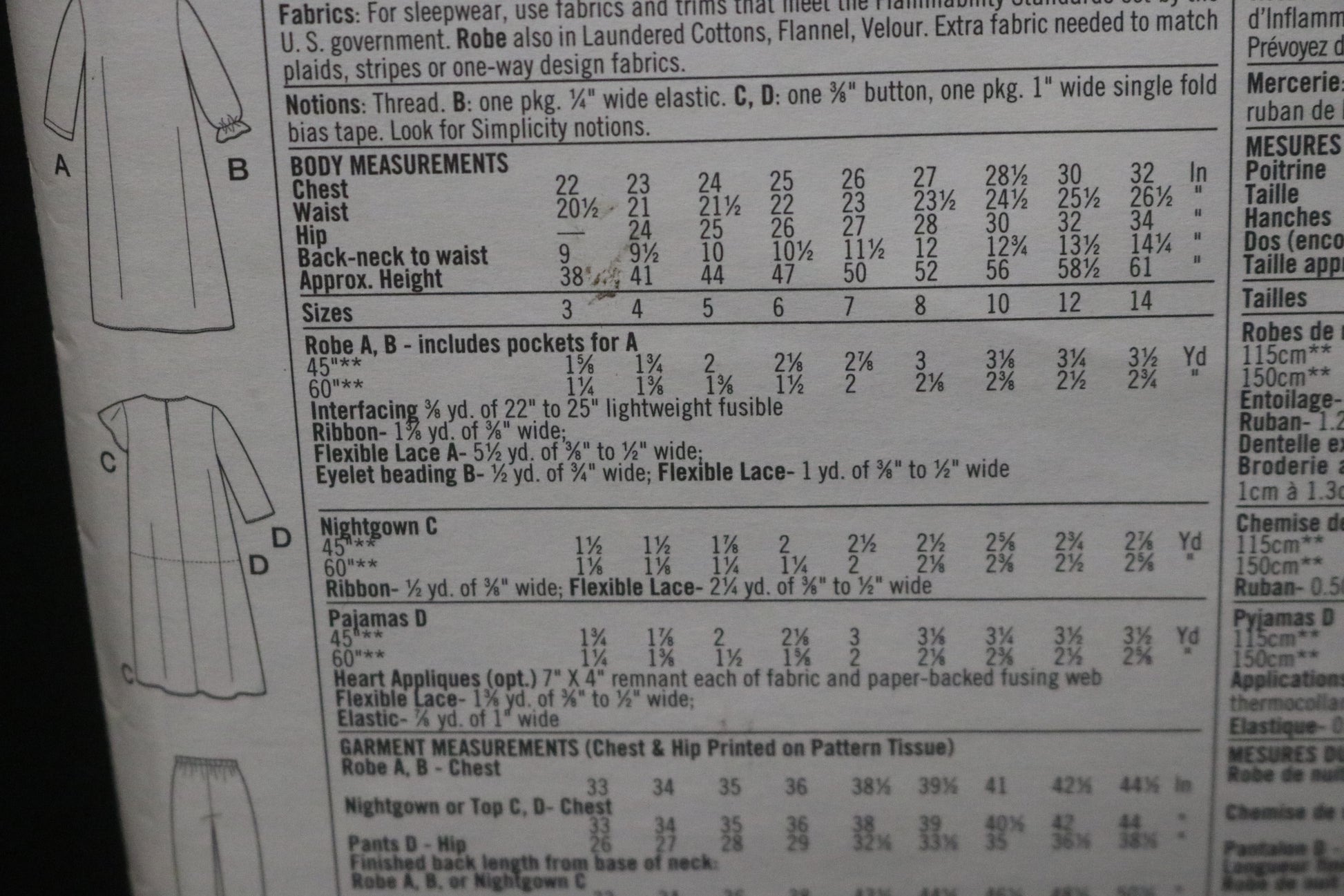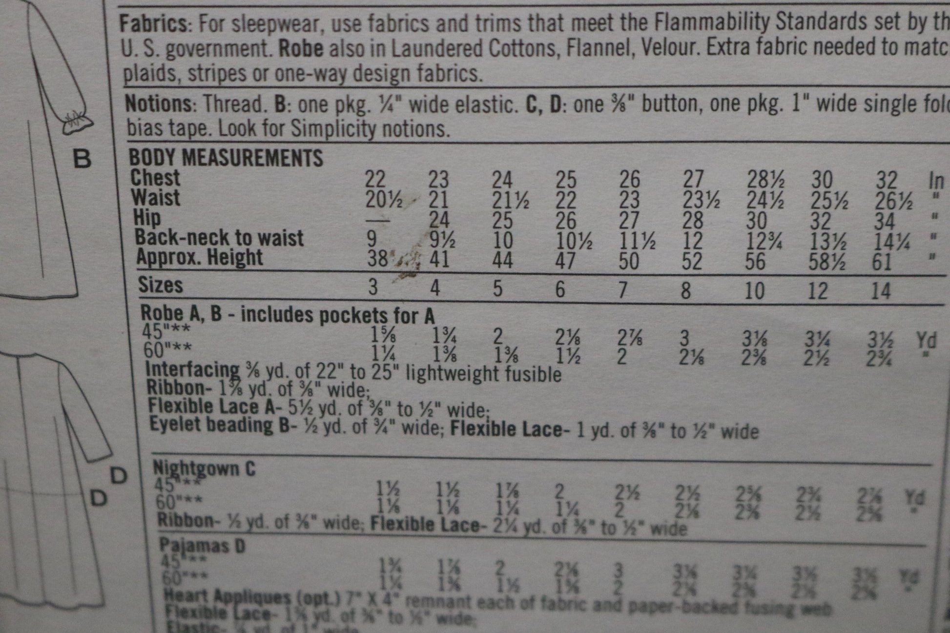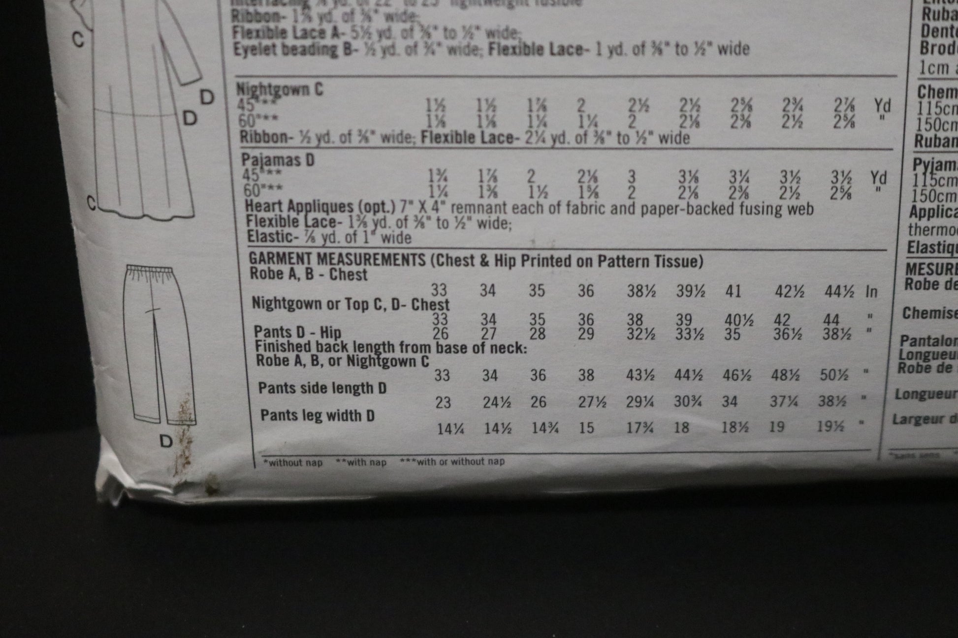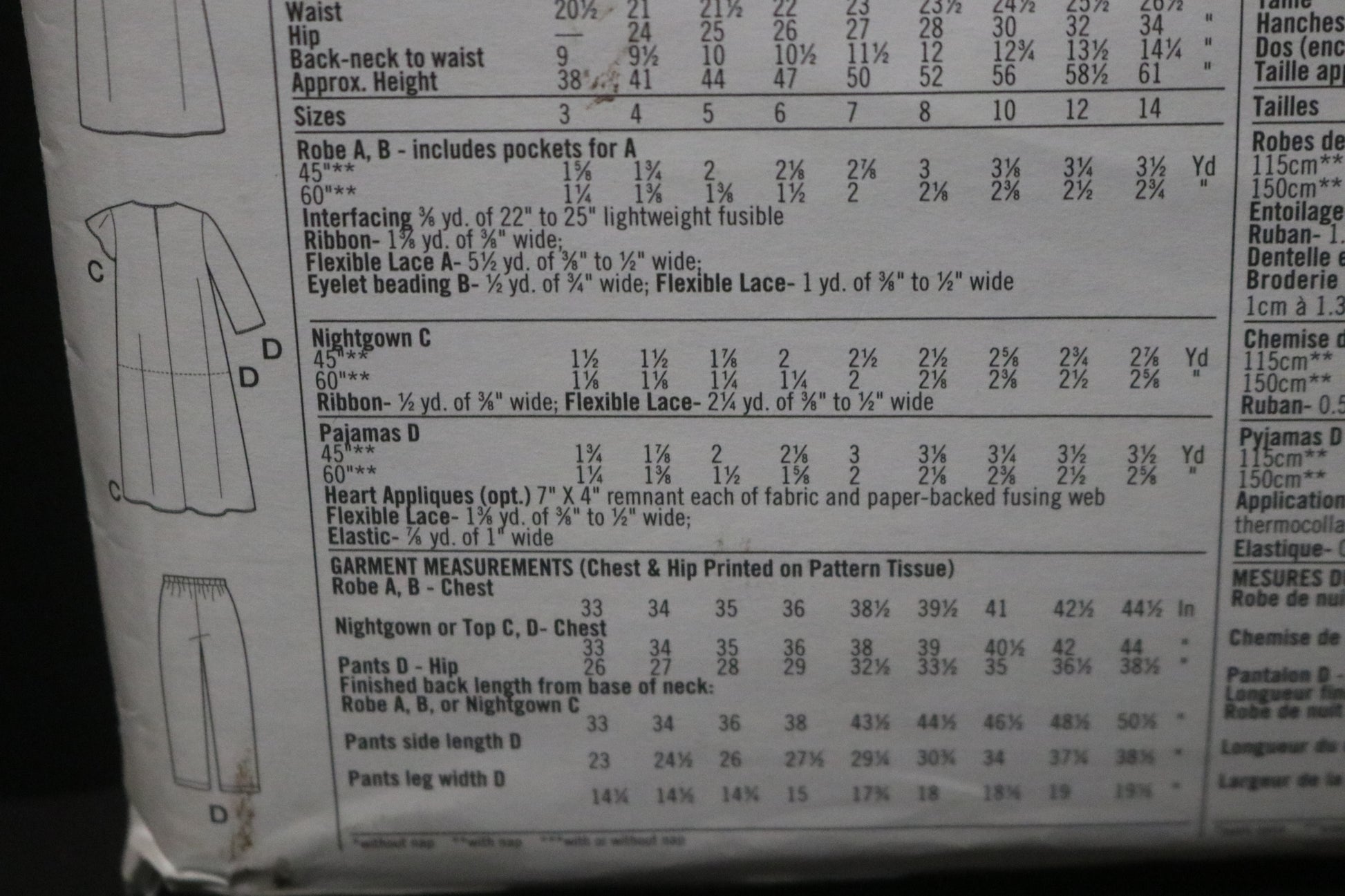 Robe with shaped front gathered to self faced yoke has V neckline, long sleeves, ribbon ties and lace trim View A has patch pockets View B has elasticized sleeves forming self ruffle and eyelet and ribbon trim Pullover nightgown C and pajama top D with front gathered to yoke have back button and loop closure and lace trim View C has short flutter sleeves and ribbon trim View D has long sleeves and optional yoke appliques Pull on pajama pants D have elastic waistline casing.
