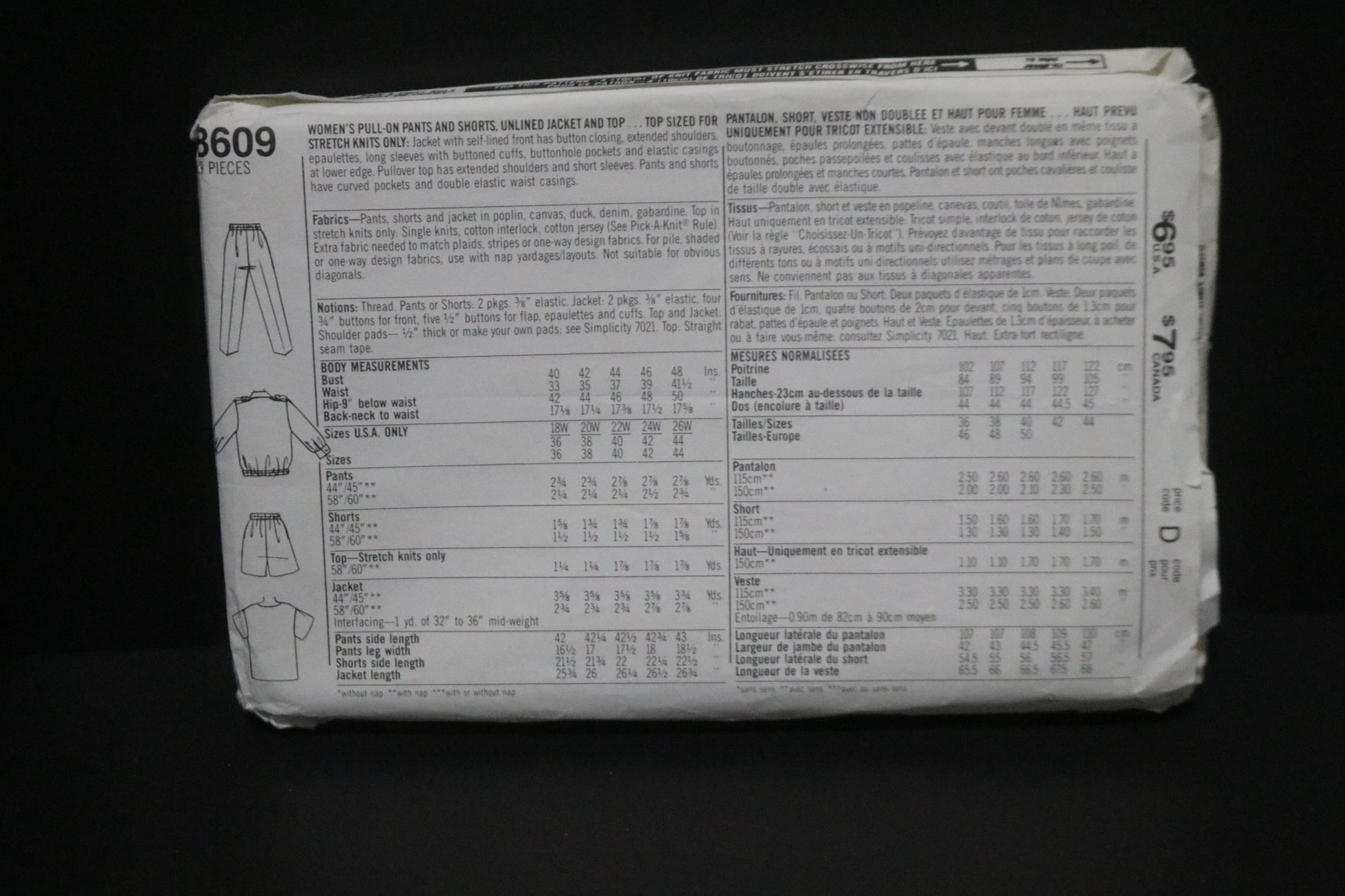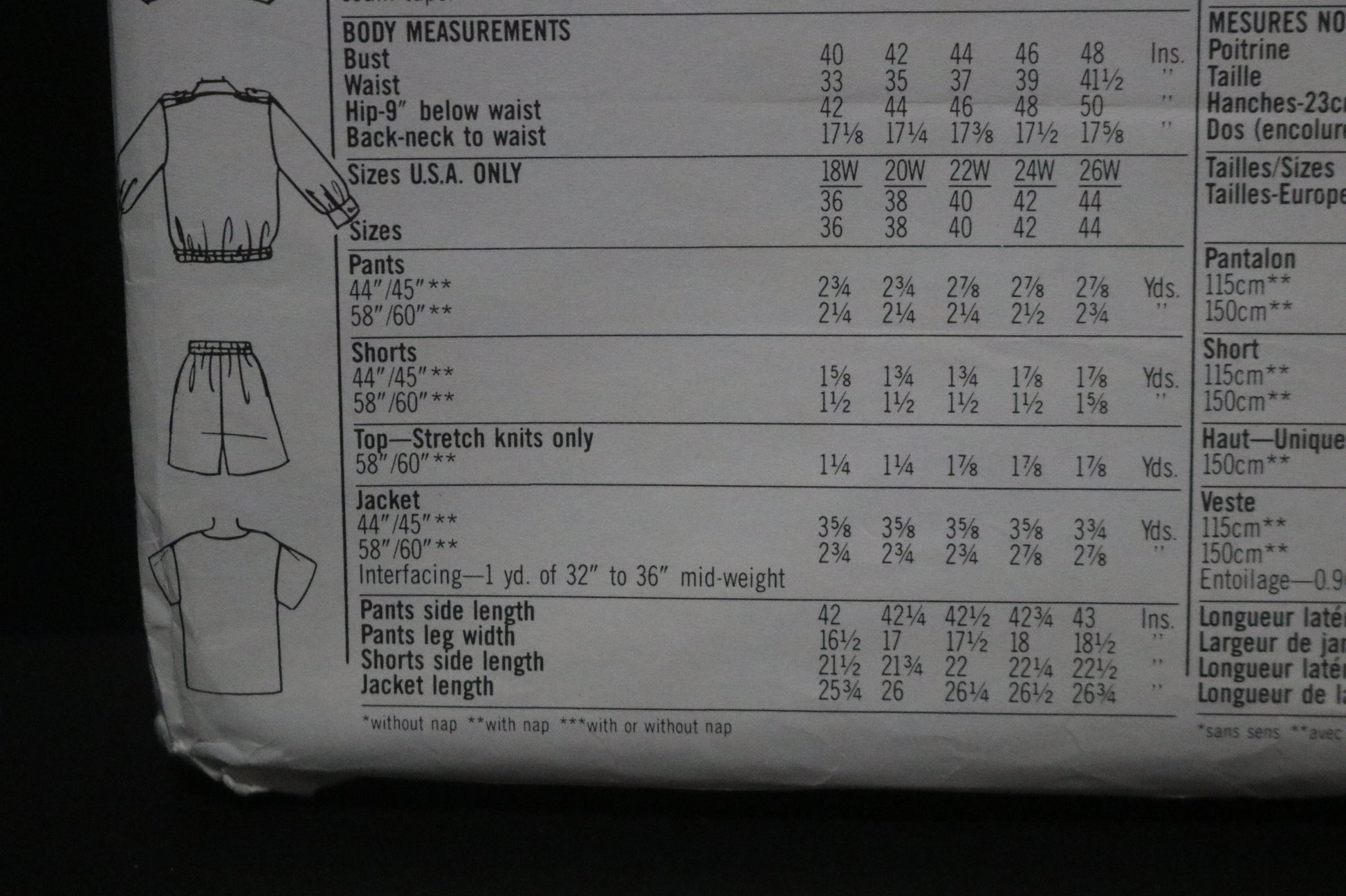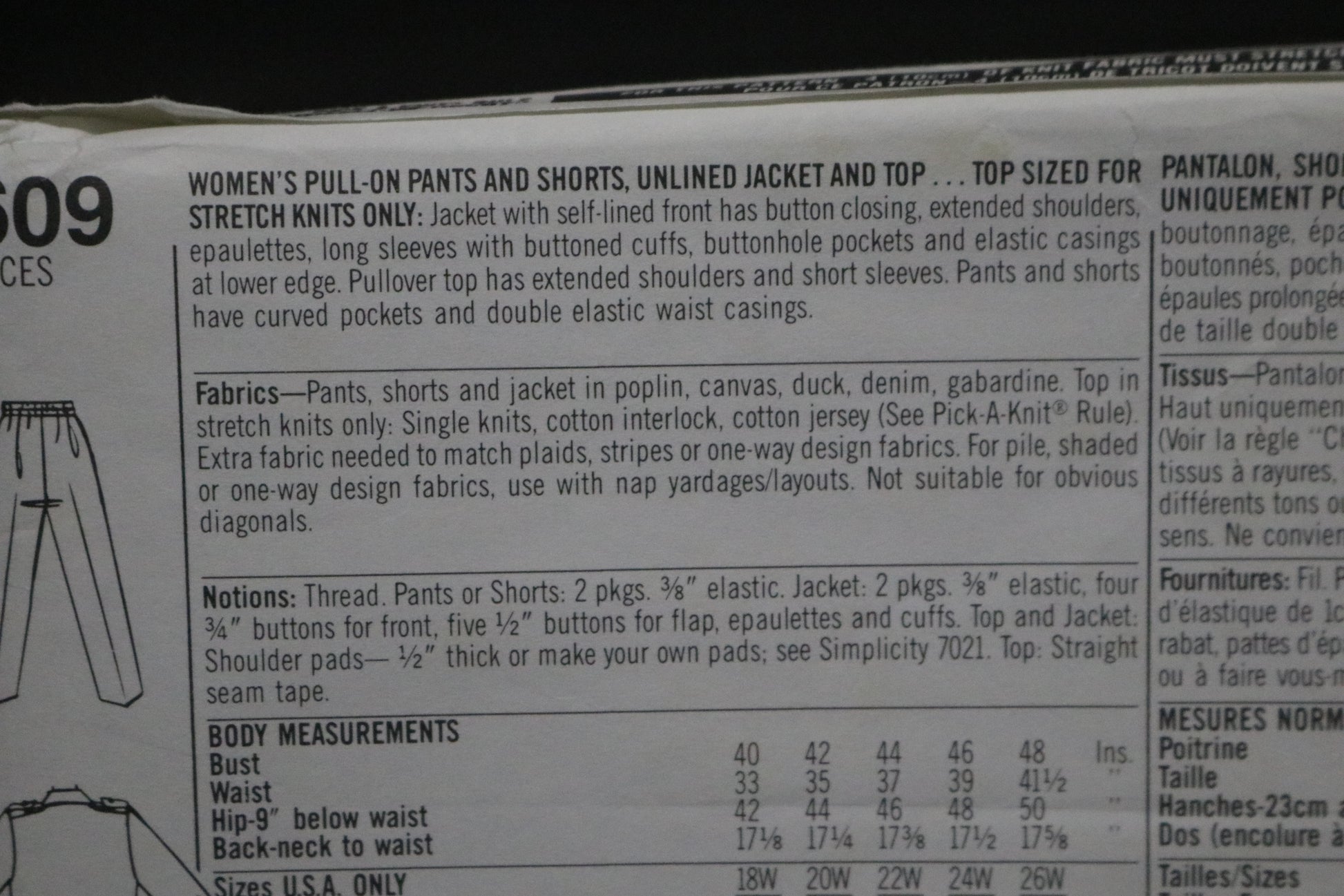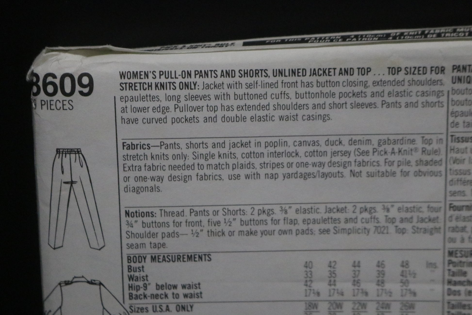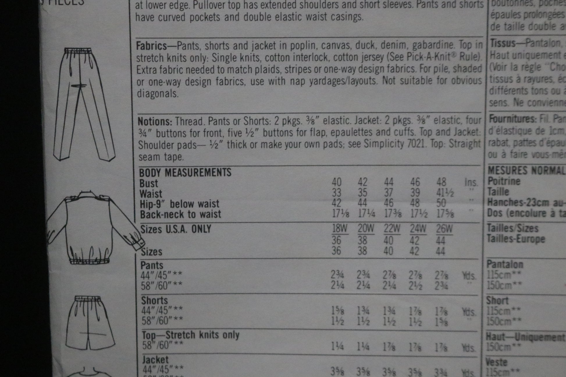 Top is sized for stretch knits only. Jacket with self-lined front has button closing, extended shoulders, epaulettes, long sleeves with buttoned cuffs, buttonhole pockets and elastic casings at lower edge. Pullover top has extended shoulders and short sleeves. Pants hand shorts have curved pockets and double elastic waist casting.