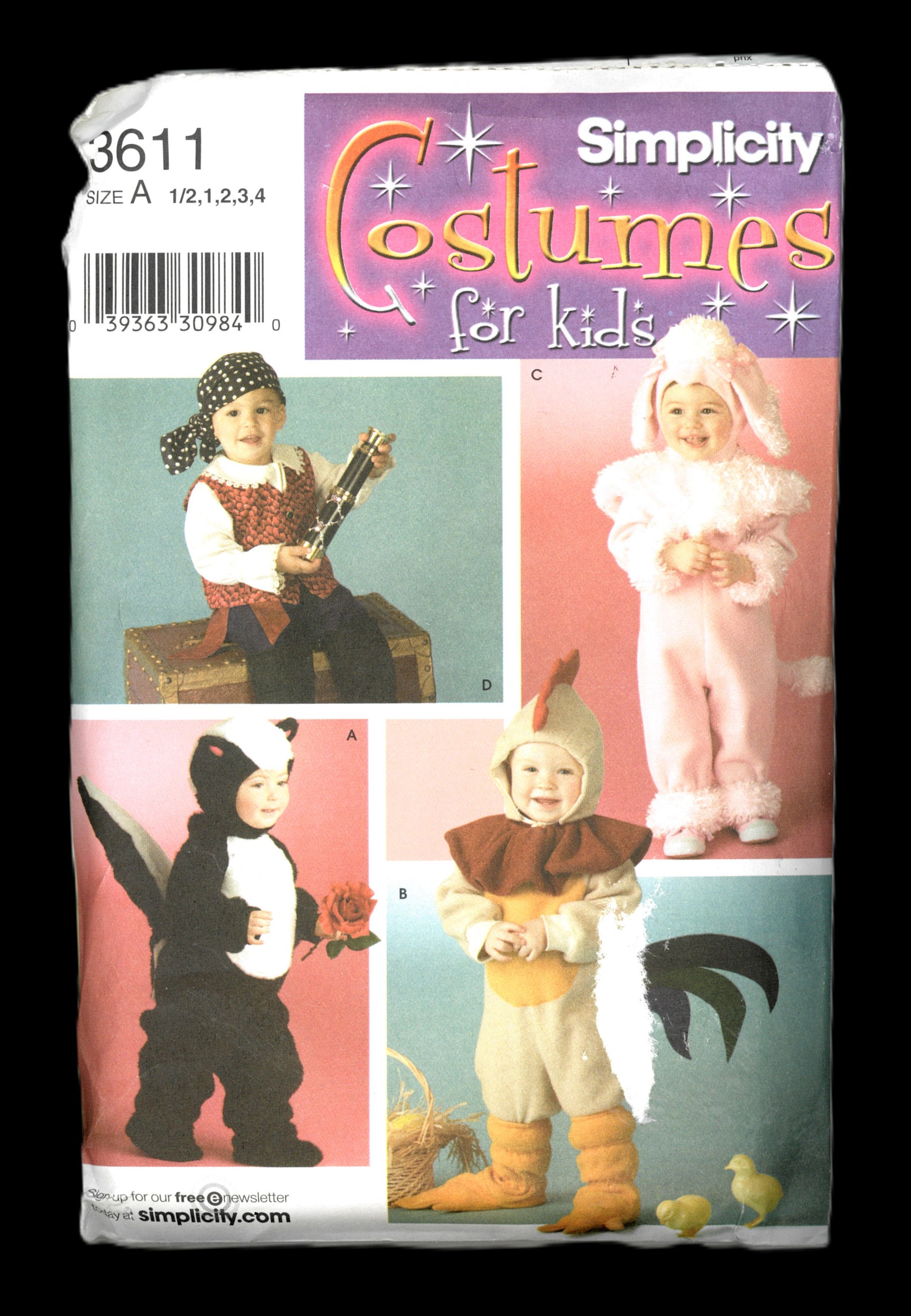 Simplicity 3611 Toddlers Pirate, Bunny, Skunk and Chicken Costumes Sewing Pattern - UNCUT - Size 1/2 1 2 3 4