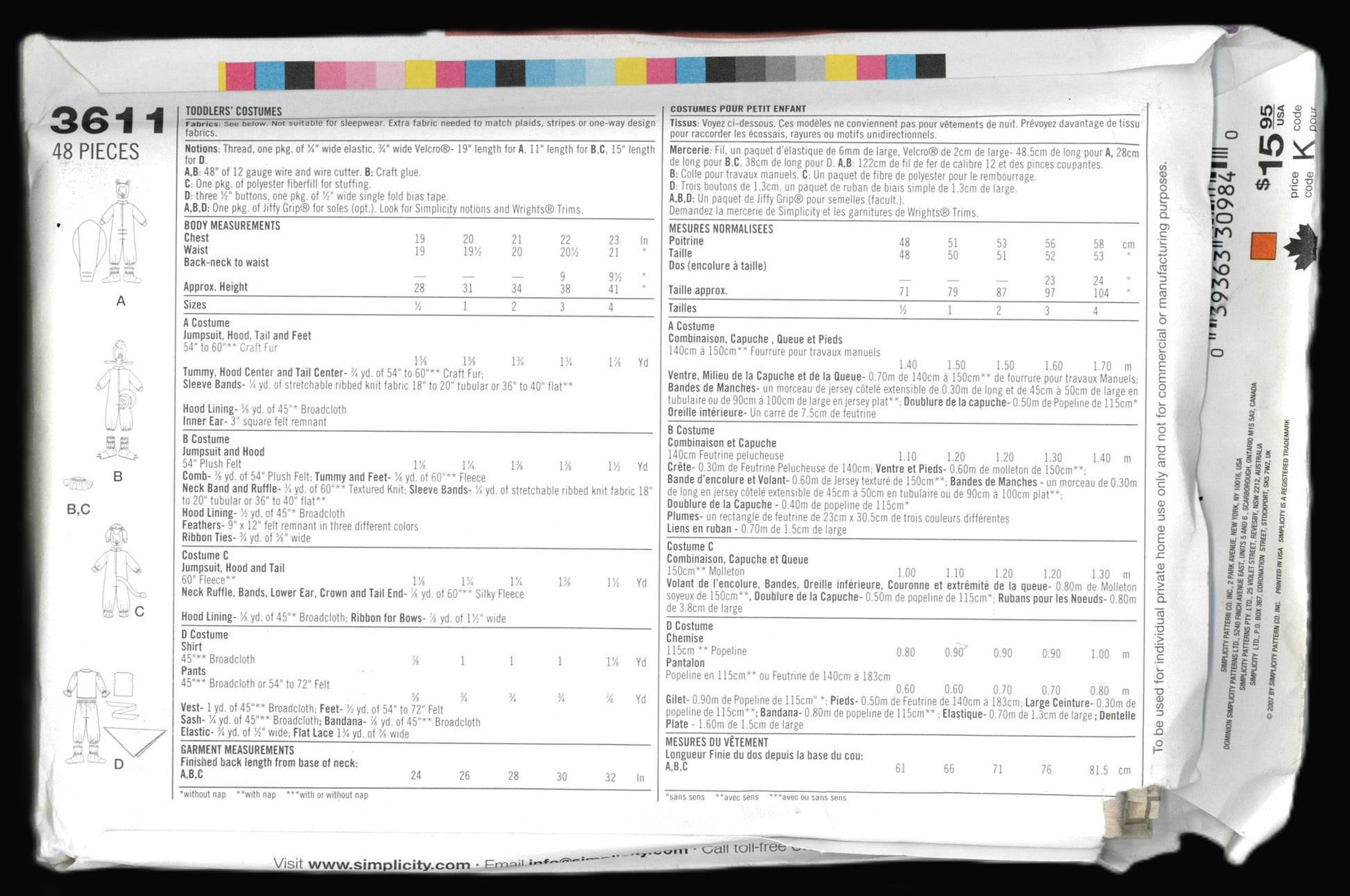 Simplicity 3611 Toddlers Pirate, Bunny, Skunk and Chicken Costumes Sewing Pattern