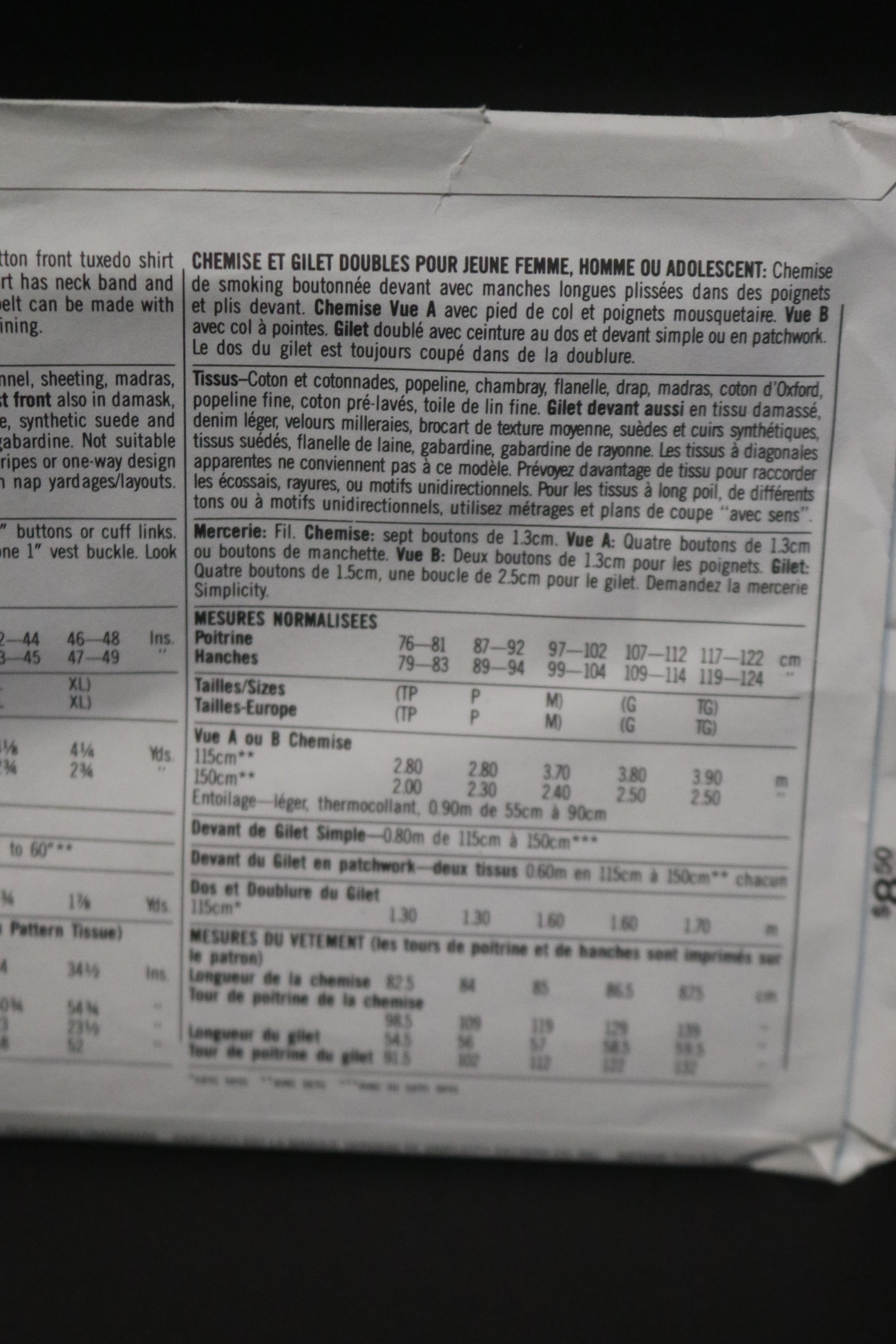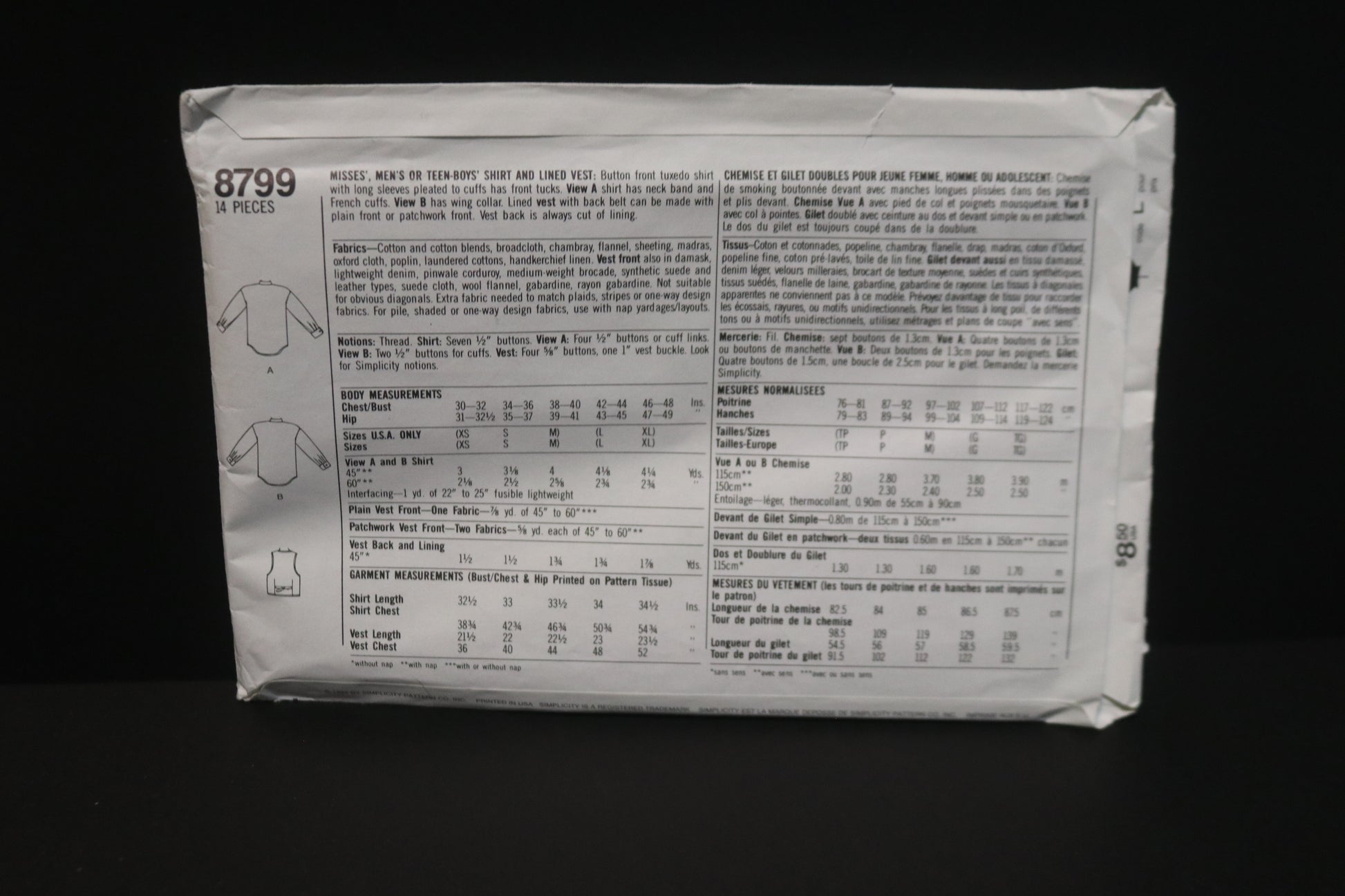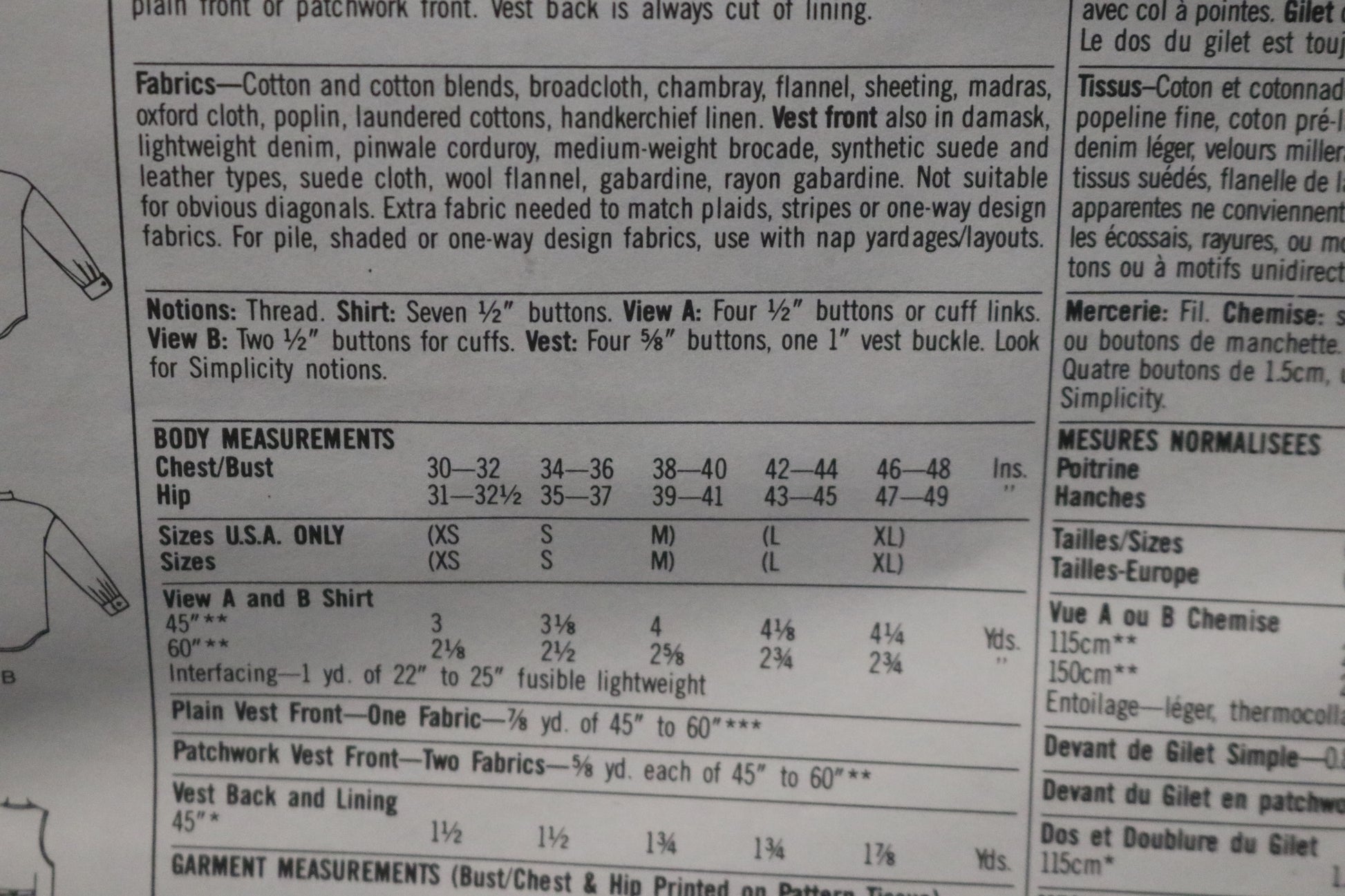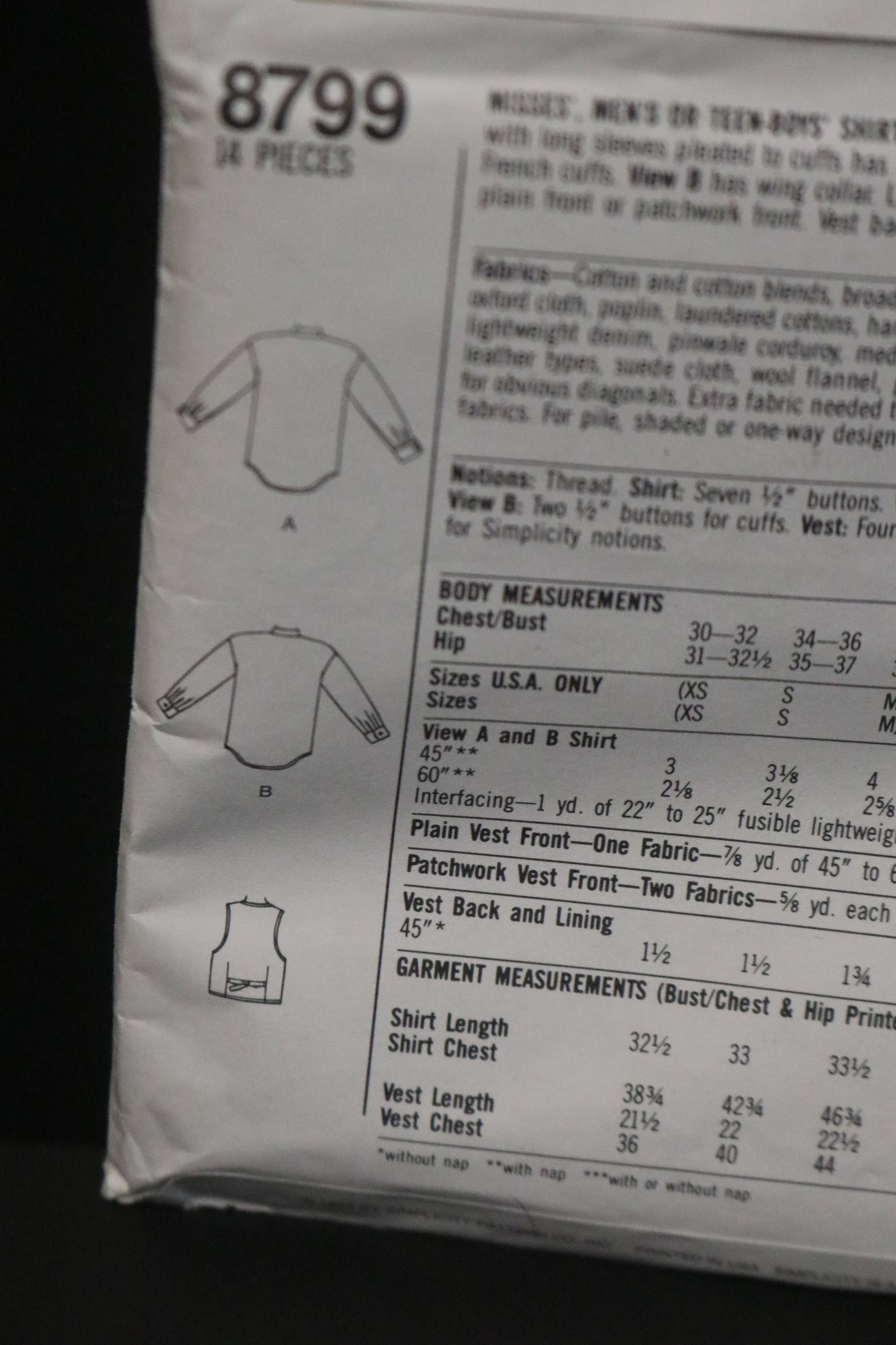 Button front tuxedo shirt with long sleeves pleatged to cuffs has front tucks. View A shirt has neck band and French cuffs. View B has wing collar, Lined vest with back belt can be made with plain front or patchwork front. Vest back is always cut of lining.