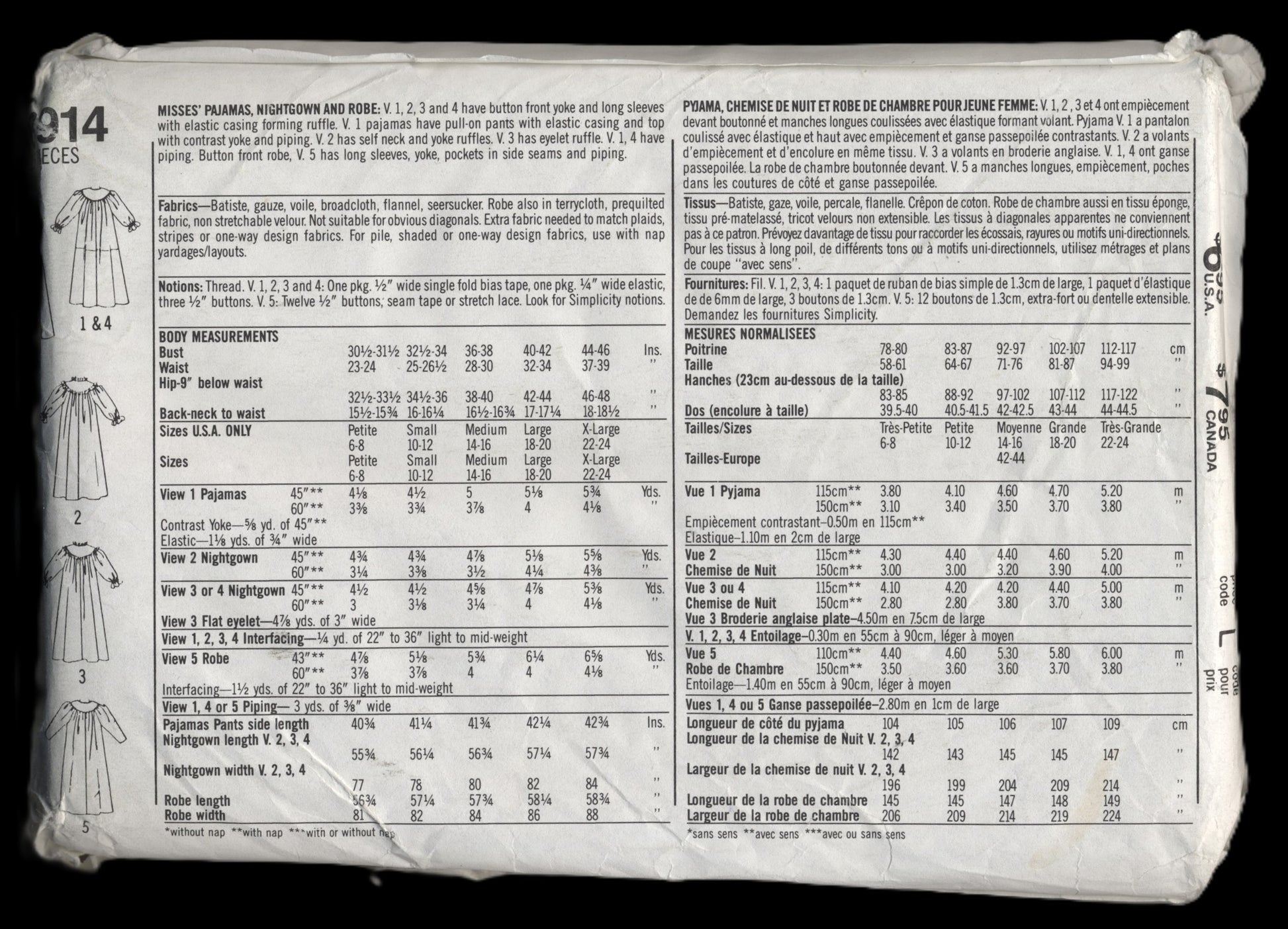 V 1,2,3 and 4 have buttoned front yoke and long sleeves with elastic casing forming ruffle. V. 1 pajamas have pull on pants with elastic casing and top with contrast yoke and piping. V.2 has self neckline and yoke ruffles V 1, 4 have piping. Button front ribe V. 5 has long sleeves, yoke pockets in side seams and piping.