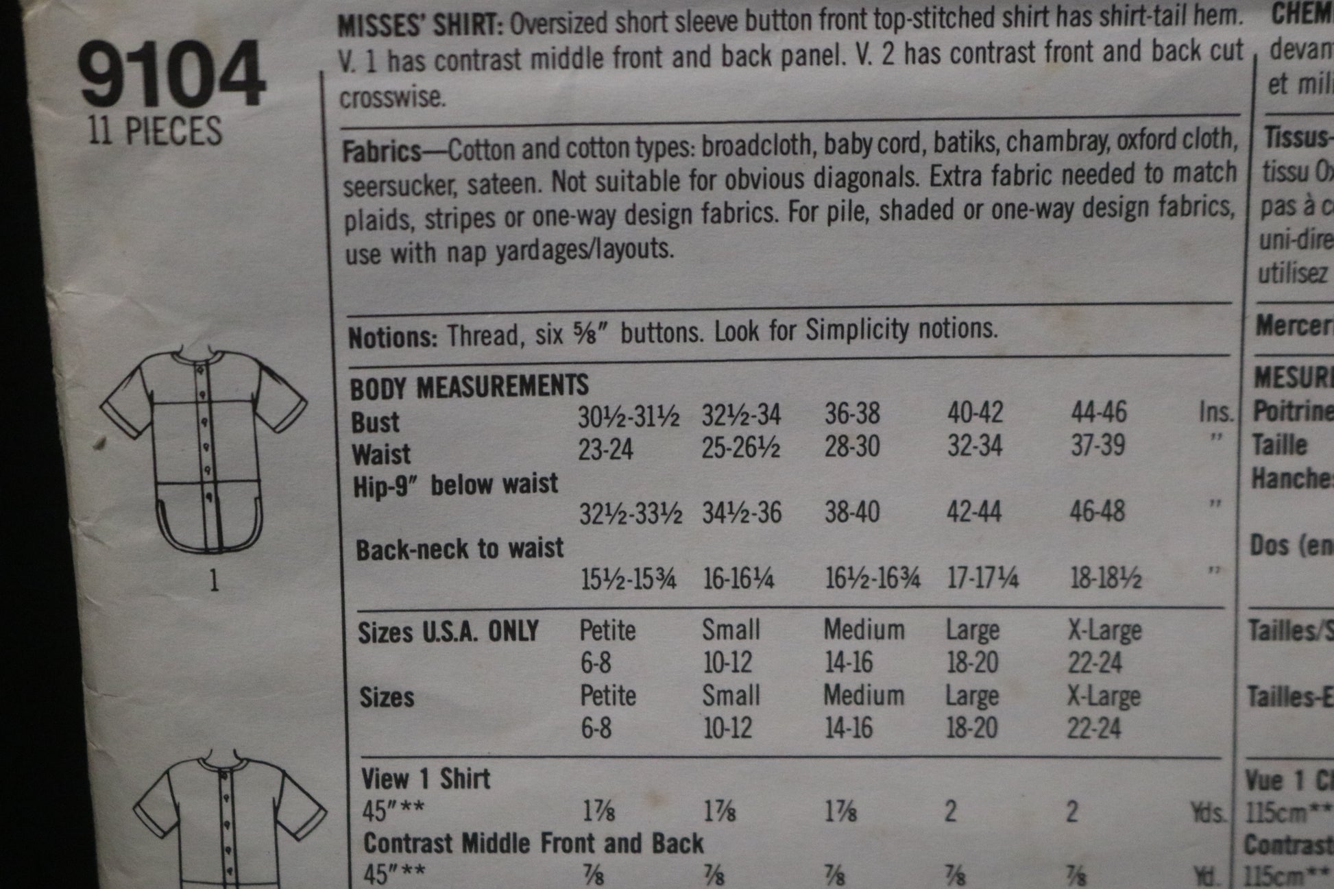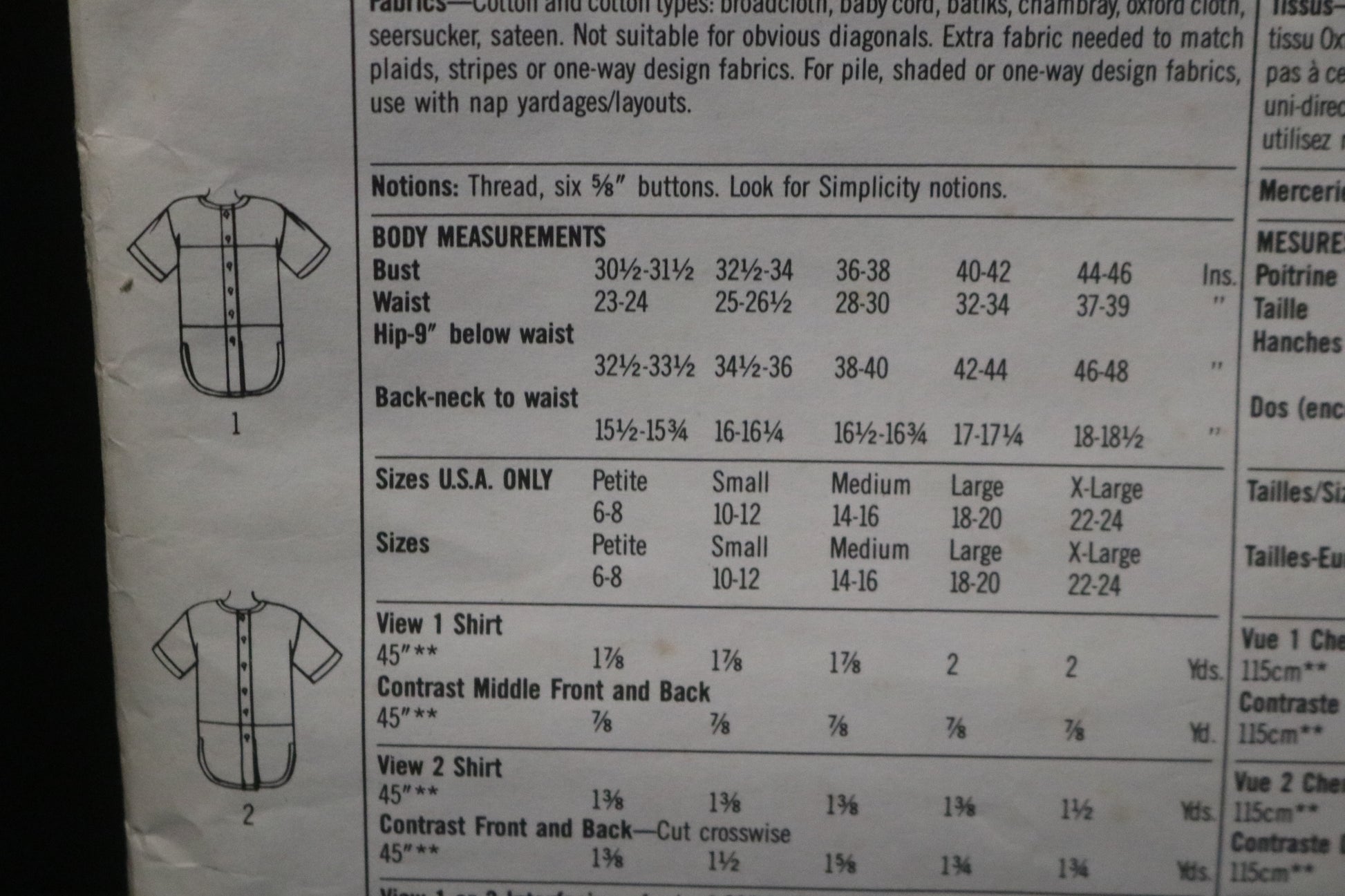 Simplicity 9104 Misses Shirt Sewing Pattern UNCUT Size Small