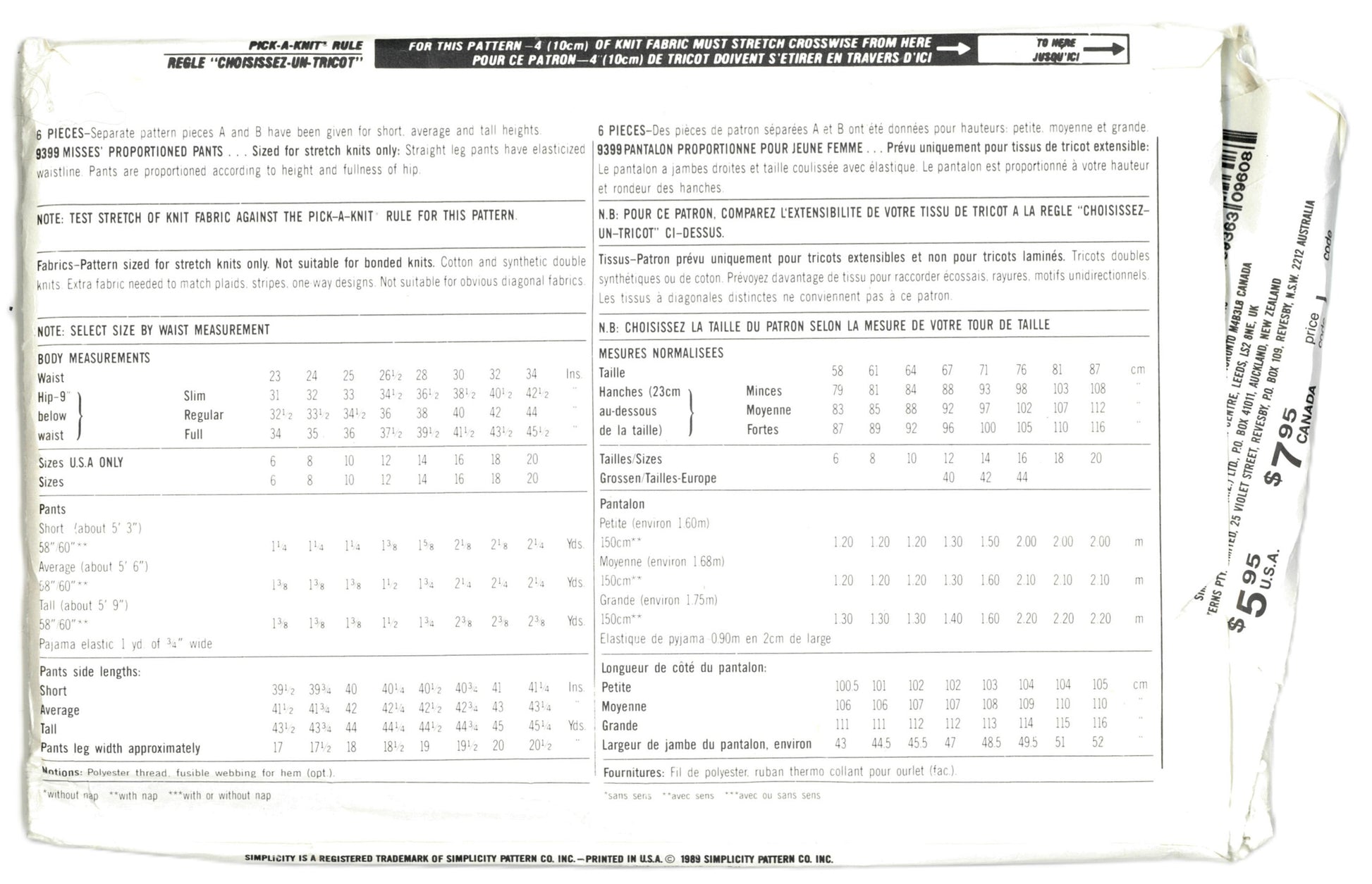 Sized for stretch knits only Straight leg pants have elasticized waistline. Pants are proportional according to height and fullness of hip.