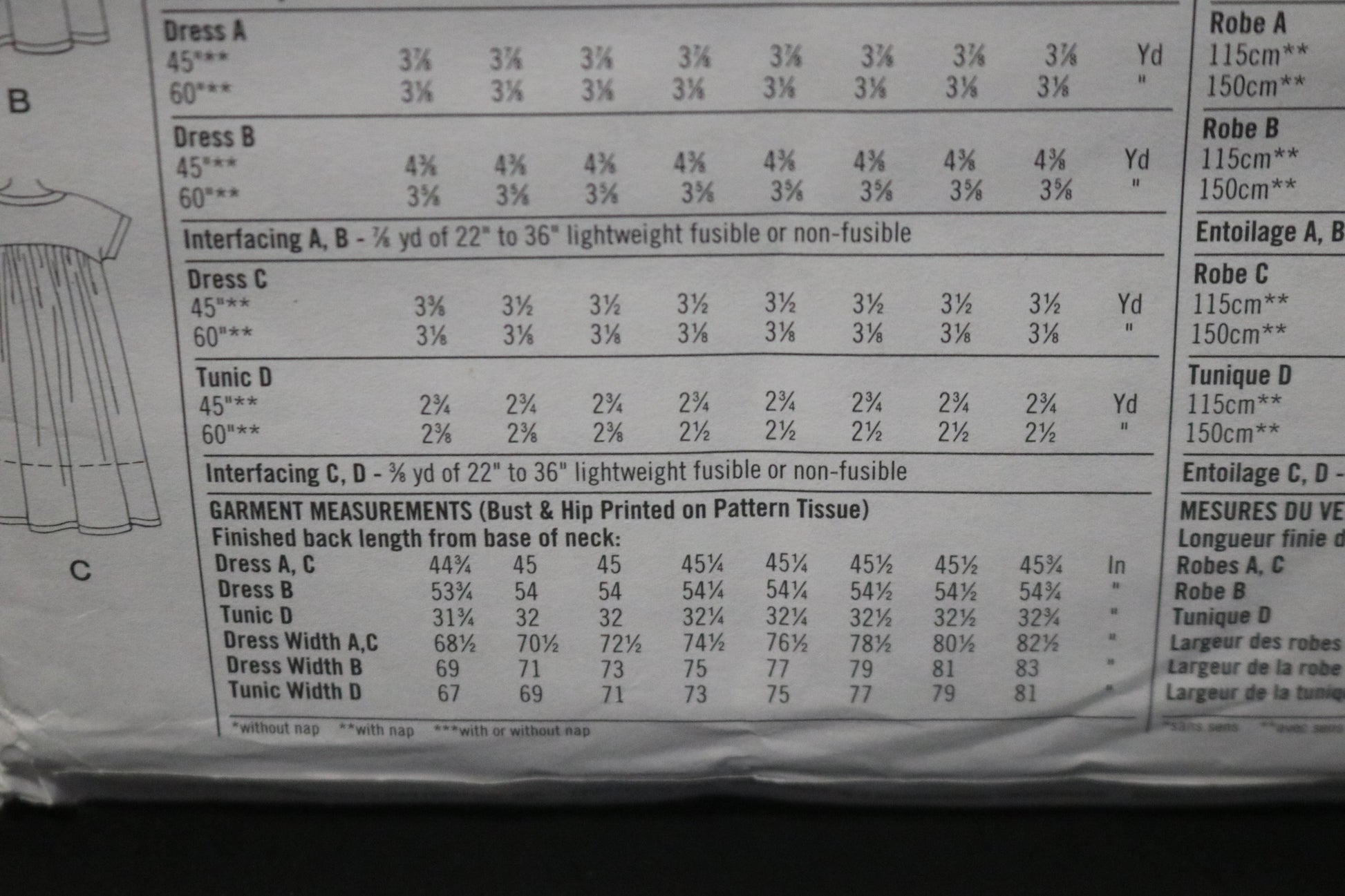 Pullover Dress A, B and C with Side Seam pockets and Tunic D with patch pockets are gathered to front and back yokes with short kimono sleeves. A and B have mock wrap V neckline and sleeves gathered to bands. C and D have round neckline. C has purchased applique. A and C are knee length. B is ankle length. D is tunic length. Pants not included.