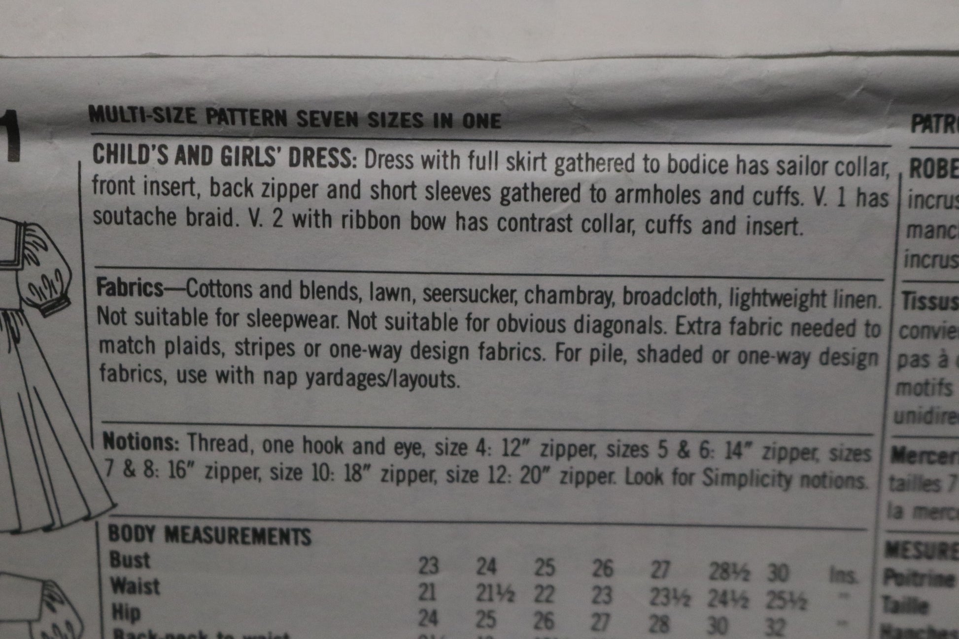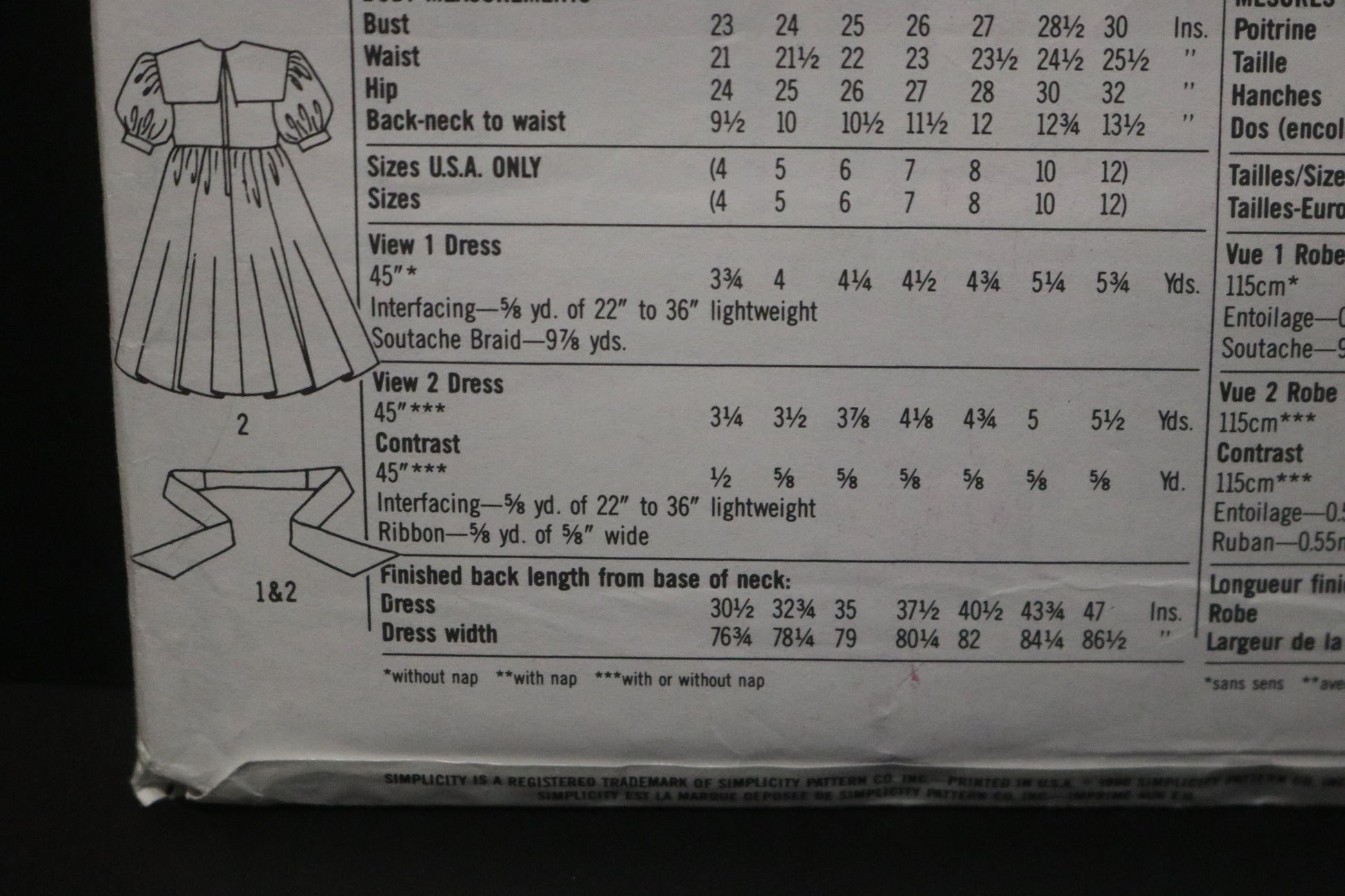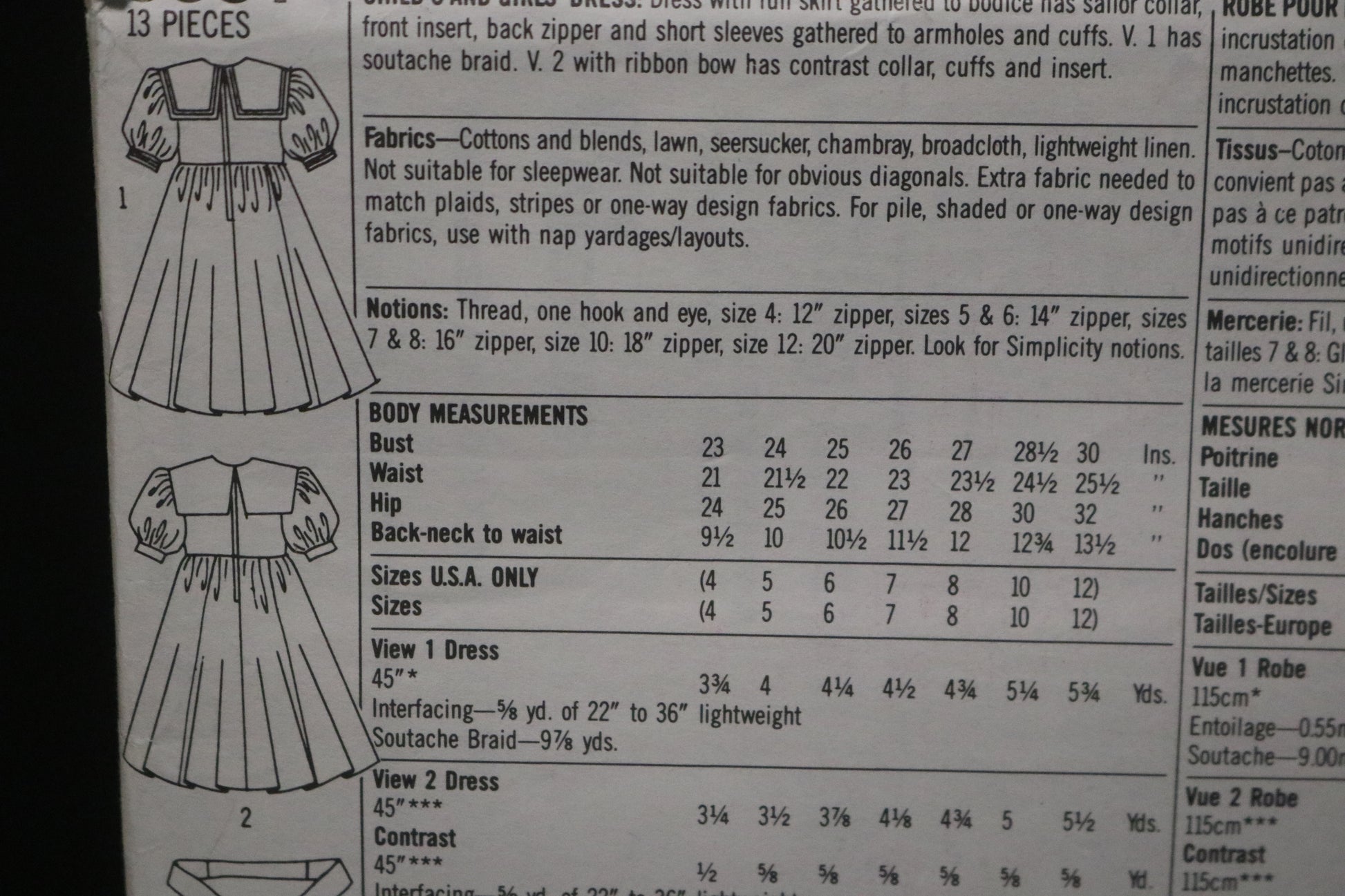 Dress with full skirt gathered to bodice has sailor collar, front inset, back zipper and short sleeves gathered to armholes and cuffs. V 1 has soutache braid. V 2 with ribbon bow has contrast collar, cuffs and inset.