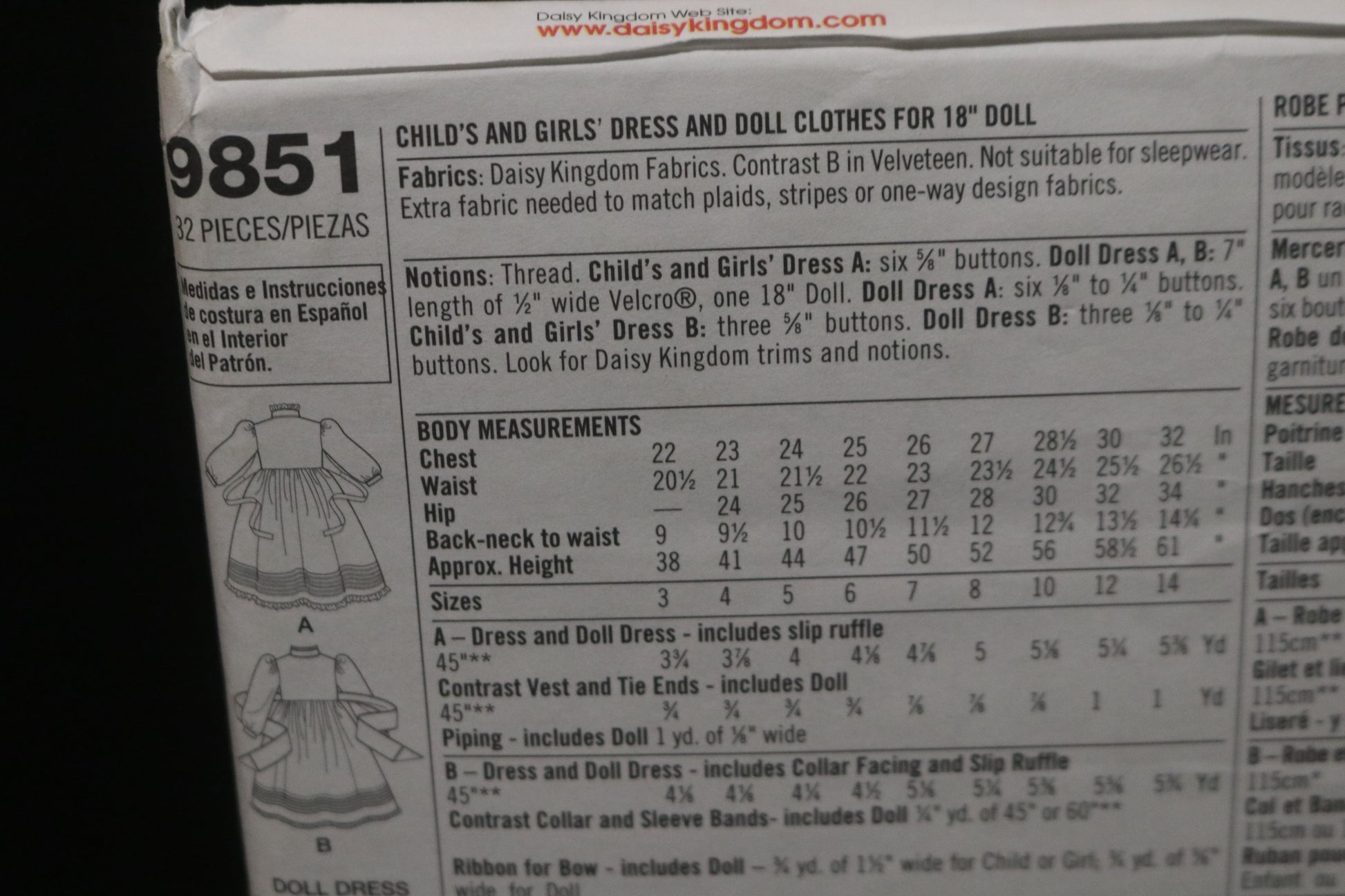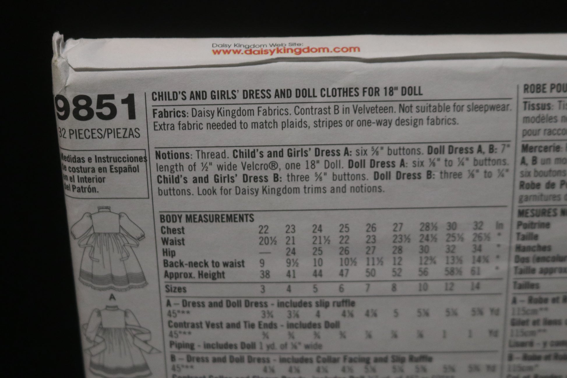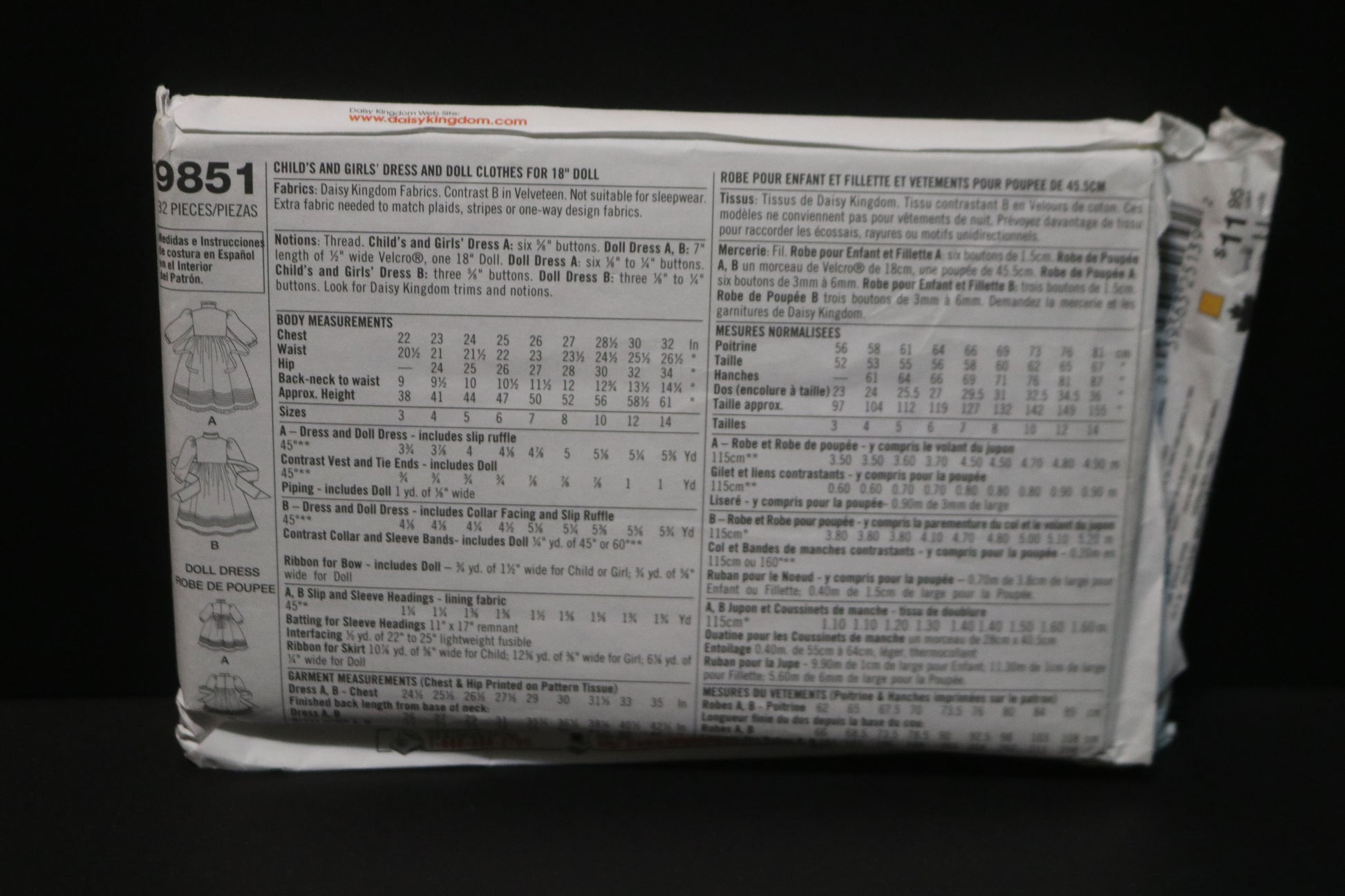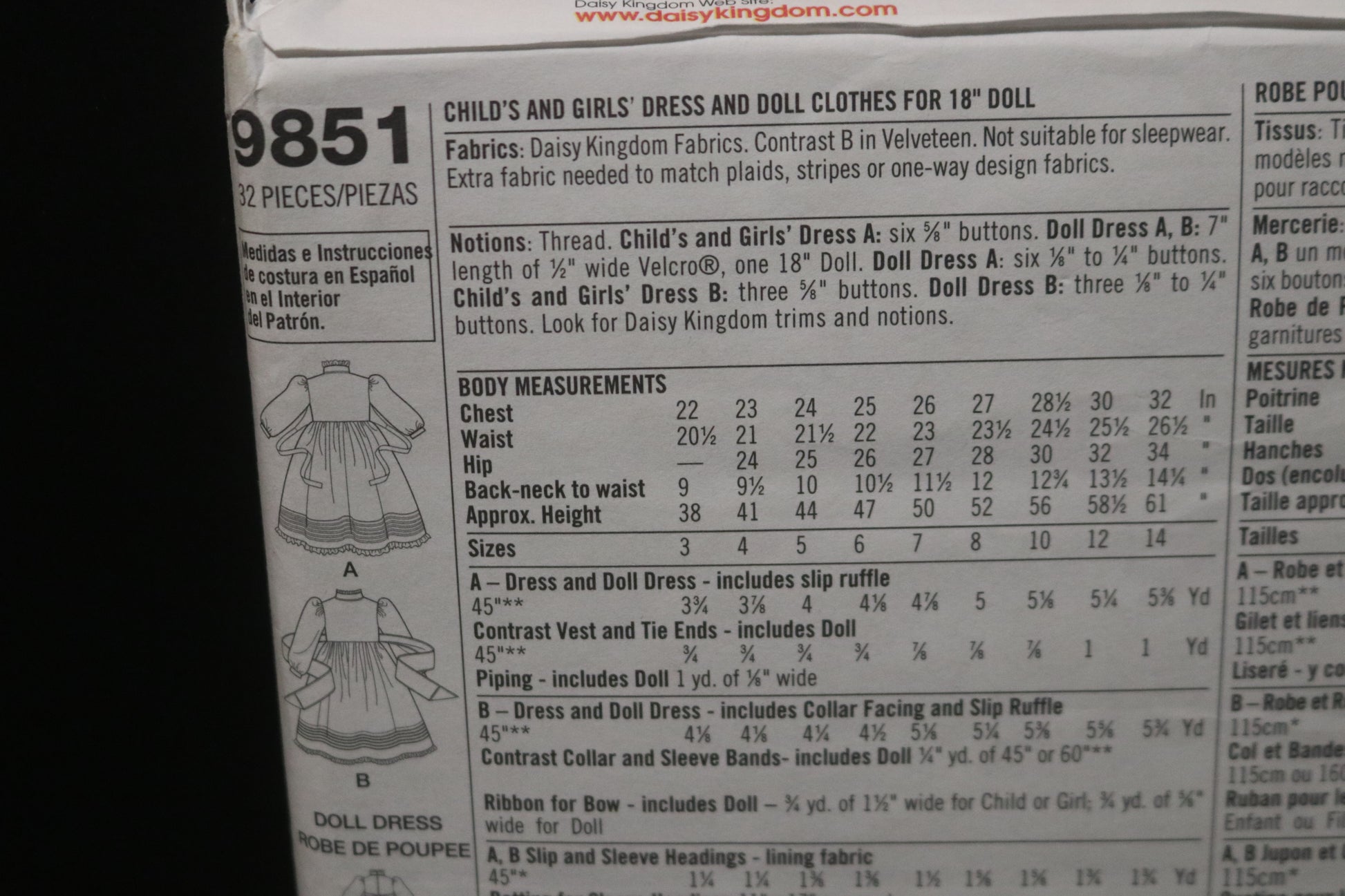 Simplicity 9851 Daisy Kingdom Girls Dress and Doll Clothes for 18" Doll Sewing Pattern - UNCUT - Size 7 8 10 12 14