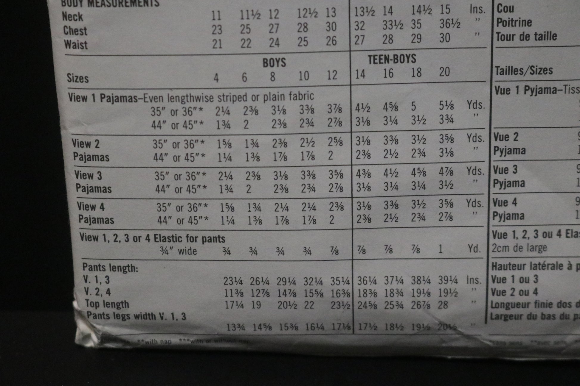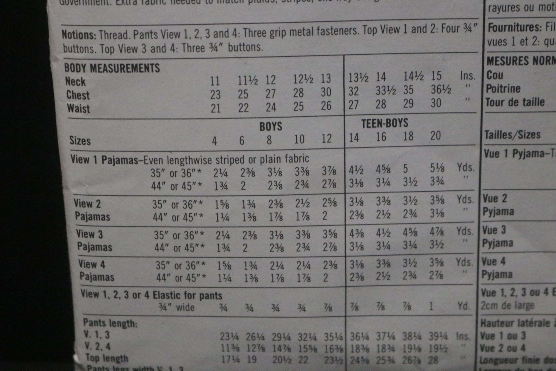 The pajama top has front button closing, set-in sleeves and patch pocket. V. 1 & 2 have notched collar. V. 1 & 3 have long sleeves. V. 2 & 4 have short sleeves. Collarless V. 3 & 4 with "V" shaped neckline have top-stitching trim. The long pants V. 1 & 3 and the short pants V. 2 & 4 with elastic waistline casing have fly front closure with snap fasteners.