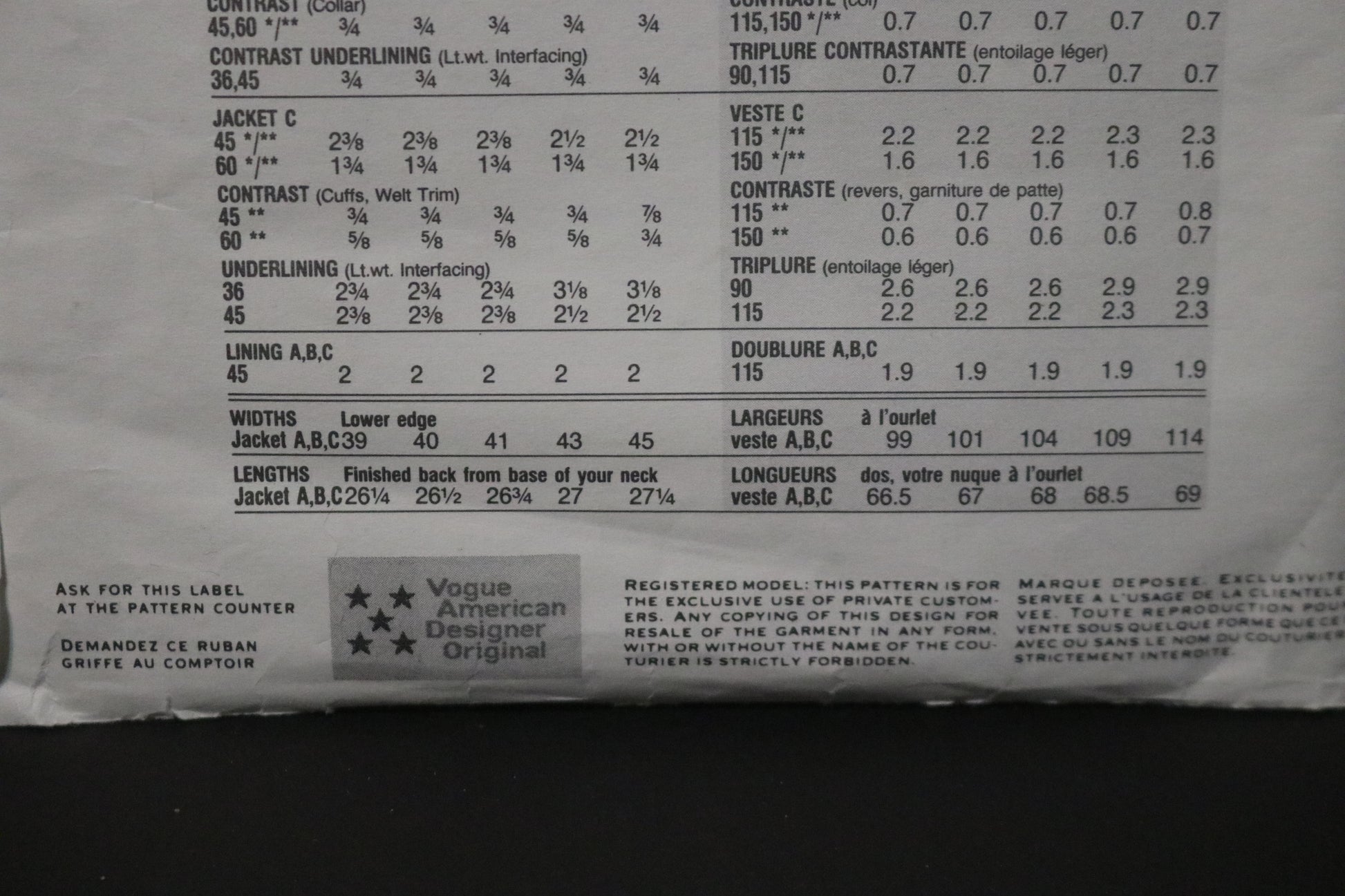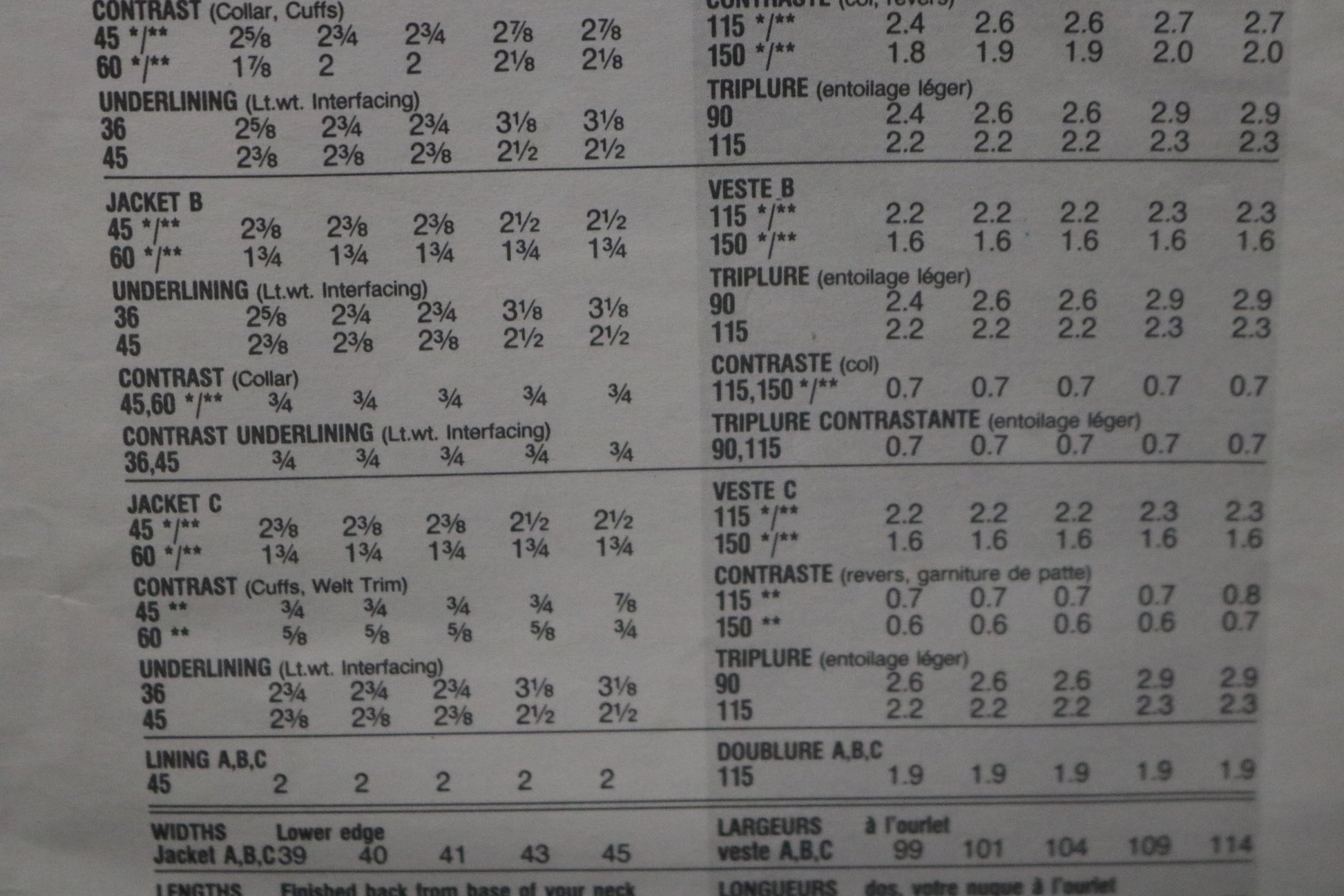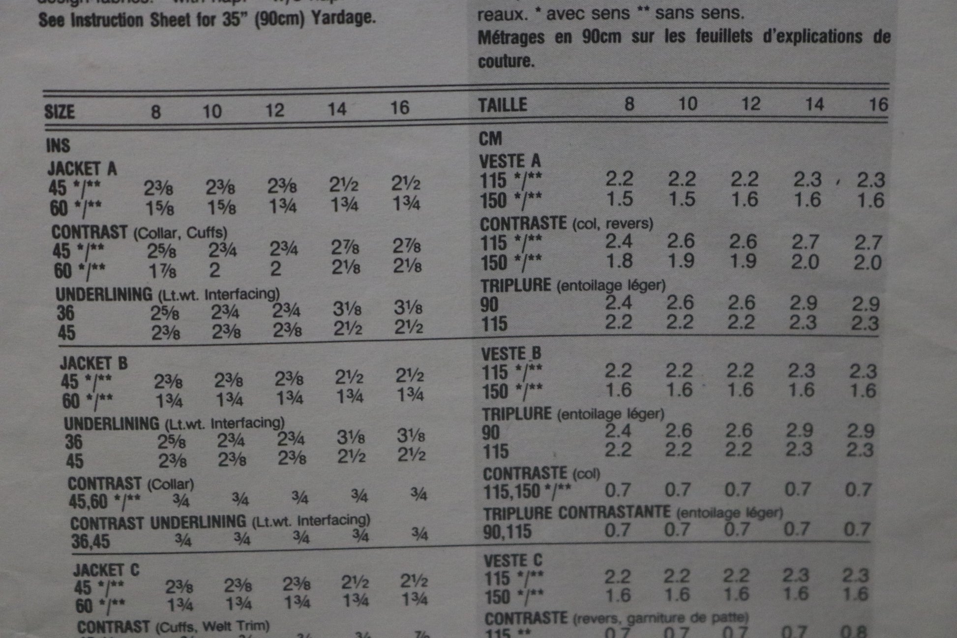 Semi-fitted, lined, below hip jacket has shoulder pads, princess seams and long, two-piece sleeves. A and B: Contrast collar variations. C: contrast hankie. A and C: contrast, bias cuffs.
