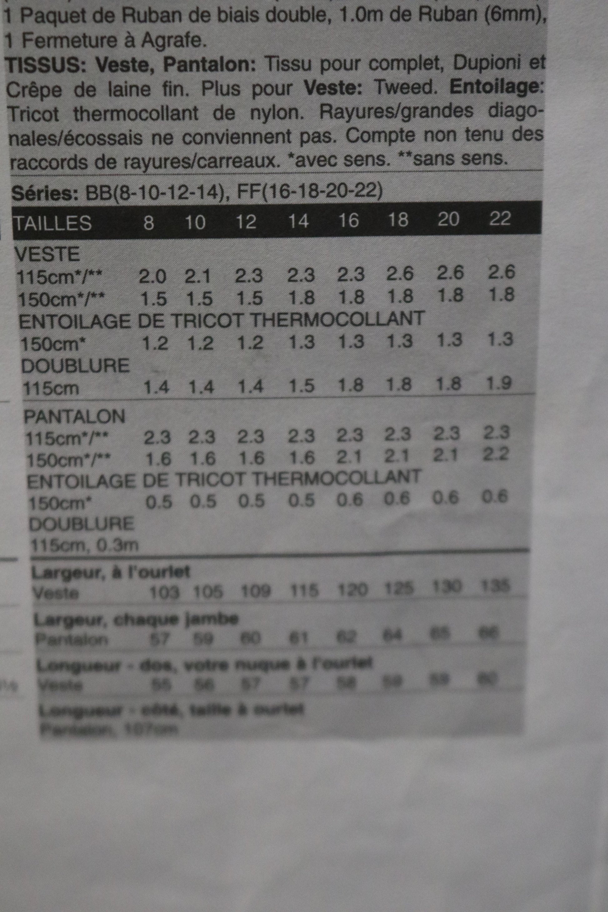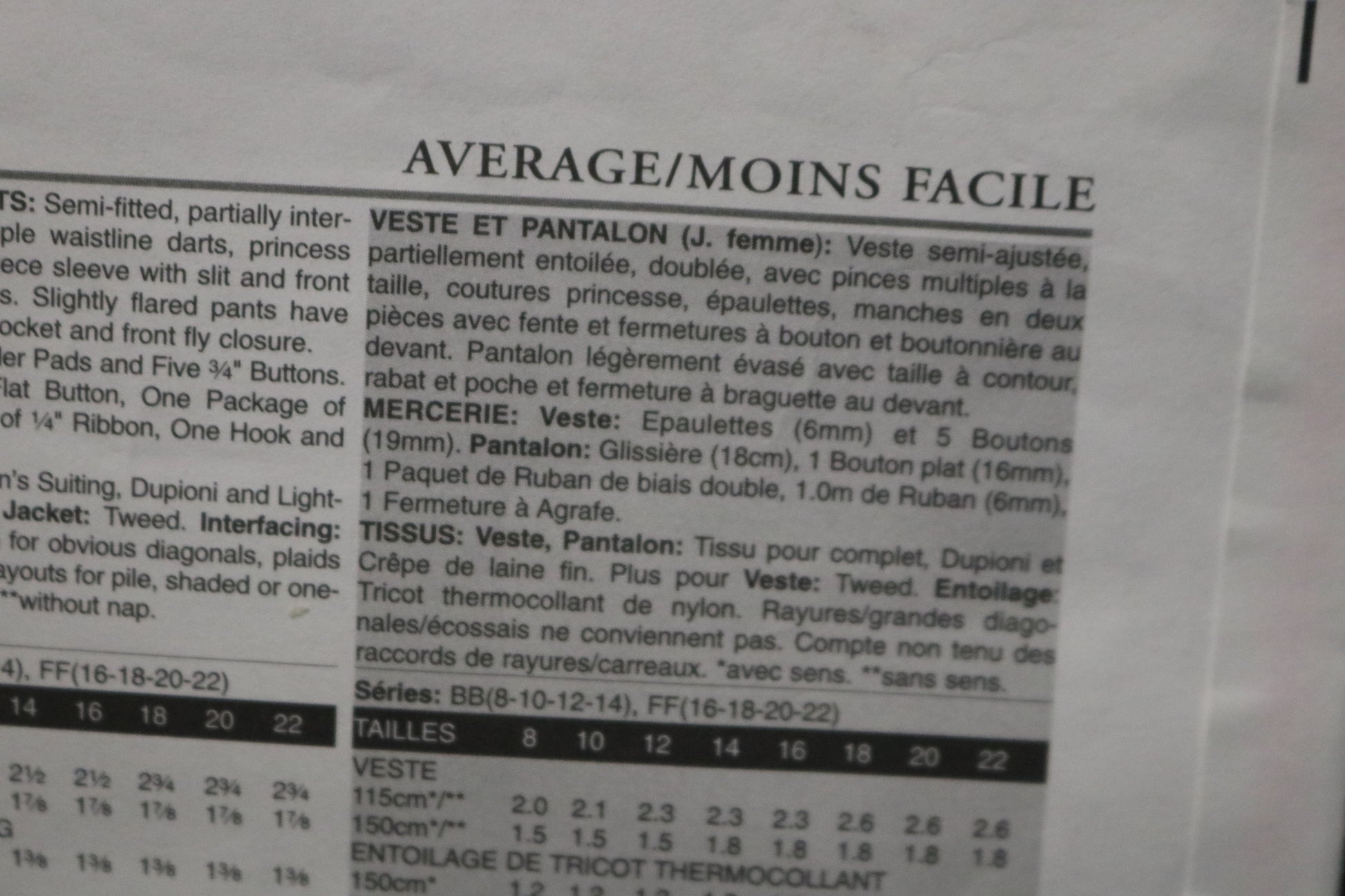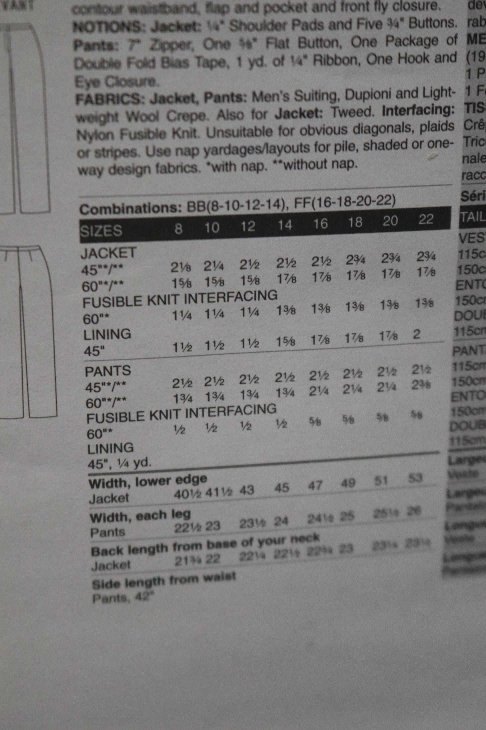 Semi fitted partially interfaced, lined jacket has multiple waistline darts, princess seams, shoulder pads, two piece sleeve with slit and front button and buttonhole closures. Slightly flared pants have contour waistband, flap and pocket and front fly closure.