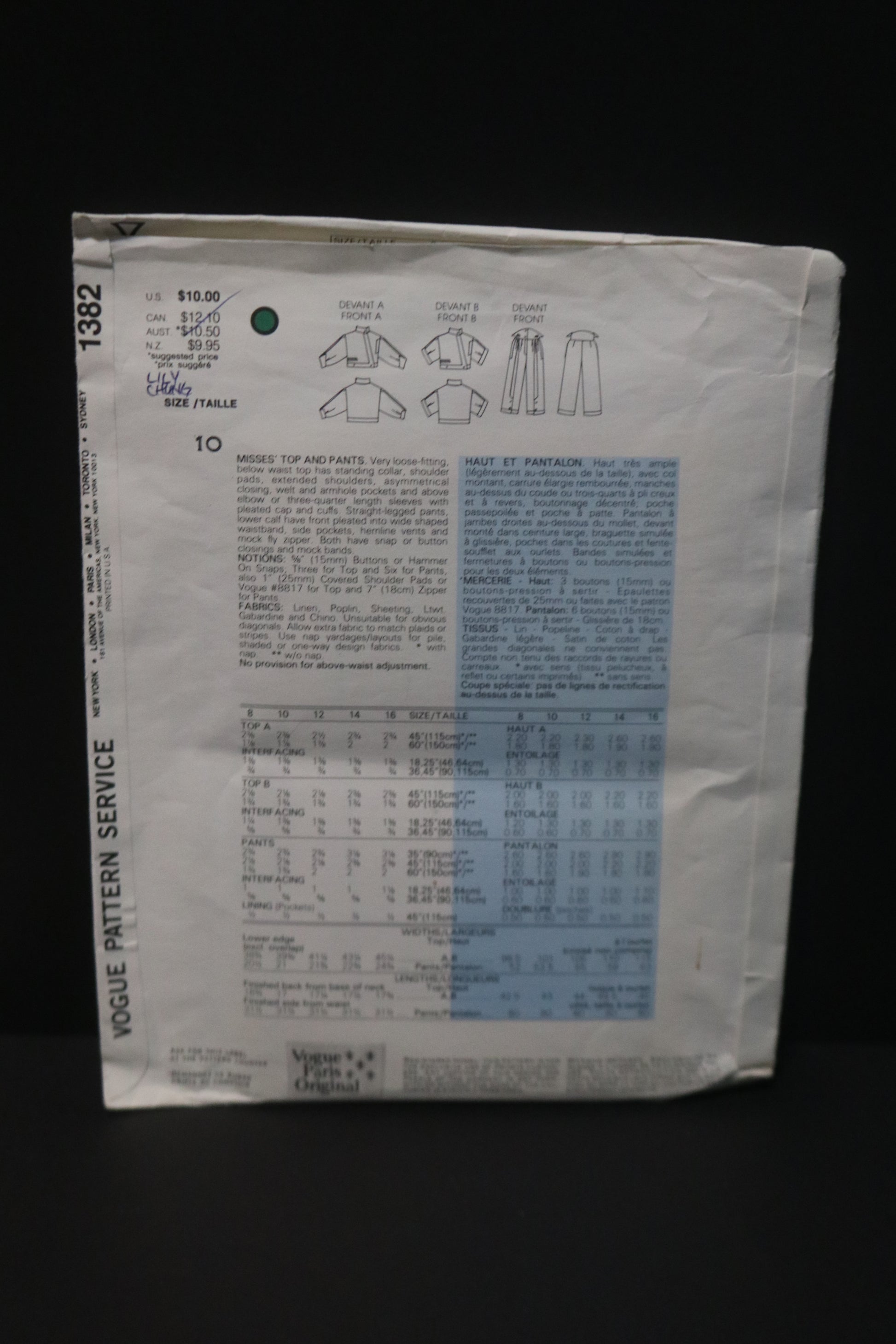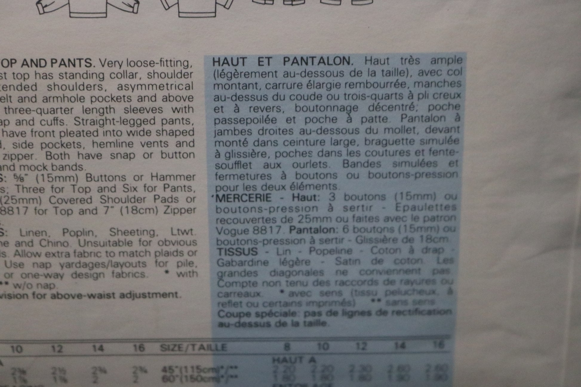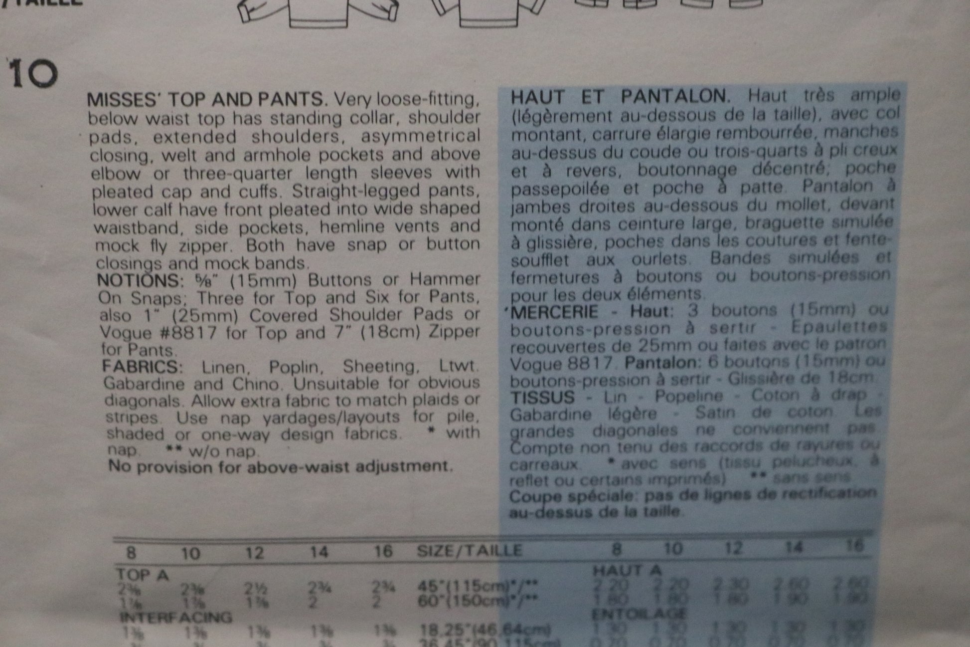 Vogue 1382 Claude Montana Misses Top and Pants Sewing Pattern - UNCUT - Size 10