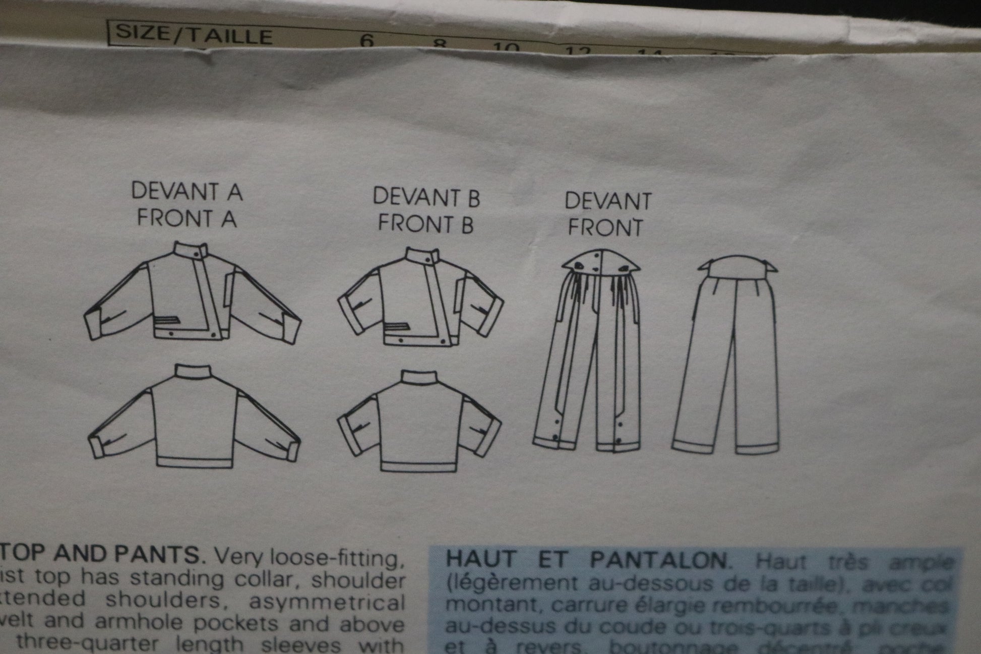 Very loose-fitting, below waist top has standing collar, shoulder pads, extended shoulders, asymmetrical closing, welt and armhole pockets and above elbow or three-quarter length sleeves with pleated cap and cuffs. Straight-legged pants, lower calf have front pleated into wide shaped waistband, side pockets, hemline vents and mock fly zipper. Both have snap or button closings and mock bands.