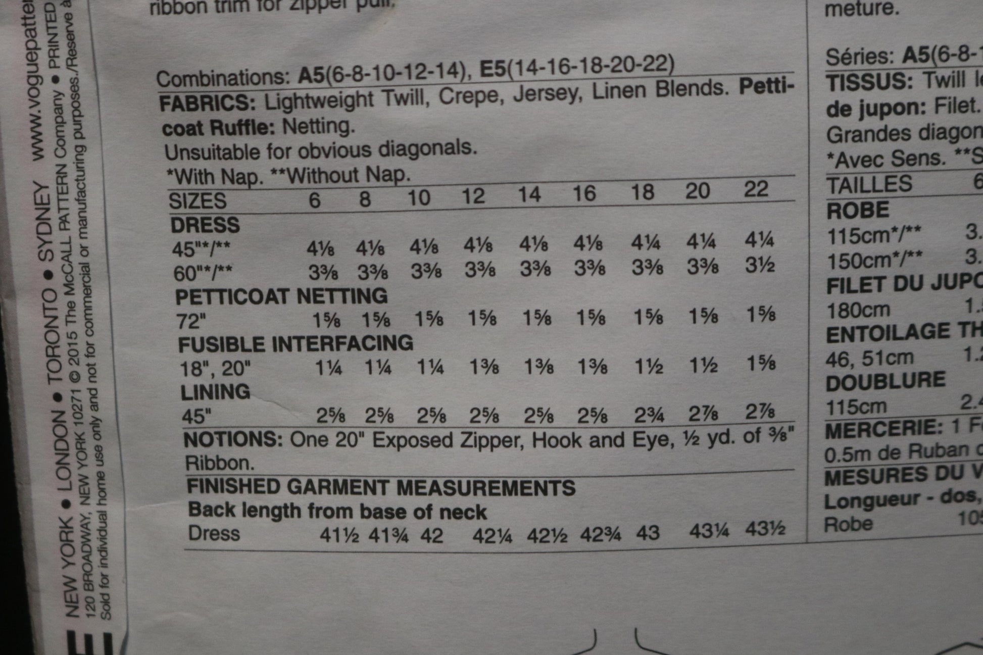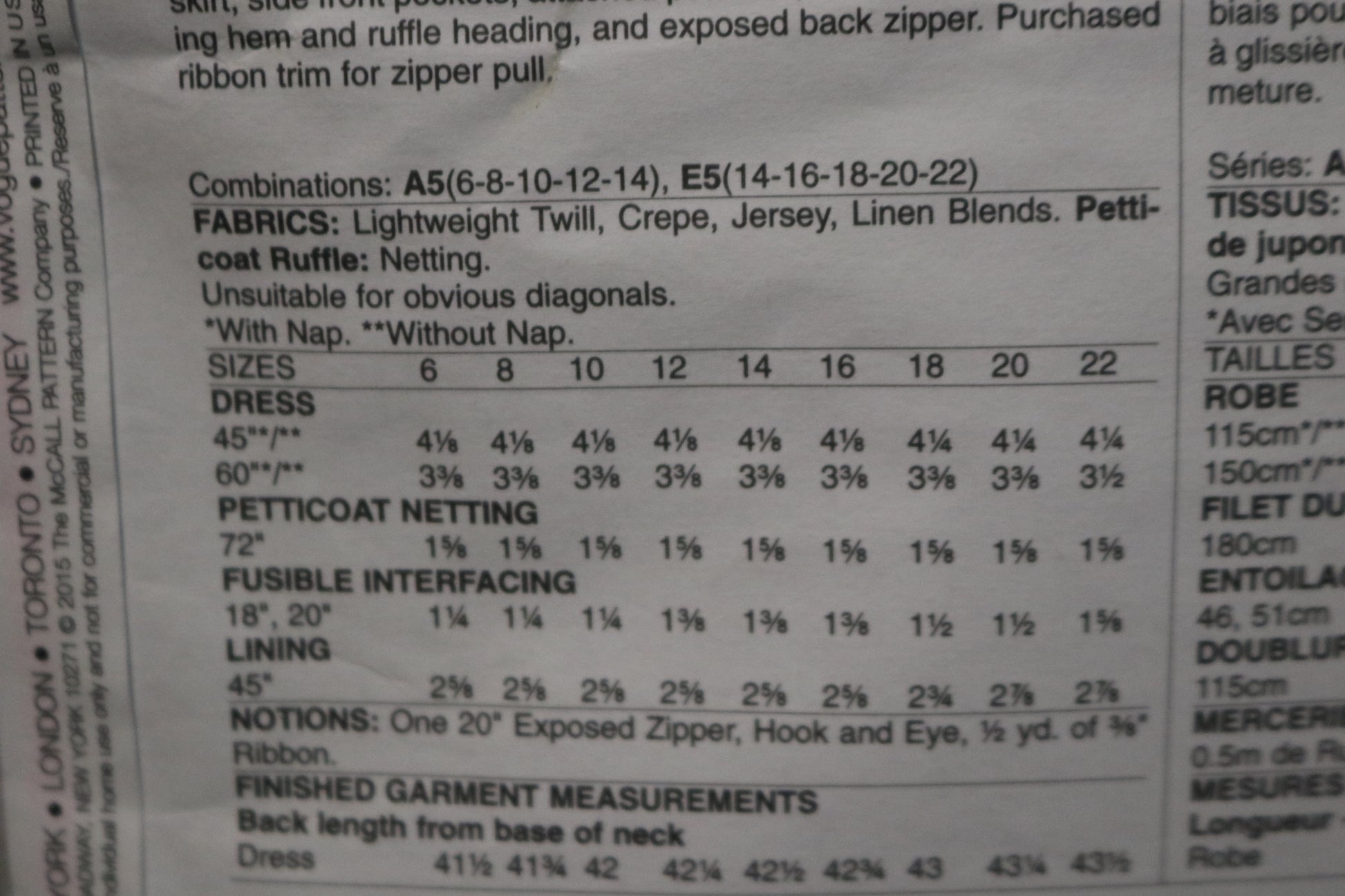 Lined dress has side front and side back seams, close-fitting bodice, pleated and gathered skirt, side front pockets, attached petticoat, self bias binding finishing hem and ruffle heading, and exposed back zipper. Purchased ribbon trim for zipper pull. FABRICS: Lightweight Twill, Crepe, Jersey, Linen Blends. Petticoat Ruffle: Netting.