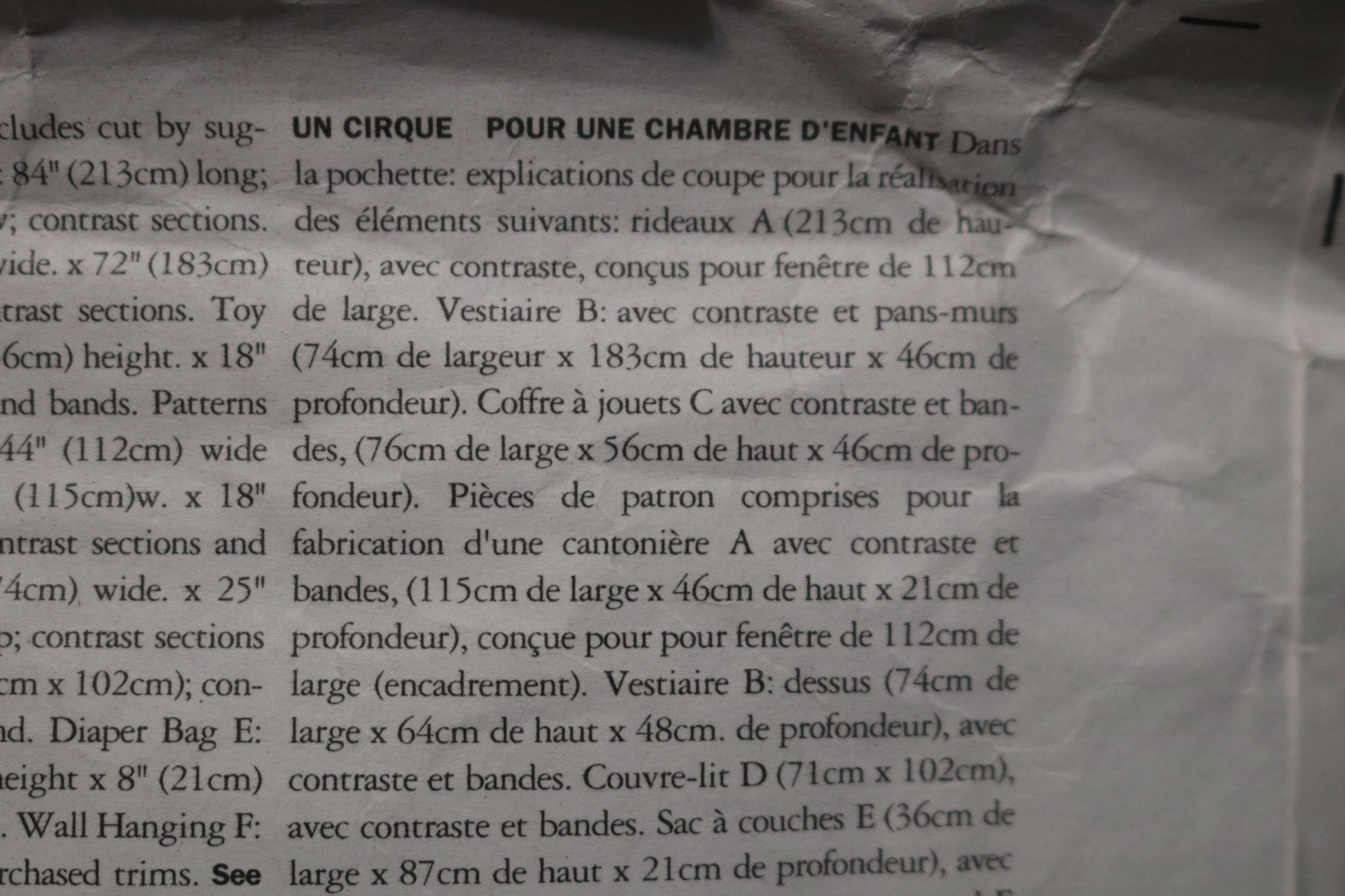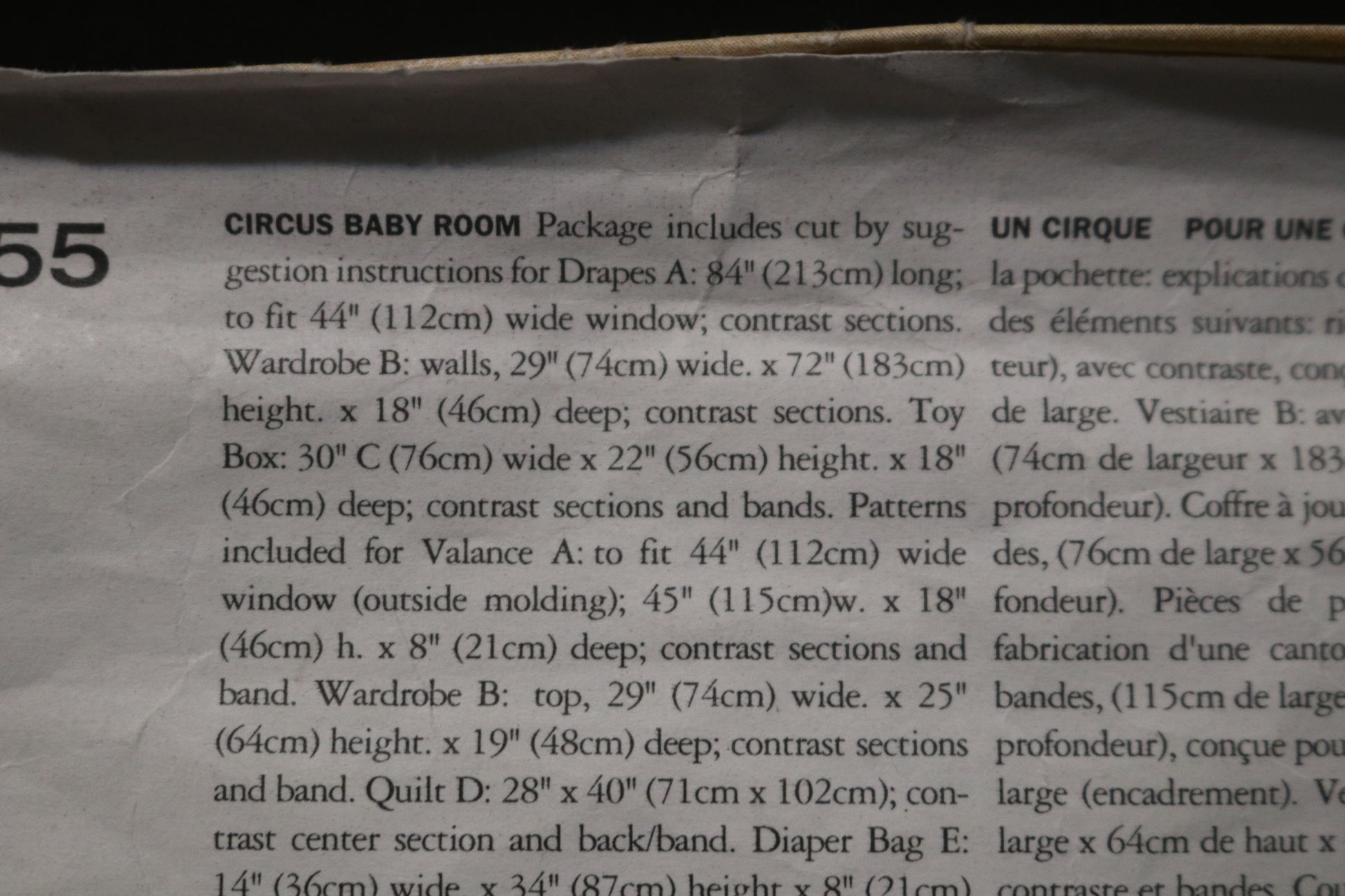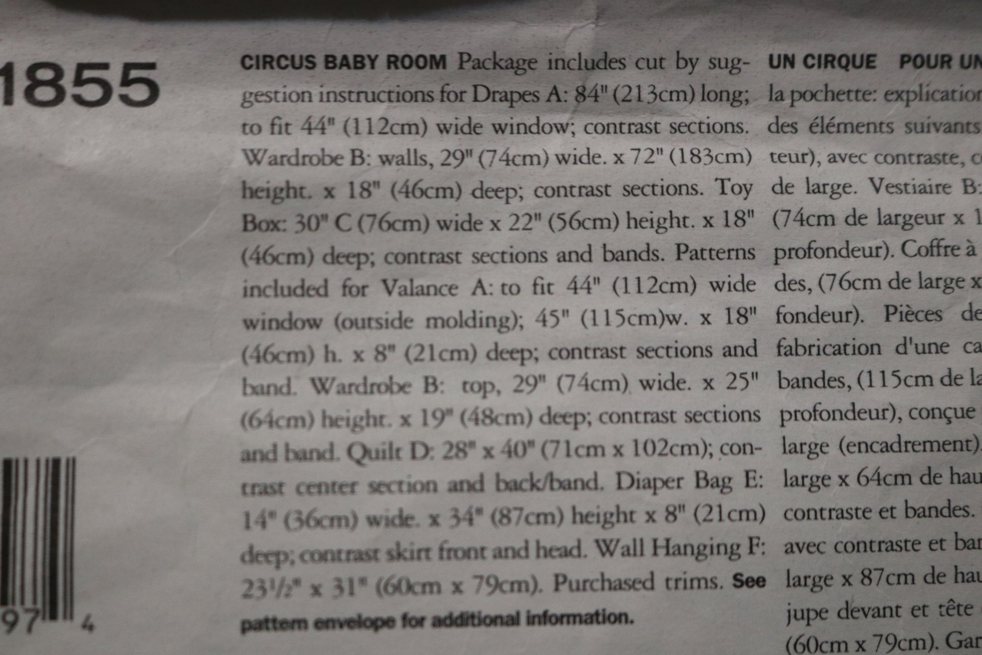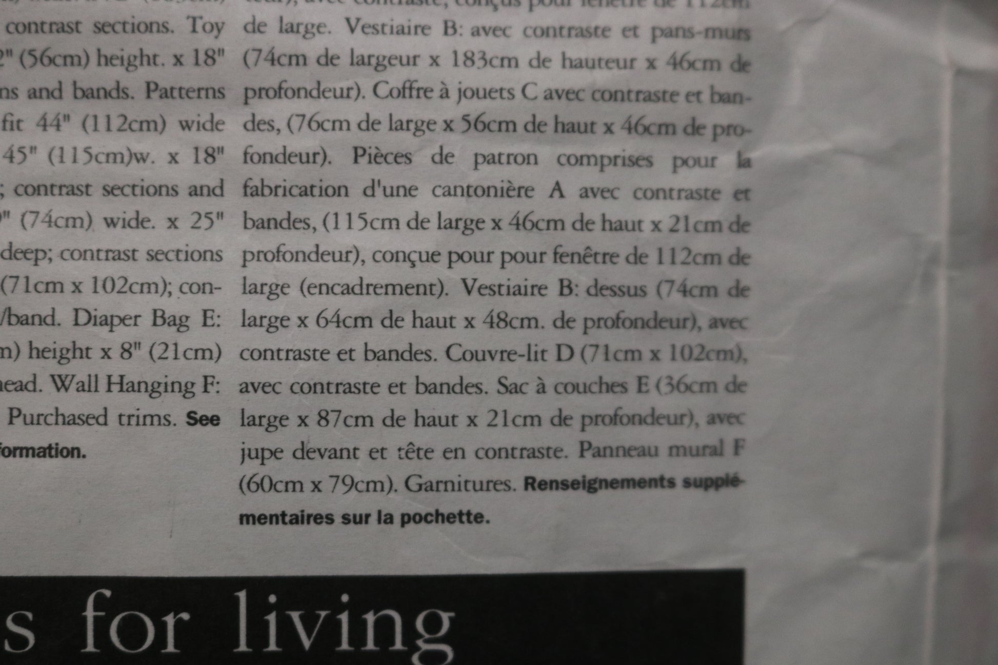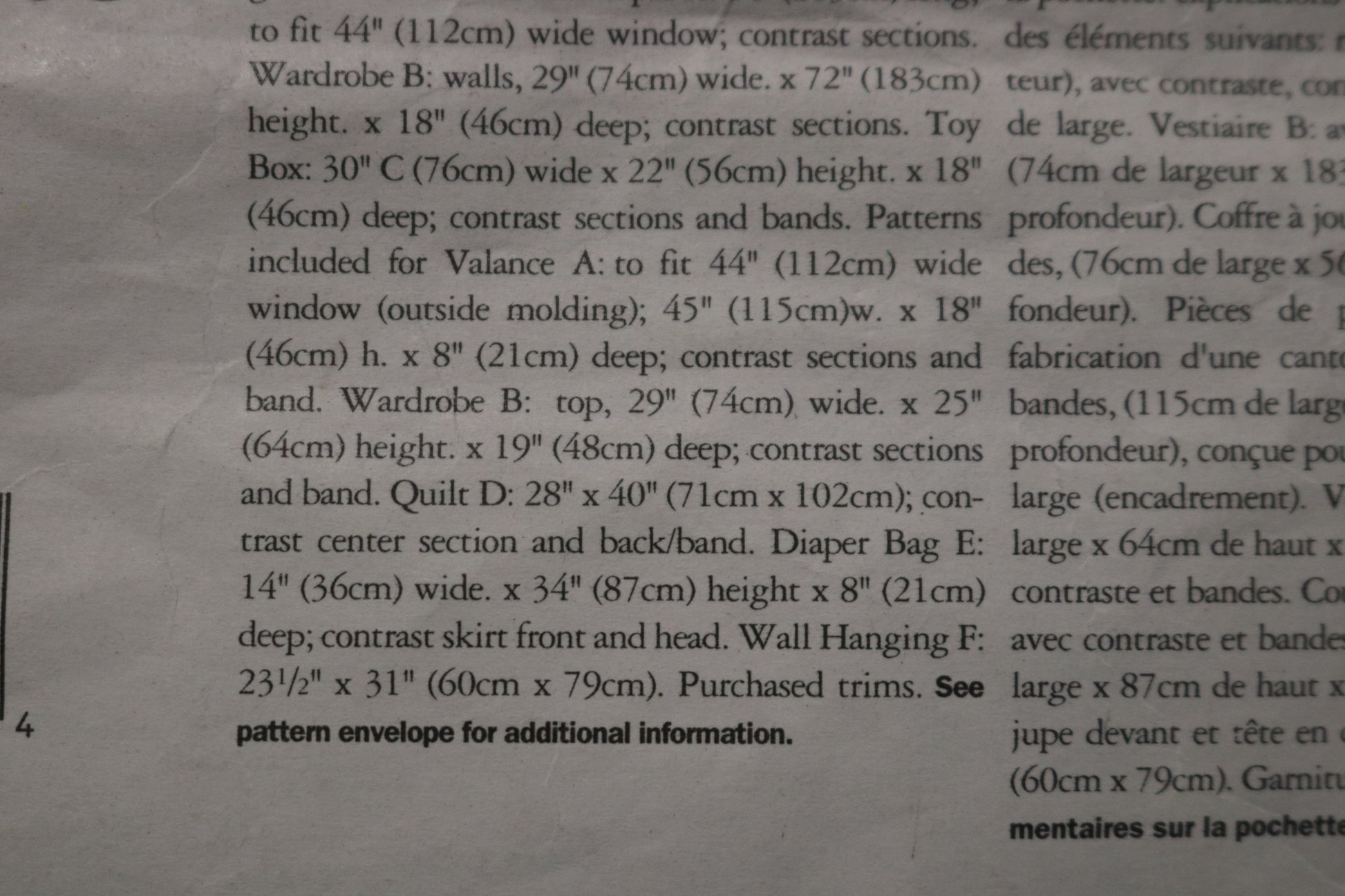 Package includes cut by suggestion instructions for Drapes A: 84"(21cm.5cm( long; to fit 44: (112cm) wide window, contrast sections Wardrobe B; walls 29"(74cm)wide x 72" (183cm) height X 18" (46cm) deep, contrast sections. Toy box. 30"C(76cm) wide x 22"(56cm) height x 18" (46cm) deep: contrast sections and bands. Patterns included for Valance A; to fit 44" (112cm) wide window (outside moldings); 45"h x 8"(21cm) deep; contrast sections and band. Wardrobe B: top 29" (74cm) wide x 25" (64cm) height x 19" (48cm) deep; contrast sections and band. Quilt D 28" x 40" (71cm x 102cm); contrast center section and back/band. Diaper Bag E; 14" (36cm) wide x 34" (87cm) height x 8" (21cm) deep; contrast skirt front and head. Wall Hanging F: 23 1/2" x 31" (60cm x 79cm) purchased trims.