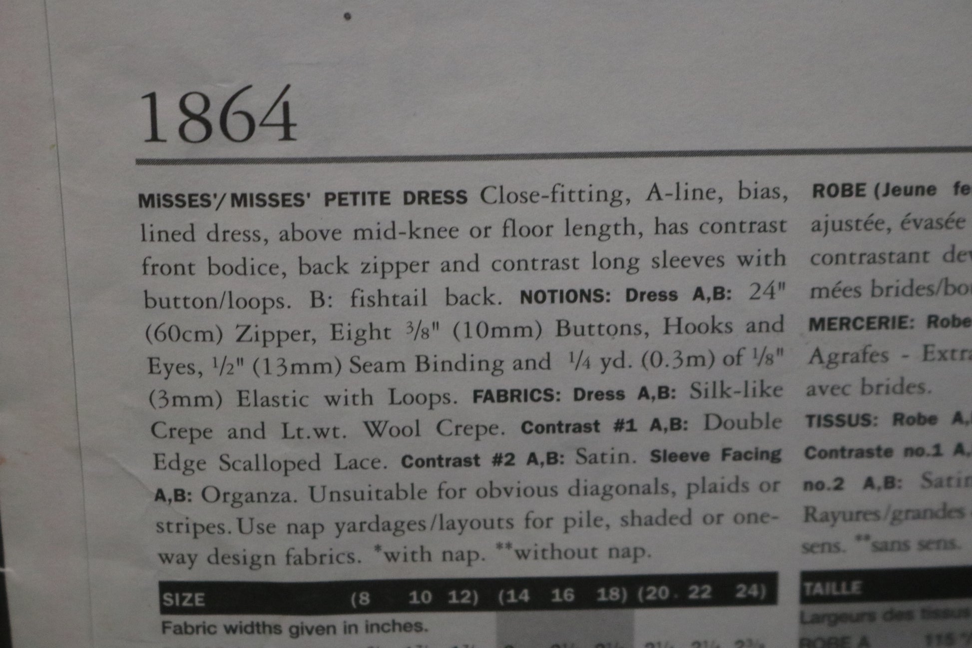 Close-fitting, A-line, bias, lined dress, above mid-knee or floor length, has contrast front bodice, back zipper and contrast long sleeves with button/loops. B: fishtail back.